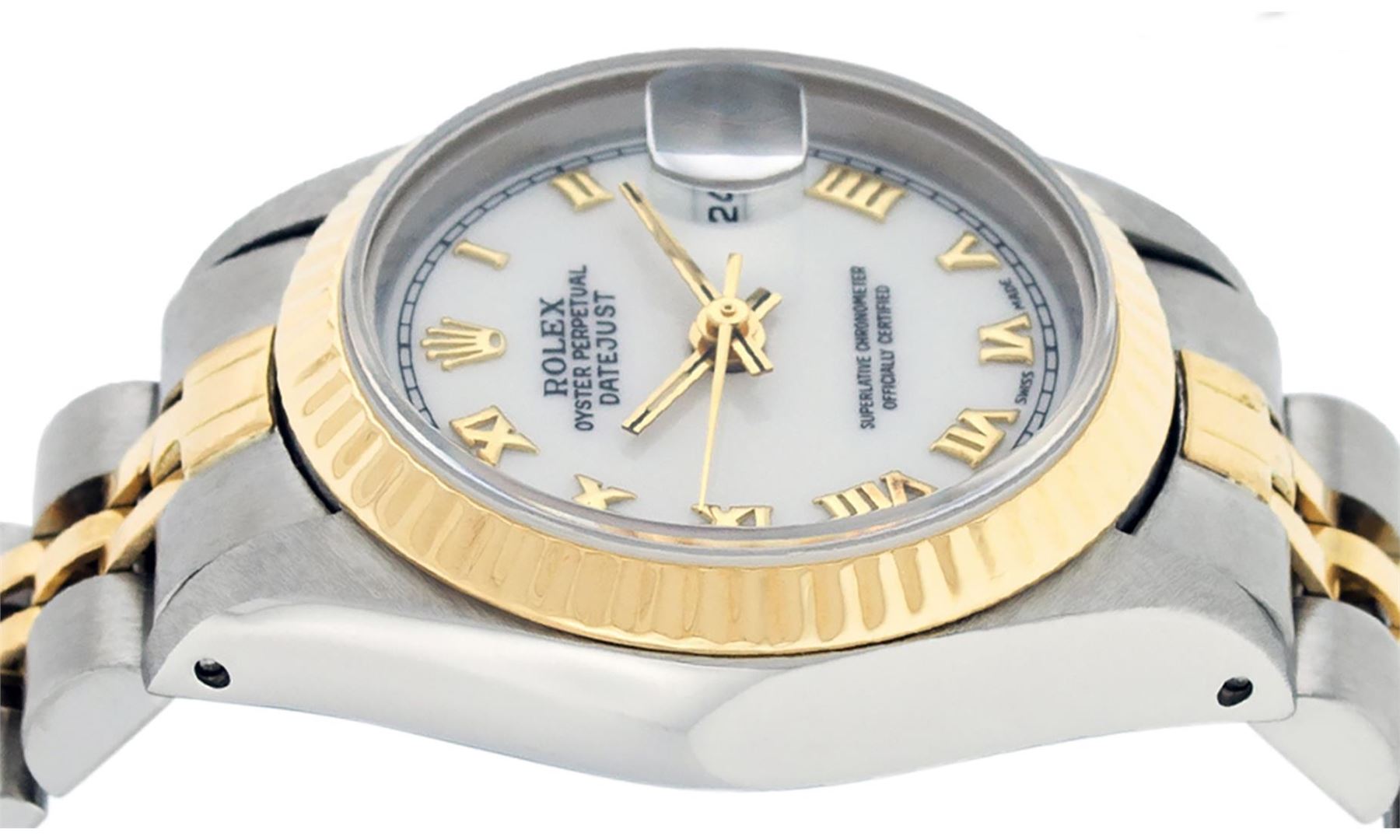One Ladies Pre Owned Two Tone Yellow Gold & Stainless Rolex Polished, Serviced & Electronically Tested, Rolex Yellow Gold & Stainless Steel, Rolex Case Size: 26mm, Rolex Yellow Gold Crown, Rolex Bezel: Yellow Gold Fluted Bezel. Crystal: Plexiglass With Magnified Date Window. Custom Hands: New Luminescent Hands. Rolex Movement: Automatic Winding Movement 2030. Rolex Dial: White Roman Dial With Square Track. Date Window: 3 O'Clock Position Date Display, Model: Datejust. Condition: G-6 Extra Fine. Rolex Bracelet: Two Tone Yellow Gold & Stainless Steel Jubilee Band. Bright Polish. 6.0 Inch Length, Adjustable. Standard Clasp, With Rolex Logo. This Watch Has Been Serviced Time Tested And Is In Excellent Condition It Is Free Of All Scratches And Dents.