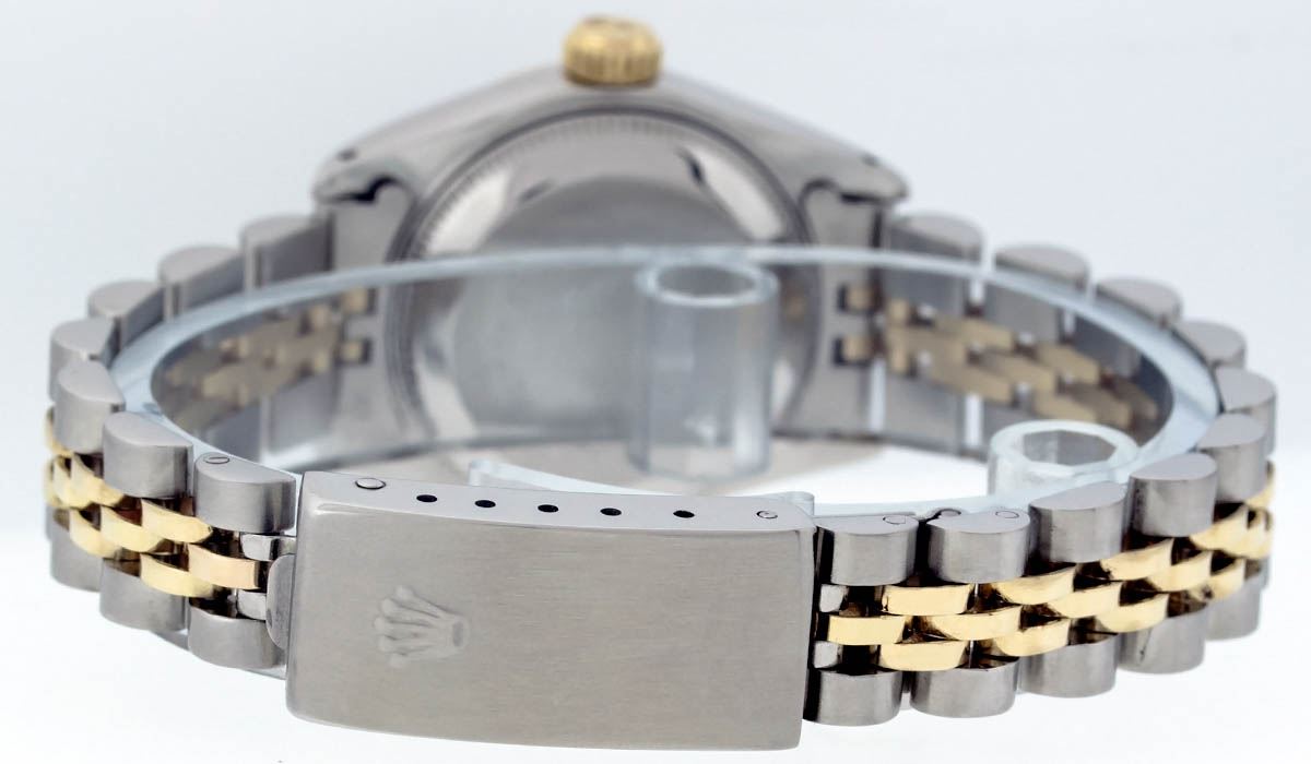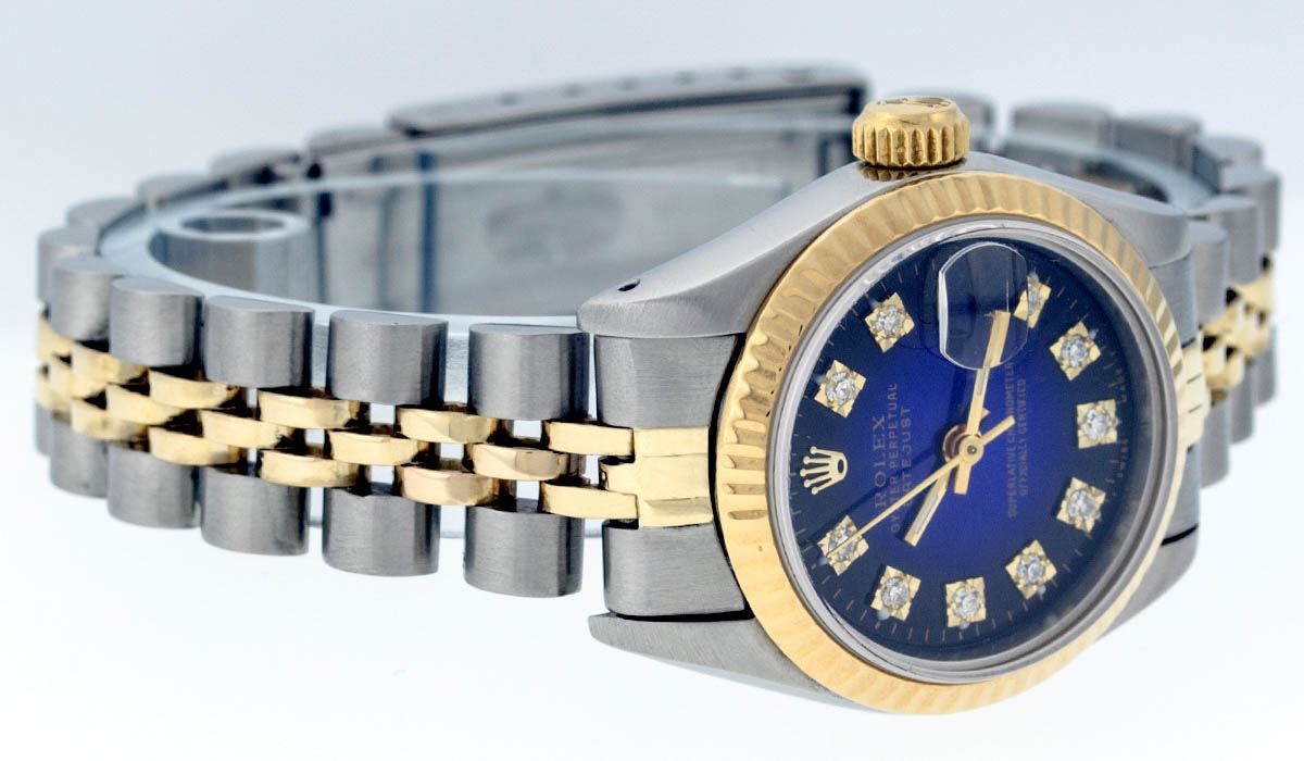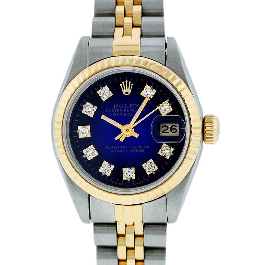 One Ladies Two Tone Rolex Datejust Polished, Serviced & Electronically Tested, 14K Yellow Gold & Stainless Steel Case:26mm, 14K Yellow Gold Crown, Bezel: 14K Yellow Gold Fluted Bezel. Custom Crystal: Acrylic Cyclops Lens. Movement: Automatic Winding Movement Caliber 2030. Custom Dial: Blue Vignette With VS Diamond Hour Markers, Diamond Count: 10 Diamonds In Dial, Color: G to H, Clarity: VS. Date Window: 3 O'Clock Position Date Display, Model: Datejust, Condition: G-6 Extra Fine. Bracelet: Two Tone 14K Yellow Gold & Stainless Steel Jubilee. Bright Polish. 5.5 Inch Length, Adjustable. Standard Clasp, With Rolex Logo. Watch Has Been Serviced And Polished It Is Free Of All Scratches And Dents.