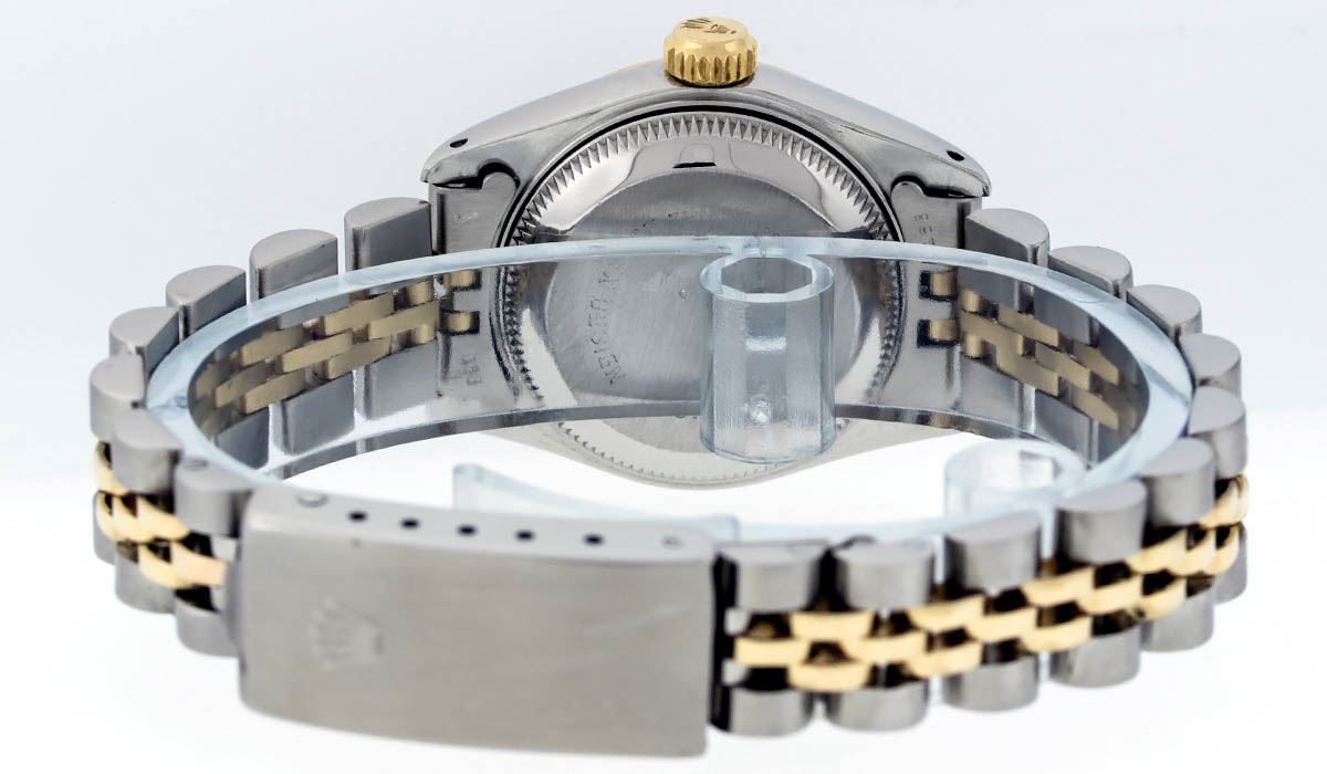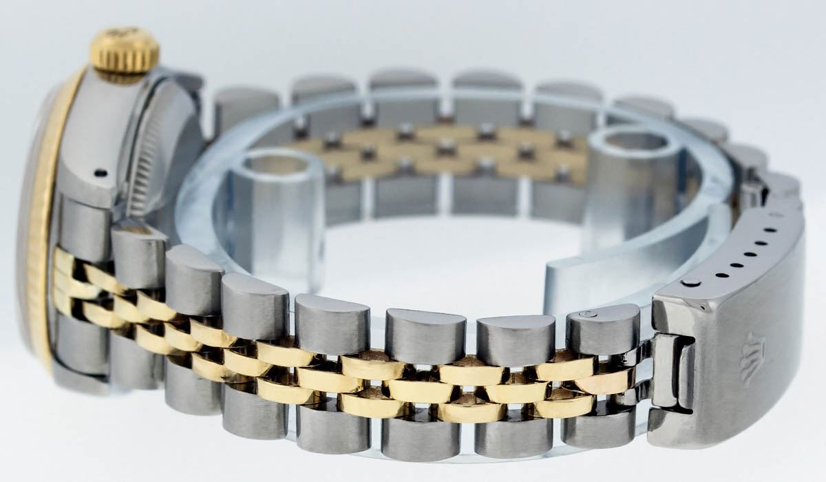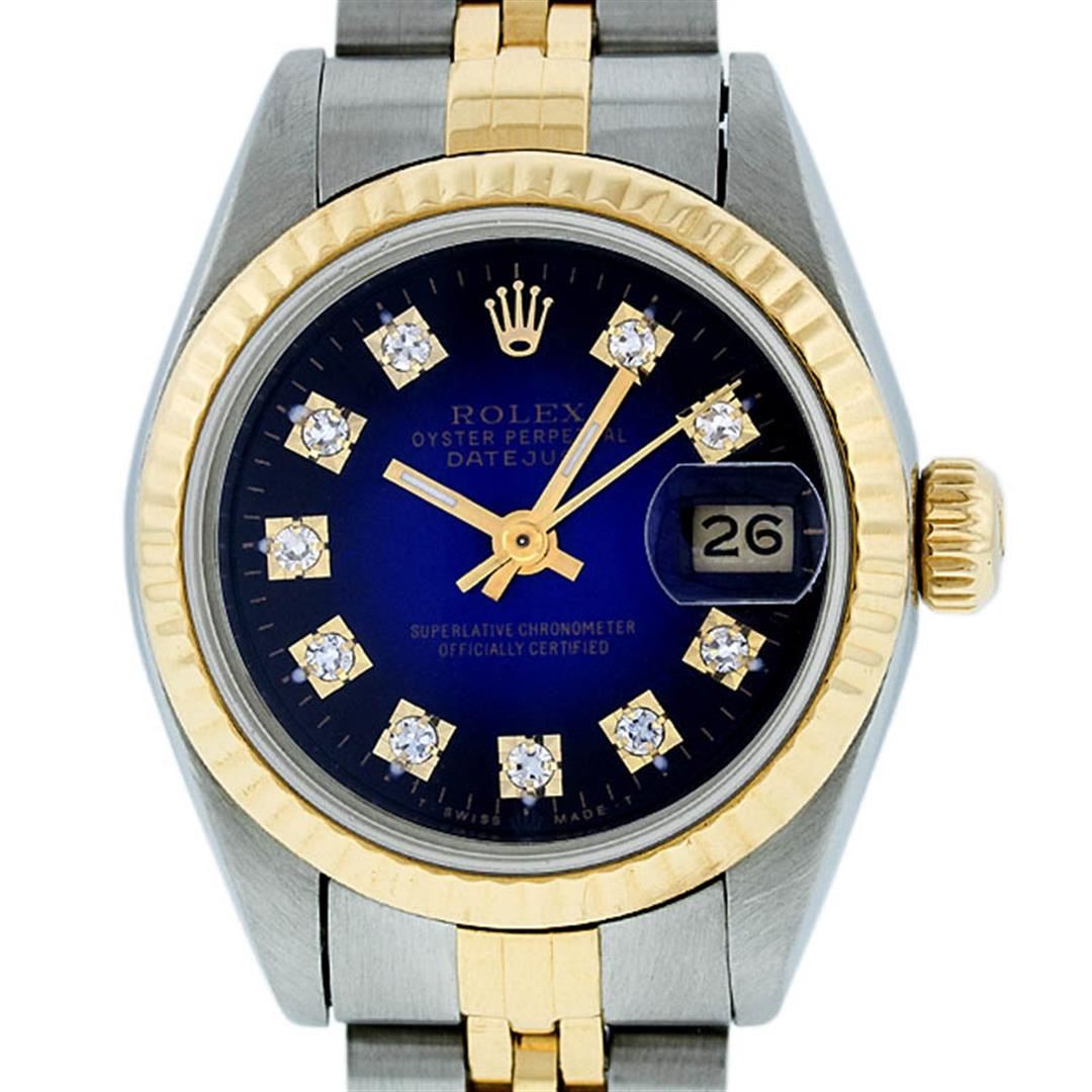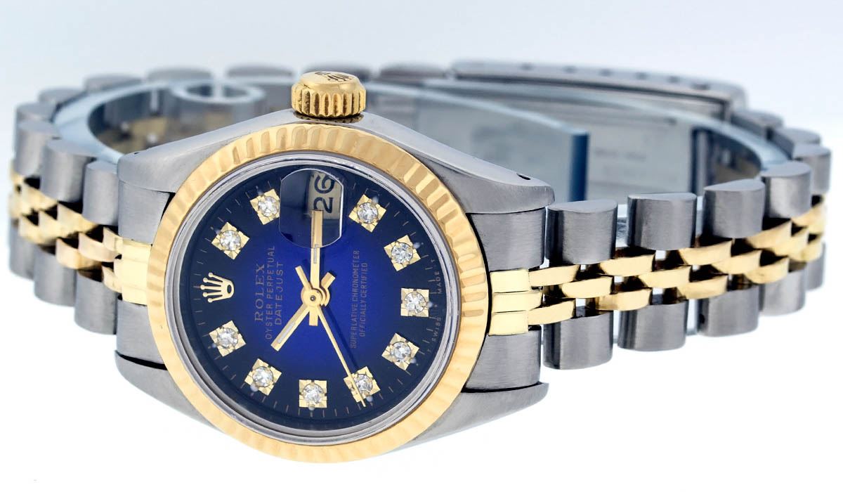 One Ladies Two Tone Rolex Datejust Polished, Serviced & Electronically Tested, 14K Yellow Gold & Stainless Steel Case:26mm, 14K Yellow Gold Crown, Bezel: 14K Yellow Gold Fluted Bezel. Custom Crystal: Acrylic Cyclops Lens. Movement: Automatic Winding Movement Caliber 2030. Custom Dial: Blue Vignette With VS Diamond Hour Markers, Diamond Count: 10 Diamonds In Dial, Color: G to H, Clarity: VS. Date Window: 3 O'Clock Position Date Display, Model: Datejust, Condition: G-6 Extra Fine. Bracelet: Two Tone 14K Yellow Gold & Stainless Steel Jubilee. Bright Polish. 5.5 Inch Length, Adjustable. Standard Clasp, With Rolex Logo. Watch Has Been Serviced And Polished It Is Free Of All Scratches And Dents.