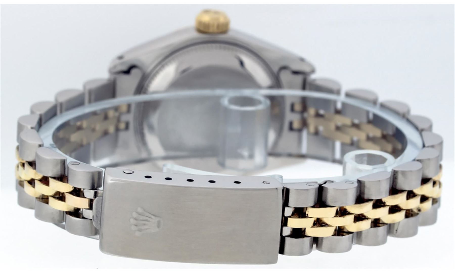One Ladies Two Tone Rolex Datejust Polished, Serviced & Electronically Tested, 14K Yellow Gold & Stainless Steel Case:26mm, 14K Yellow Gold Crown, Bezel: 14K Yellow Gold Fluted Bezel. Custom Crystal: Acrylic Cyclops Lens. Movement: Automatic Winding Movement Caliber 2030. Custom Dial: Blue Vignette With VS Diamond Hour Markers, Diamond Count: 10 Diamonds In Dial, Color: G to H, Clarity: VS. Date Window: 3 O'Clock Position Date Display, Model: Datejust, Condition: G-6 Extra Fine. Bracelet: Two Tone 14K Yellow Gold & Stainless Steel Jubilee. Bright Polish. 5.5 Inch Length, Adjustable. Standard Clasp, With Rolex Logo. Watch Has Been Serviced And Polished It Is Free Of All Scratches And Dents.