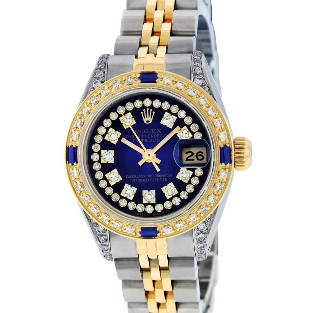 One Ladies Two Tone Rolex Datejust Polished, Serviced & Electronically Tested, Yellow Gold & Stainless Steel Case: 26mm, Yellow Gold Crown, Diamond Lugs: 24 Diamonds On Lugs, Clarity: SI-VS, Color: G to H. Custom Bezel: New 18K Yellow Gold Sapphire Beadset Diamond Bezel, Diamond Count: 28 Diamonds + 4 Sapphires On Bezel, Total Weight .70 Carat, Clarity: SI-VS, Color: G to H. Custom Crystal: New Synthetic Scratch Resistant Sapphire Cyclops Lens. Custom Hands: New Luminescent Hands. Movement: Automatic Winding Movement. Custom Dial: Blue Vignette With String Single Cut Diamond Hour Markers, Diamond Count: 43 Diamonds On Dial, Clarity: SI-VS, Color: G to H. Date Window: 3 O'Clock Position Date Display, Model: Datejust. Condition: G-6 Extra Fine. Bracelet: Two Tone Yellow Gold & Stainless Steel Jubilee Band. Bright Polish. 6.0 Inch Length, Adjustable. Standard Clasp, With Rolex Logo. This Watch Has Been Serviced Time Tested And Is In Excellent Condition It Is Free Of All Scratches And Dents.