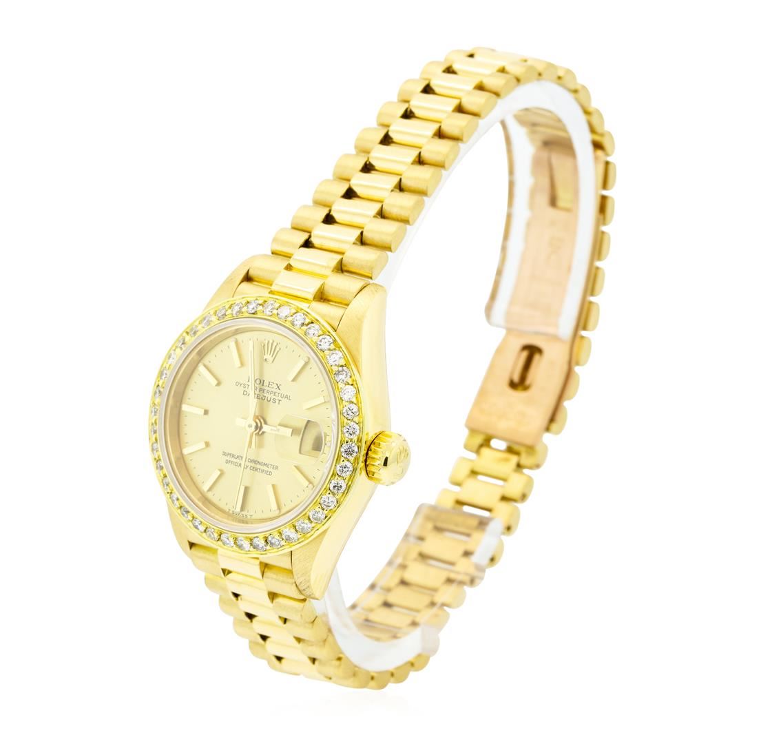 One ladies hand crafted & machine milled Rolex Lady President the DateJust model wristwatch electronically tested 18KT yellow gold, Circa: 1984, Case: 26mm oyster, Rolex Signature Crown: twinlock with logo, Custom Bezel: diamond set, Custom Crystal: synthetic sapphire cyclops lens.Movement: superlative chronometer, Rolex signed Dial: Champagne color, baton hands, & raised indices with a minute track, Date Display: Champagne color, 3 o'clock position, quick set.Bracelet: 18KT yellow gold Lady President, Condition: G-6 Extra Fine. Bright polish & satin finish. Six and three quarter inch length. Swiss and Rolex Hallmarked concealed deployment clasp, with logo. Containing: Thirty-Nine prong set round brilliant cut diamonds, measuring 1.80 - 1.60 x 1.02mm (depth est.) approximate total weight of 39 Stones = 0.72ct. Set & graded in the bezel. Clarity: SI-2 to I-1 Color E - G. Total Weight of Diamonds 0.72ct. Total Weight of Watch 71.48gm. AIG Appraised at $19,000.00.