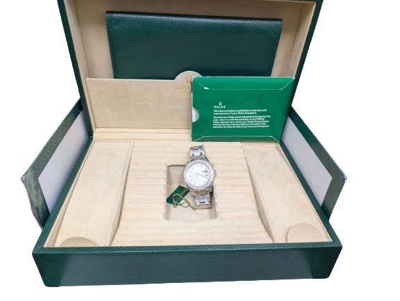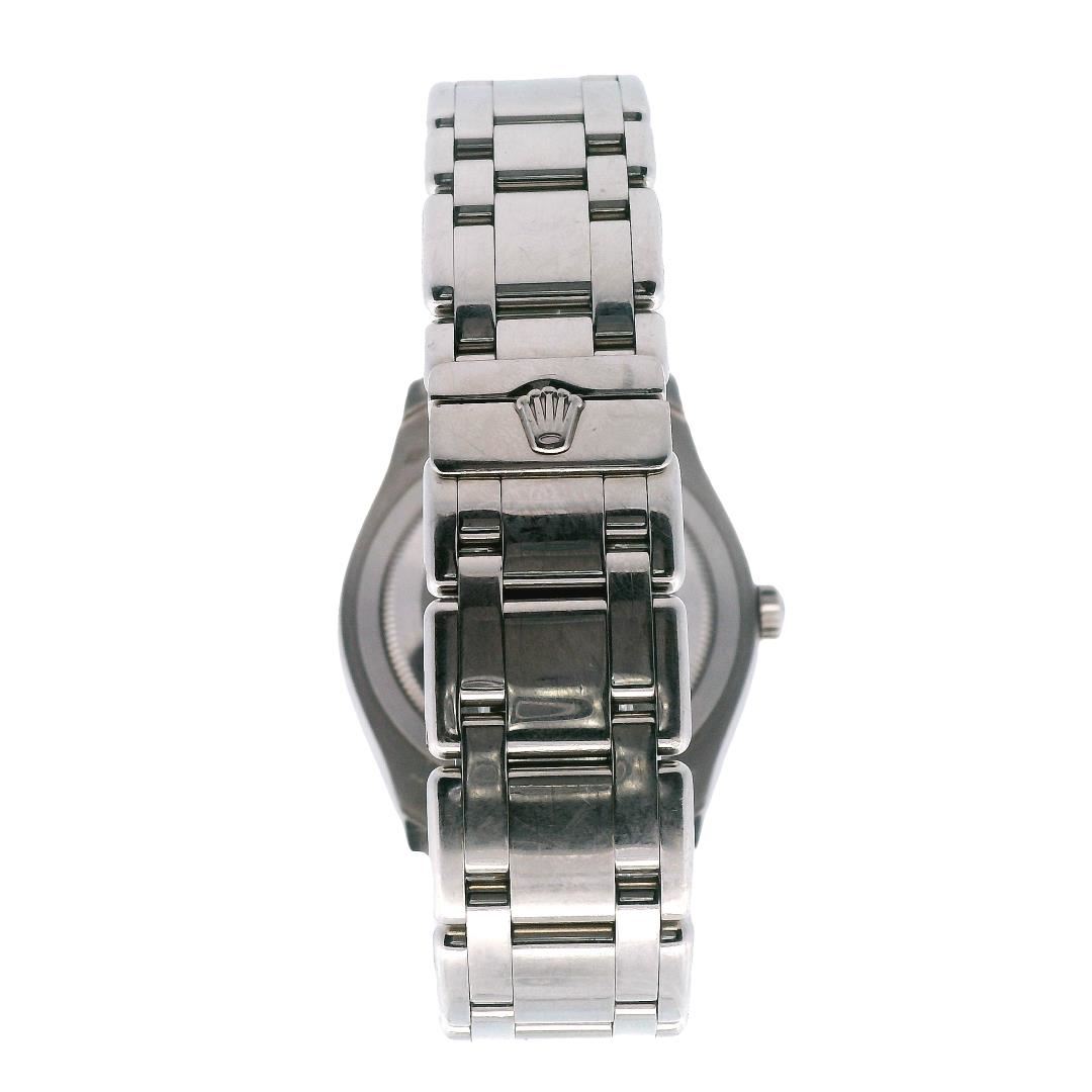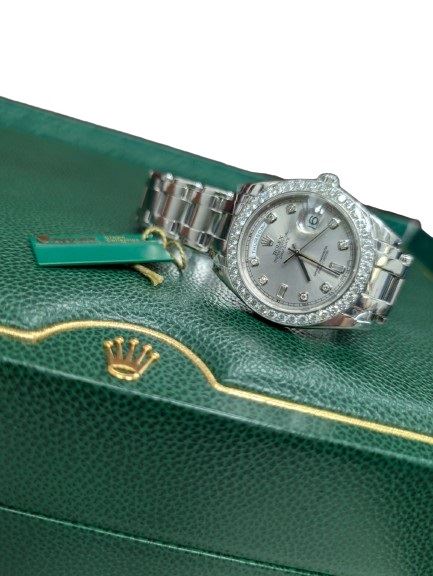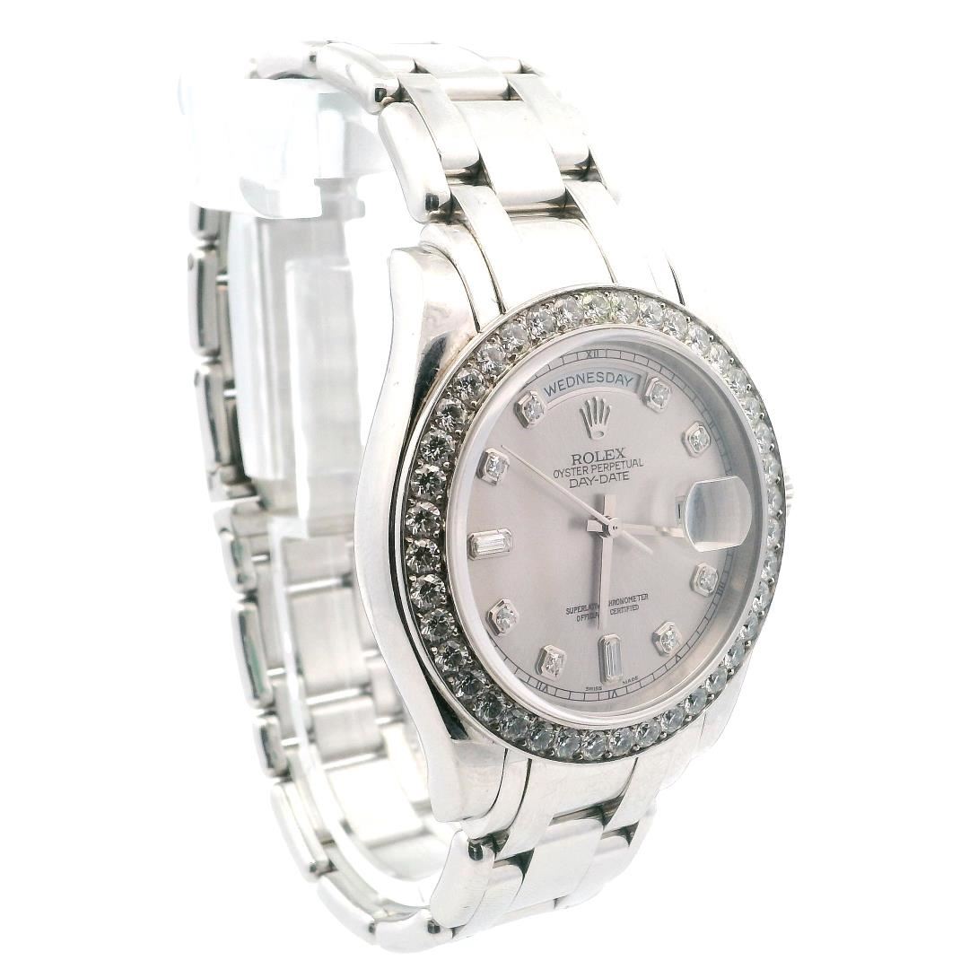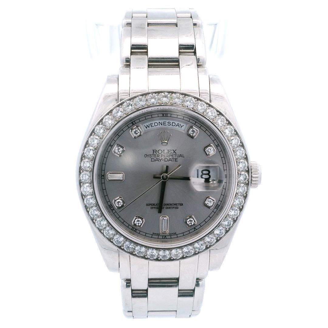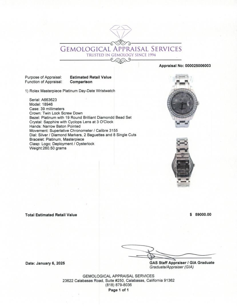A distinguished Rolex Masterpiece Day-Date crafted in platinum, featuring a 39mm case and a twin-lock screw-down crown. The bezel is adorned with 19 round brilliant-cut diamonds in a bead-set design, enhancing the luxurious aesthetic. The silver dial showcases diamond markers, including two baguettes and eight single cuts, paired with narrow baton hands for a refined display. The watch is powered by the Superlative Chronometer Calibre 3155 movement, ensuring exceptional precision. Secured with a platinum Masterpiece bracelet and an Oysterlock deployment clasp, this timepiece weighs 260.50 grams, embodying timeless sophistication and Rolex craftsmanship.