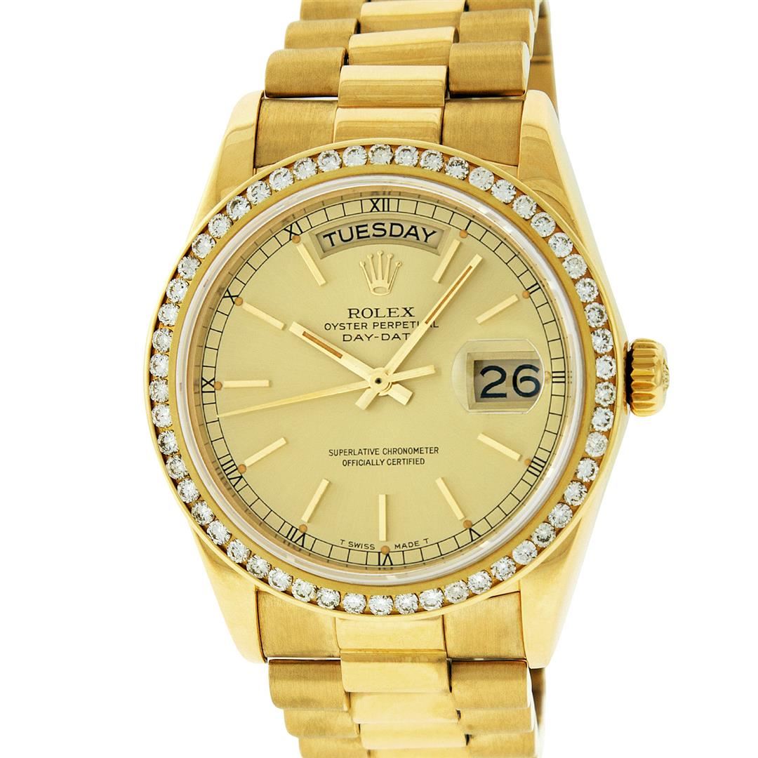 One Men's Pre Owned Rolex Day Date 18K Yellow Gold President Polished, Serviced & Electronically Tested, Rolex 18K Yellow Gold Case: 36mm, Rolex 18K Yellow Gold Crown, Custom Bezel: New 18K Yellow Gold Channel Set Diamond Bezel, Diamond Count: 54 Diamonds On Bezel. Total Bezel Weight 1.0 Carat, Clarity: SI-VS, Color: G to H. Custom Crystal: New Scratch Resistant Synthetic Sapphire Cyclops Lens. Custom Hands: New Luminescent Hands. Rolex Movement: Automatic Winding Movement Caliber 3055. Rolex Dial: Champagne Index With Square Roman Track. Date Window: 3 O'Clock Position Date Display, Day Window: 12 O'Clock Position Date Display. Quickset, Model: Day Date President. Condition: G-6 Extra Fine The Watch Is In Very Good Condition Free Of All Scratches And Dents. Rolex Bracelet: 18K Yellow Gold President. Bright Polish. 7.0 Inch Length, Standard Hidden President Clasp President Band, With Rolex Logo. This Watch Comes With A Rolex Box.