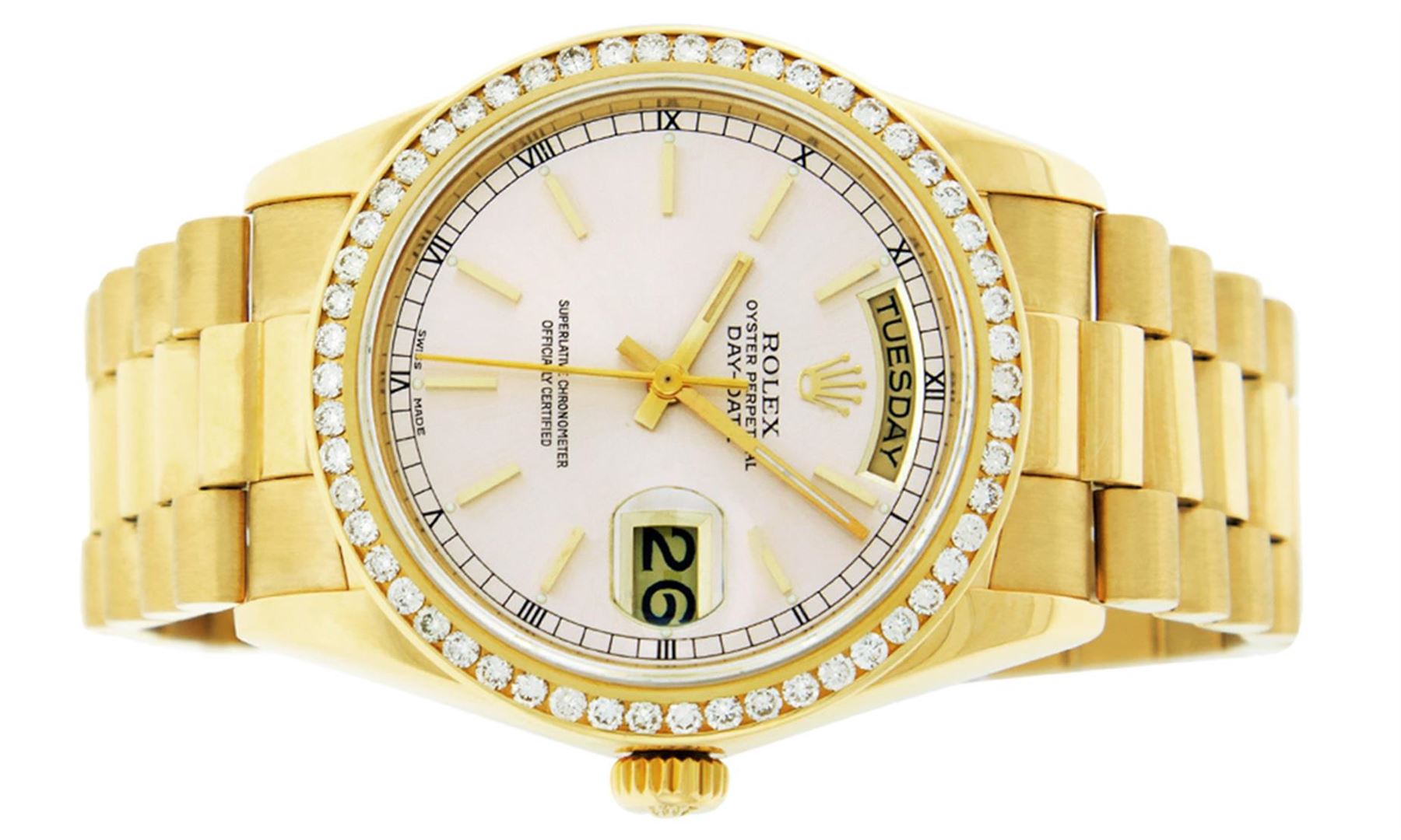 One Men's Pre Owned Rolex Day Date 18K Yellow Gold President Polished, Serviced & Electronically Tested, Rolex 18K Yellow Gold Case: 36mm, Rolex 18K Yellow Gold Crown, Custom Bezel: New 18K Yellow Gold Channel Set Diamond Bezel, Diamond Count: 54 Diamonds On Bezel. Total Bezel Weight 1.0 Carat, Clarity: SI-VS, Color: G to H. Custom Crystal: New Scratch Resistant Synthetic Sapphire Cyclops Lens. Custom Hands: New Luminescent Hands. Rolex Movement: Automatic Winding Movement Caliber 3055. Rolex Dial: Champagne Index With Square Roman Track. Date Window: 3 O'Clock Position Date Display, Day Window: 12 O'Clock Position Date Display. Quickset, Model: Day Date President. Condition: G-6 Extra Fine The Watch Is In Very Good Condition Free Of All Scratches And Dents. Rolex Bracelet: 18K Yellow Gold President. Bright Polish. 7.0 Inch Length, Standard Hidden President Clasp President Band, With Rolex Logo. This Watch Comes With A Rolex Box.
