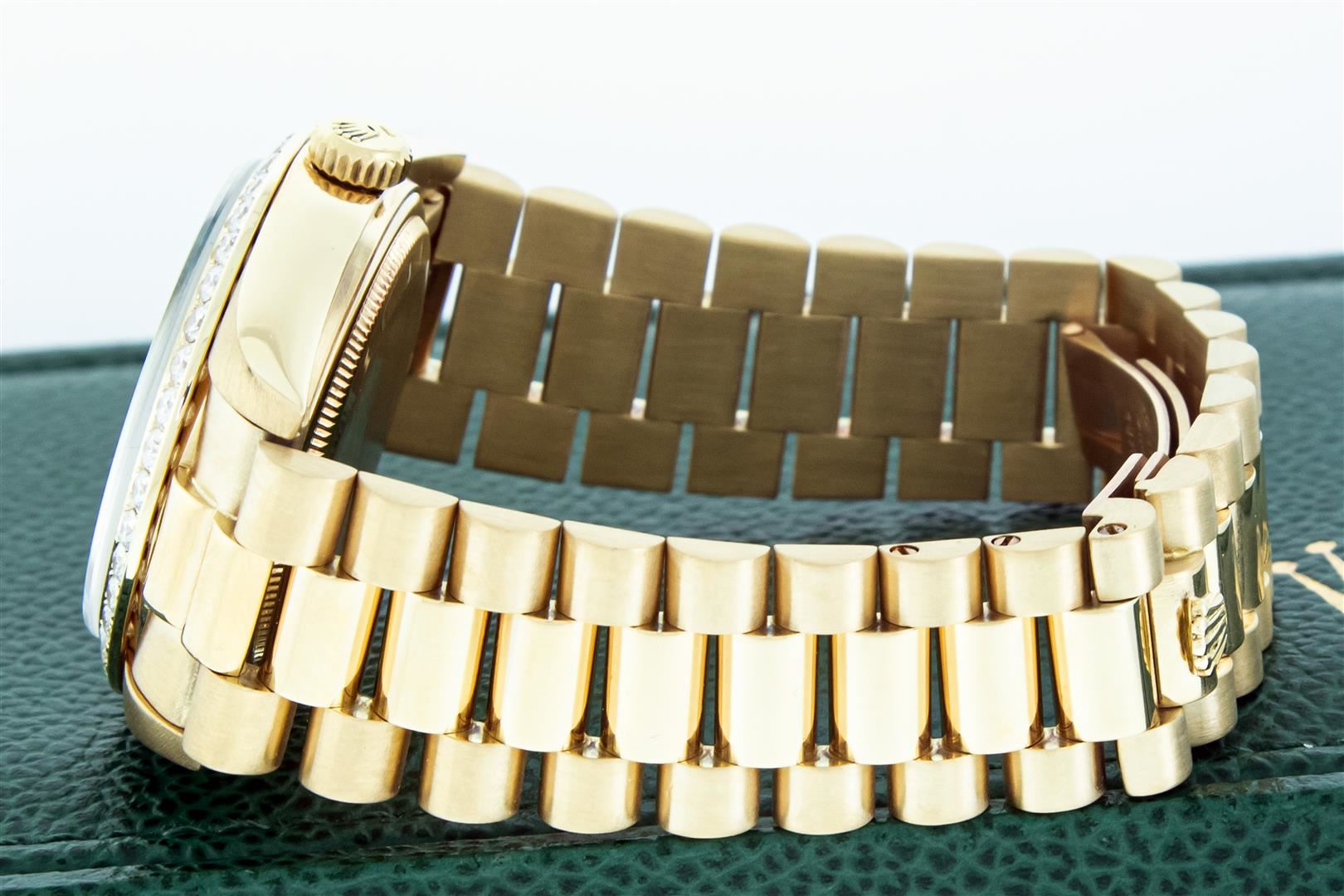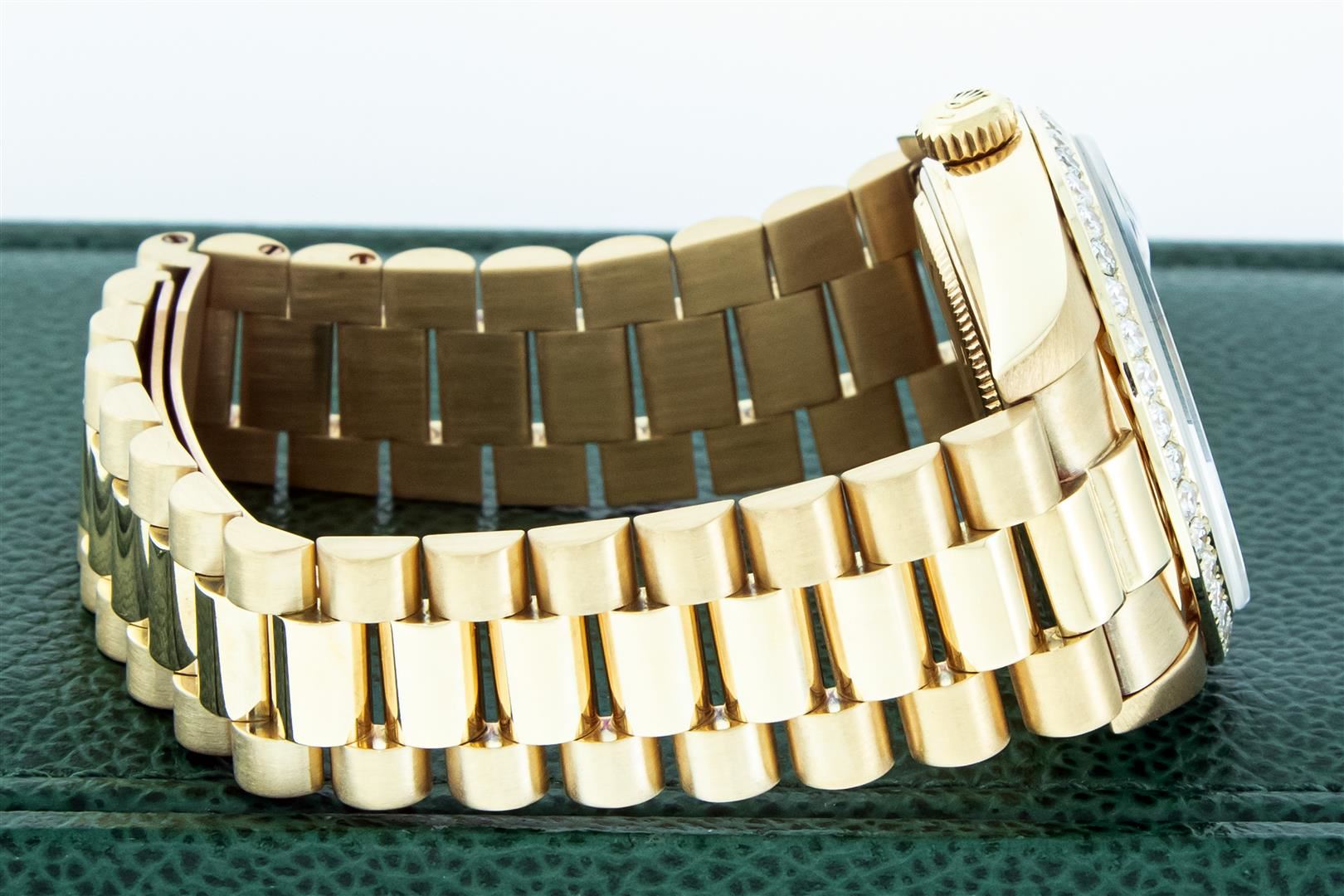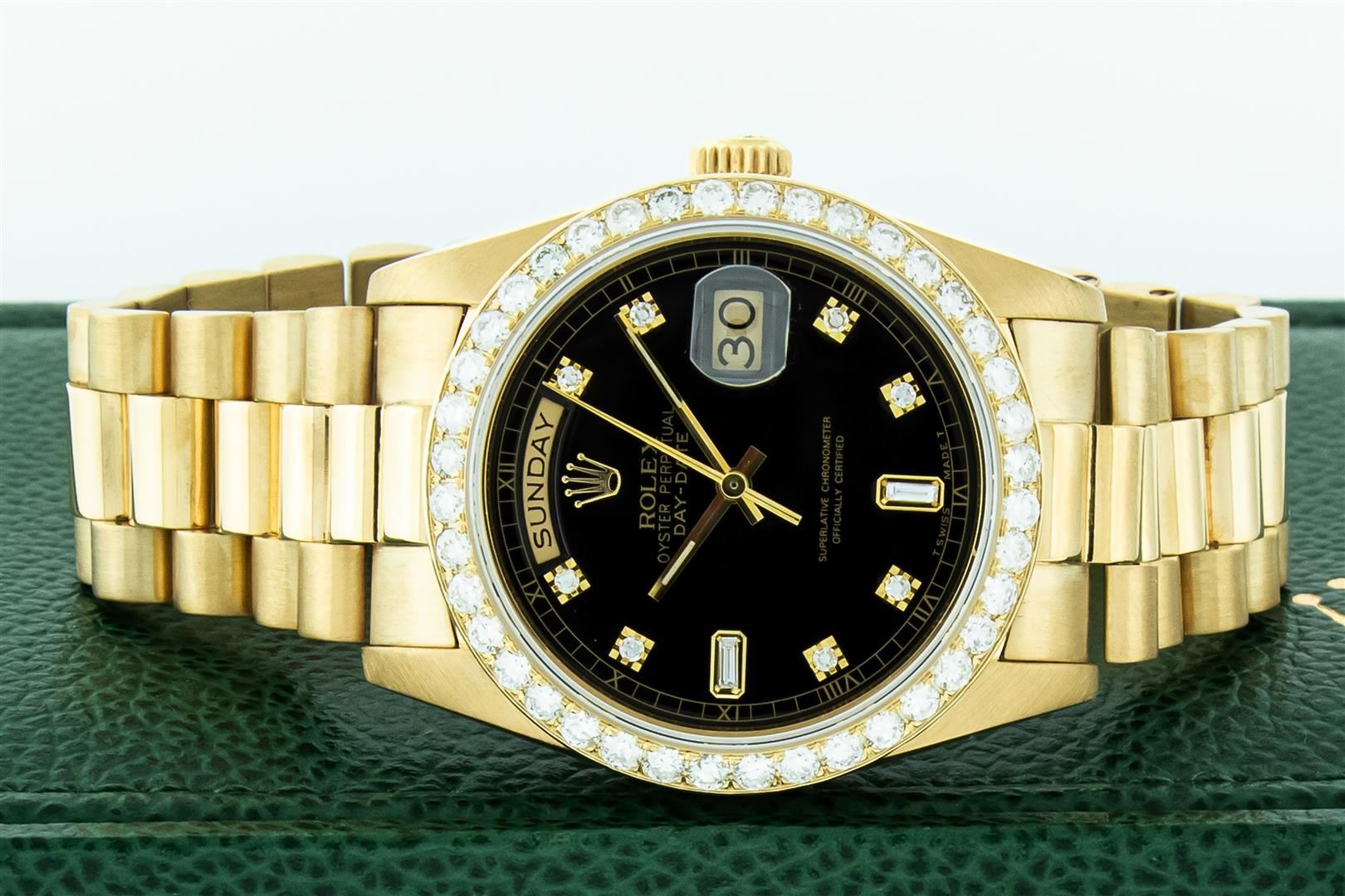 One Men's Rolex Day Date 18K Yellow Gold President Polished, Serviced & Electronically Tested, 18K Yellow Gold Case: 36mm, 18K Yellow Gold Crown, Custom Bezel: New 18K Yellow Gold 2.5ctw Beadset Diamond Bezel, Diamond Count: 42 Diamonds On Bezel. Total Bezel Weight 2.5 Carat, Clarity: SI-VS, Color: G to H. Custom Crystal: New Sapphire With Magnified Date Window. Rolex Movement: Automatic Winding Movement Caliber 3055. Custom Dial: Refinished To Black With Custom Added Diamond Hour Markers, Diamond Count: 8 Diamonds + 2 Diamond Baguettes, Color: G to H, Clarity: SI-VS. Date Window: 3 O'clock Position Date Display, Day Window: 12 O'clock Position Date Display. Quickset, Model: Day Date Quickset President. Condition: G-6 Extra Fine The Watch Is In Very Good Pre Owned Condition Free Of All Scratches And Dents. Bracelet: 18K Yellow Gold President Band. Bright Polish. 7.0 Inch Length, Standard Hidden President Clasp President Band, With Rolex Logo. This Watch Comes With A Rolex Box.