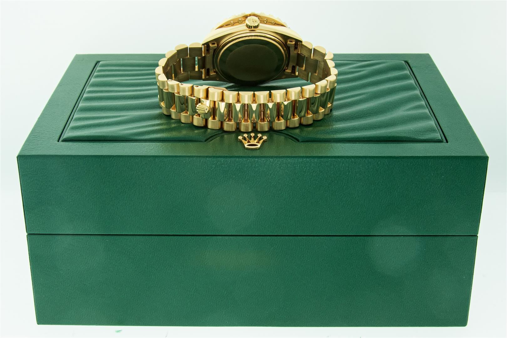 One Mens Rolex Day Date 18K Yellow Gold President Polished, Serviced & Electronically Tested, Rolex 18K Yellow Gold Case: 36mm, Rolex 18K Yellow Gold Crown, Custom Bezel: New 18K 4ctw Yellow Gold Beadset Diamond Bezel, Diamond Count: 30 Diamonds On Bezel. Total Weight 4.0 Carat, Clarity: SI-VS, Color: G to H. Custom Crystal: New Sapphire With Magnified Date Window. Custom Hands: New Luminescent Hands. Rolex Movement: Automatic Winding Movement Caliber 3055. Custom Dial: Refinished To Green With Custom Added Diamond Hour Markers, Diamond Count: 8 Diamonds + 2 Diamond Baguettes On Dial, Color: G to H, Clarity:VS. Date Window: 3 O'Clock Position Date Display, Day Window: 12 O'Clock Position Date Display. Quickset, Model: Day Date President. Condition: G-6 Extra Fine The Watch Is In Very Good Condition Free Of All Scratches And Dents. Rolex Bracelet: 18K Yellow Gold President. Bright Polish. 7.0 Inch Length, Standard Hidden President Clasp President Band, With Rolex Logo. This Pre Owned Watch Has Been Serviced And Polished It Is Free Of All Scratches And Dents. This Watch Comes With a Rolex Box and Booklets.