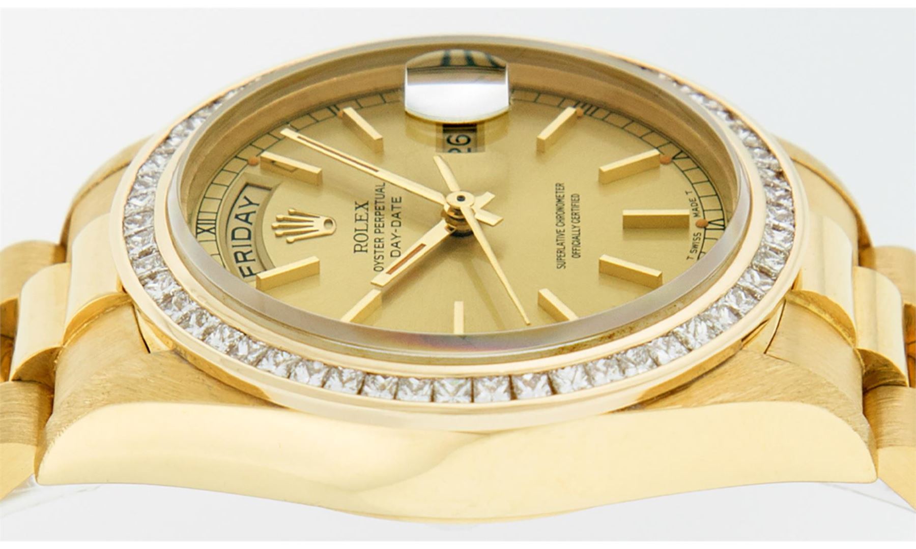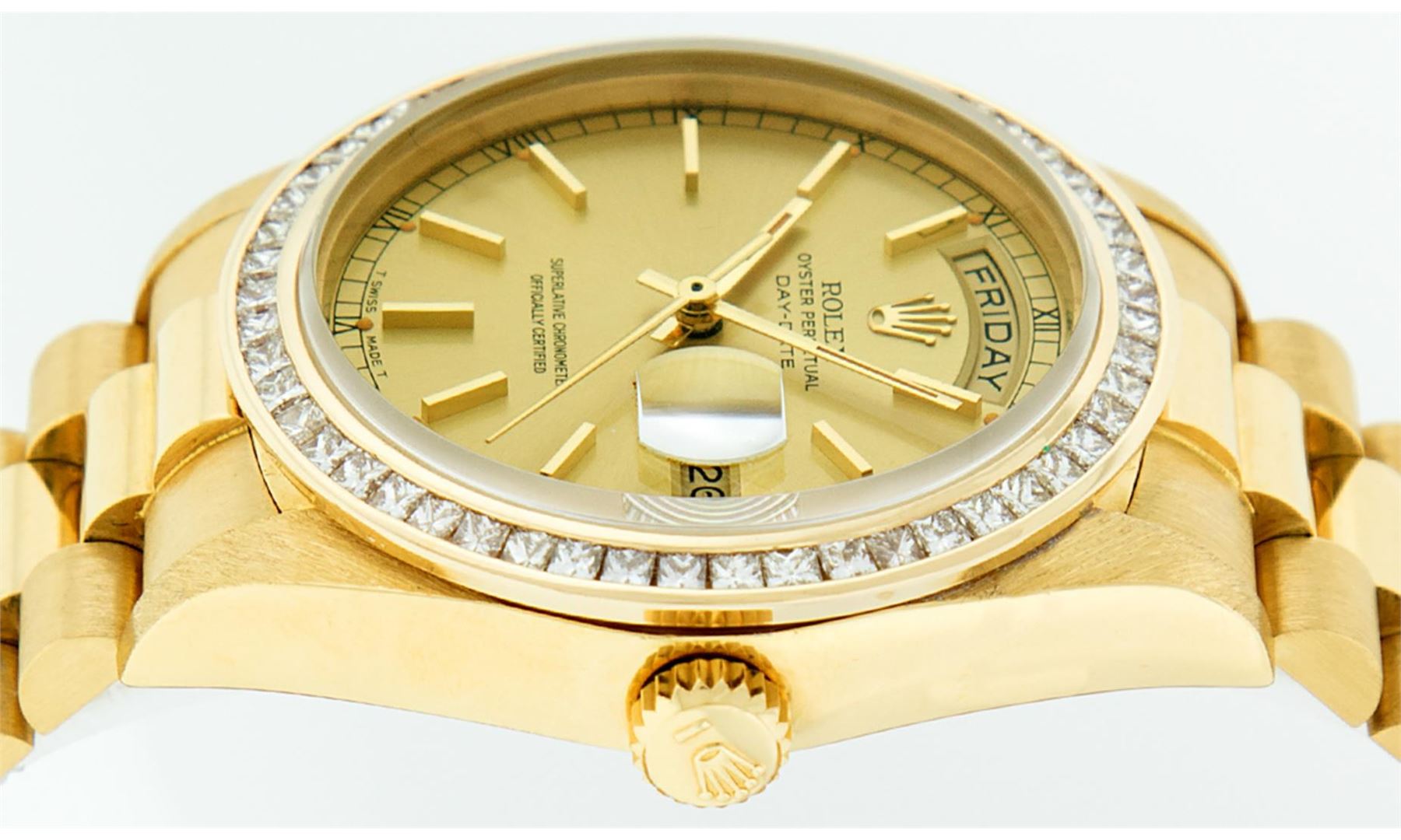 One Men's Rolex Day Date 18K Yellow Gold President Polished, Serviced & Electronically Tested, Rolex 18K Yellow Gold Case: 36mm, Rolex 18K Yellow Gold Crown, Custom Bezel: New 14K Yellow Gold Princess Cut Diamond Bezel, Diamond Count: 53 Diamonds On Bezel. Total Weight 2.75 Carat, Clarity: SI-VS, Color: G to H. Custom Crystal: New Sapphire With Magnified Date Window. Hands: Luminescent Hands. Rolex Movement: Automatic Winding Movement Caliber 3055. Rolex Dial: Champagne Index Dial With Square Roman Track And Lumi Dots. Date Window: 3 O'Clock Position Date Display, Day Window: 12 O'Clock Position Date Display. Quickset, Model: Day Date Quickset President. Condition: G-6 Extra. Rolex Bracelet: 18K Yellow Gold President Band. Bright Polish. 7.0 Inch Length, Standard Hidden President Clasp President Band, With Rolex Logo. This Pre Owned Watch Has Been Serviced Time Tested And Is In Excellent Condition It Is Free Of All Scratches And Dents.