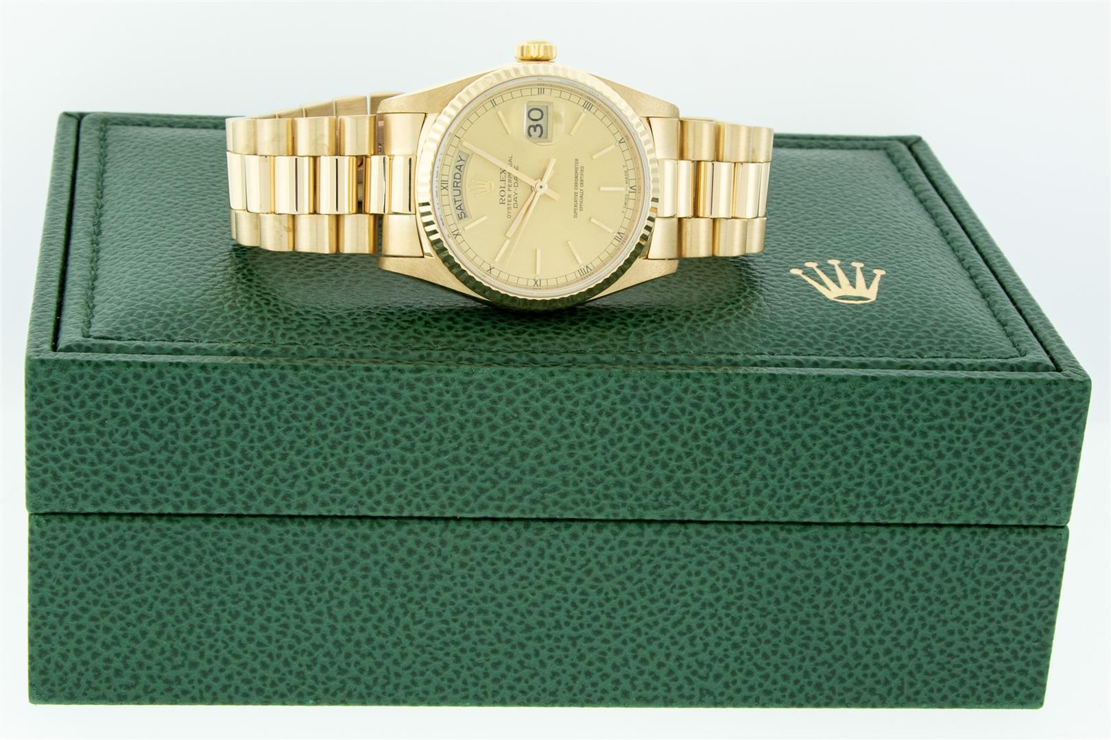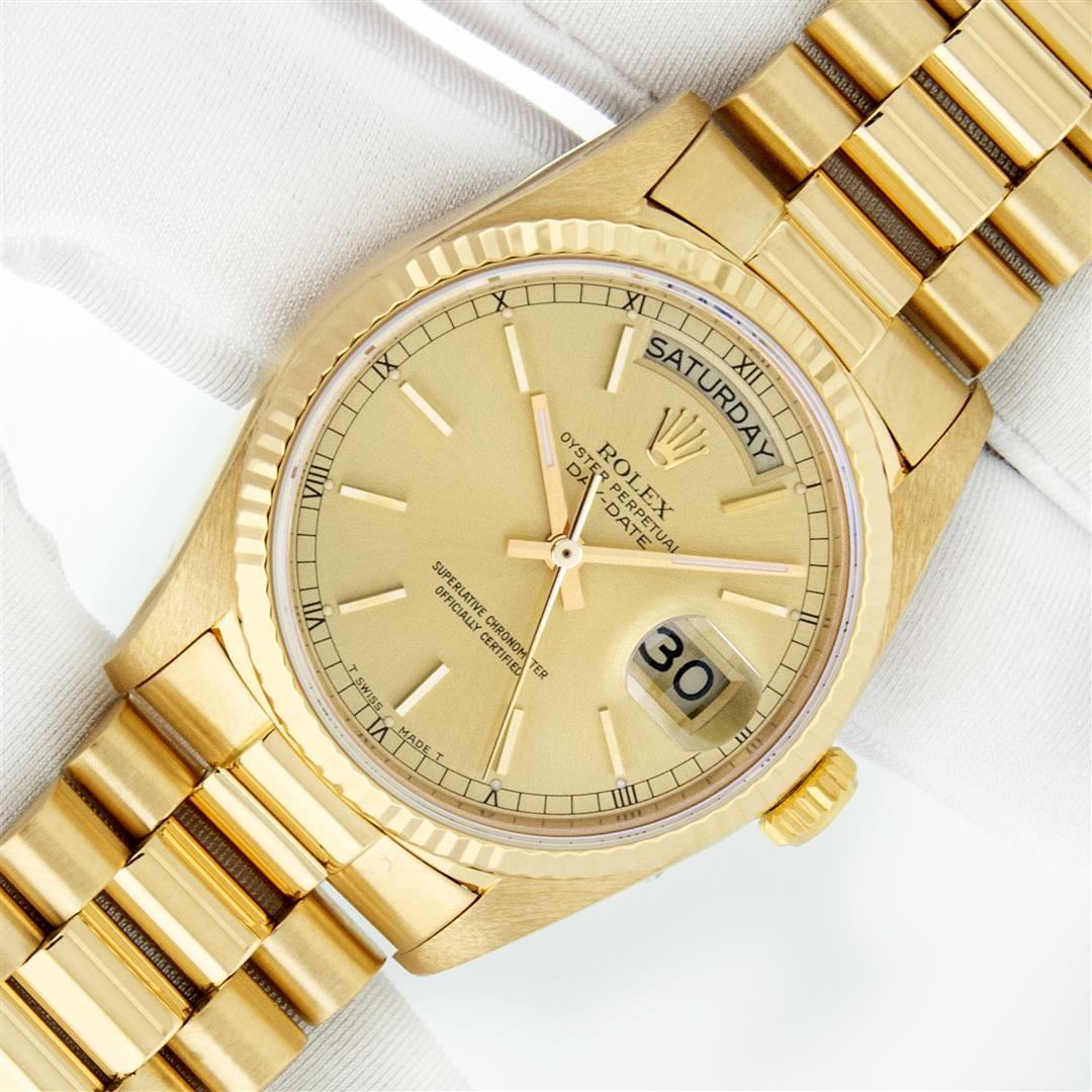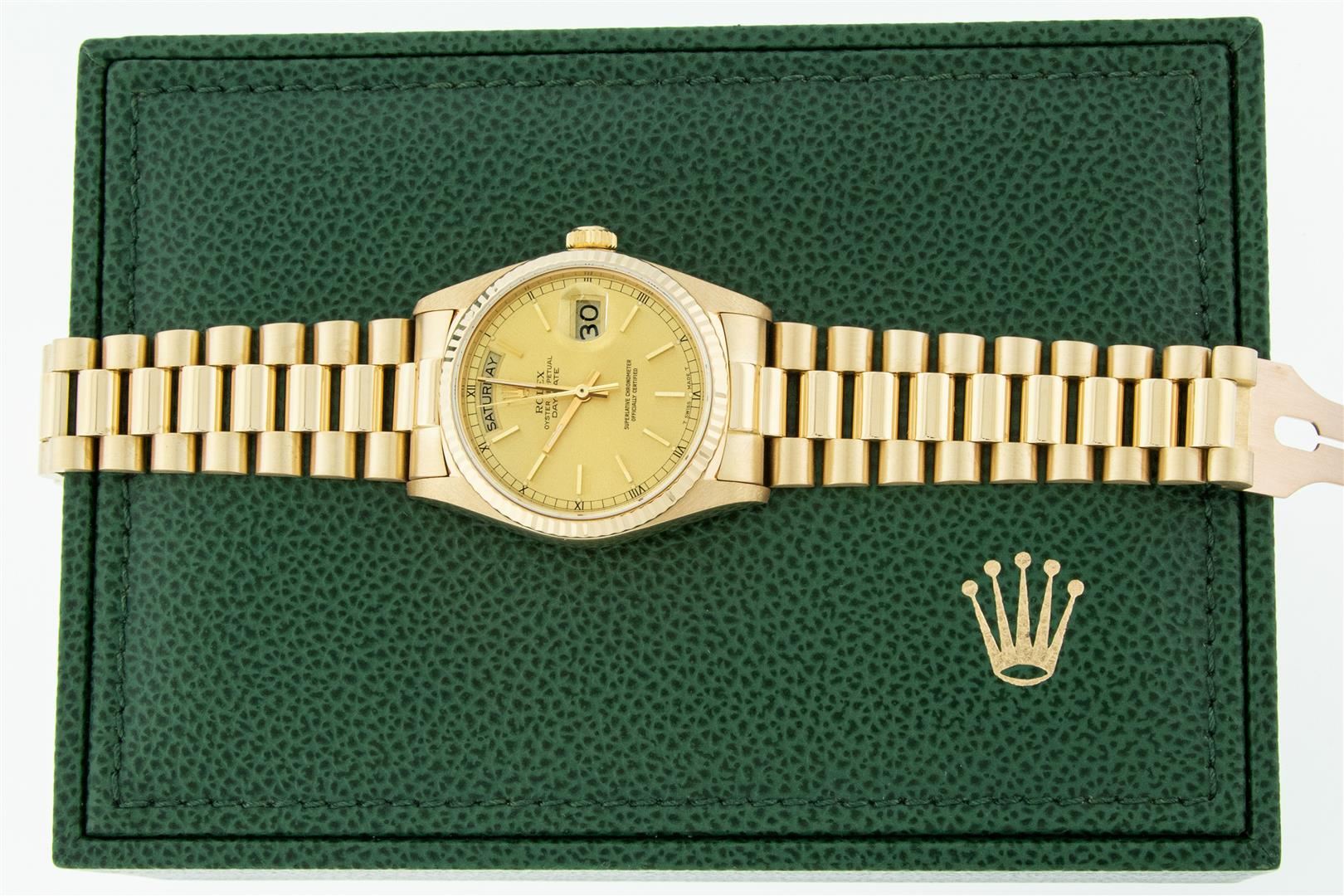 One Men's Quickset Rolex Day Date 18K Yellow Gold President Polished, Serviced & Electronically Tested, Rolex 18K Yellow Gold Case: 36mm, Rolex 18K Yellow Gold Crown, Rolex Bezel: 18K Yellow Gold Fluted Bezel. Custom Crystal: New Sapphire With Magnified Date Window. Rolex Movement: Automatic Quickset Winding Movement Caliber 3055. Rolex Dial: Champagne Index With Roman Track & Lumi Dots. Date Window: 3 O'clock Position, Day Display: 12 O'clock Position, Single Quickset, Model: Day Date President. Condition: G-6 Extra Fine. Rolex Bracelet: 18K Yellow Gold President Band With Hidden Clasp, Bright & Satin Polish. 7.0 Inch Length, Standard President Clasp, With Rolex Logo. This Pre Owned Watch Has Been Serviced And Polished It Is Free Of All Scratches And Dents. This Watch Comes With A Rolex Box.