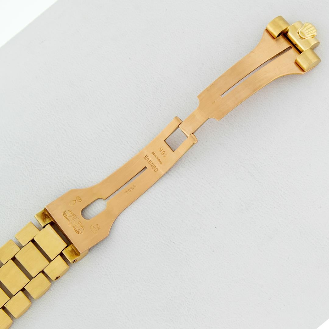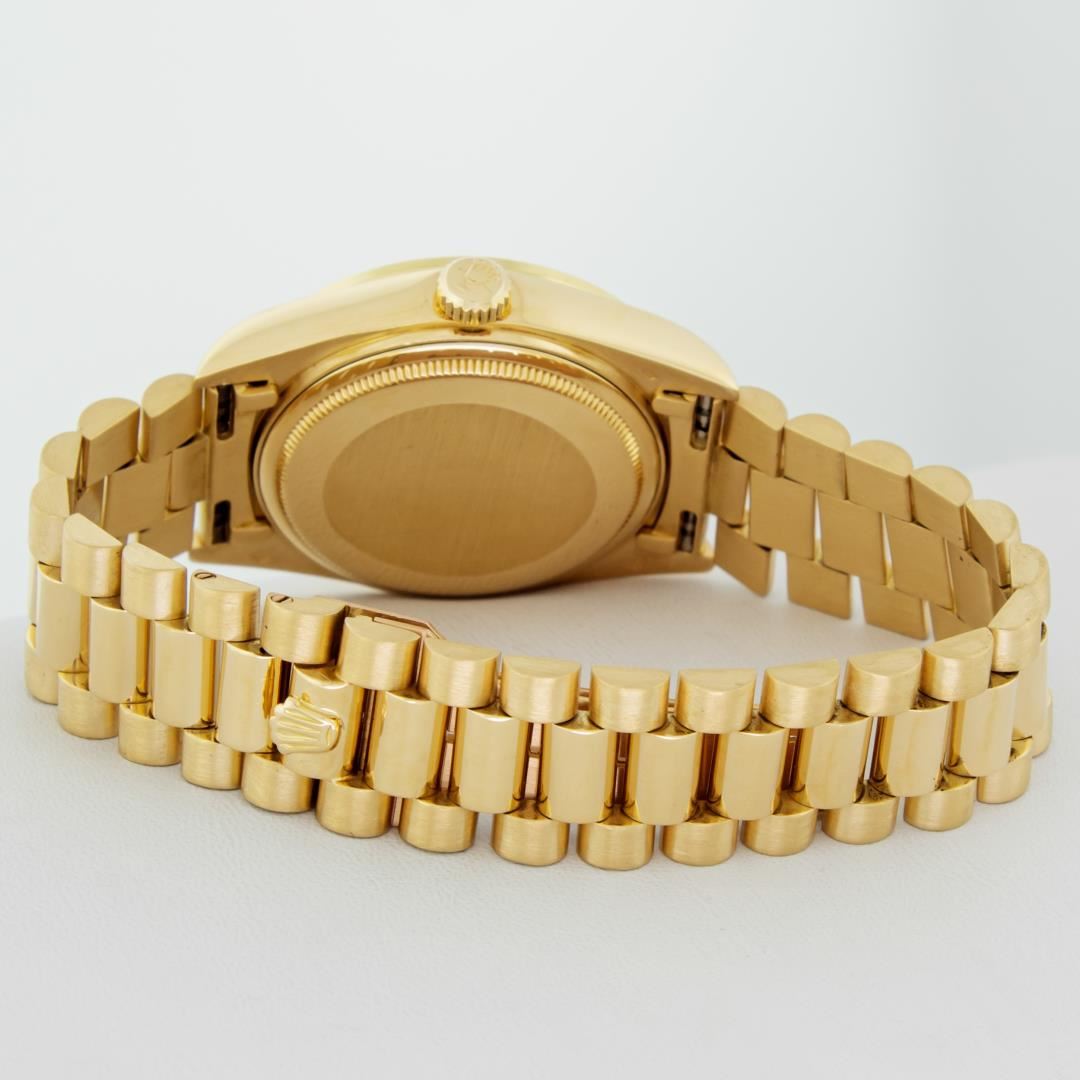 One Men's Rolex Day Date 18K Yellow Gold President Polished, Serviced & Electronically Tested, Rolex 18K Yellow Gold Case: 36mm, Rolex 18K Yellow Gold Crown, Custom Bezel: New 18K Yellow Gold Beadset Diamond Bezel, Diamond Count: 44 Diamonds On Bezel. Total Bezel Weight 1.0 Carat, Clarity: SI-VS, Color: G to H. Custom Crystal: New Sapphire With Magnified Date Window. Custom Hands: New Luminescent Hands. Rolex Movement: Automatic Winding Movement Caliber 3055. Rolex Dial: Champagne Index With Square Roman Track And Lumi Dot. Date Window: 3 O'Clock Position Date Display, Day Window: 12 O'Clock Position Date Display. Quickset, Model: Day Date Quickset President. Condition: G-6 Extra Fine. Rolex Bracelet: 18K Yellow Gold President Band. Bright Polish. 7.0 Inch Length, Hidden President Clasp, With Rolex Logo. This Pre Owned Watch Has Been Serviced Time Tested And Is In Excellent Condition It Is Free Of All Scratches And Dents.