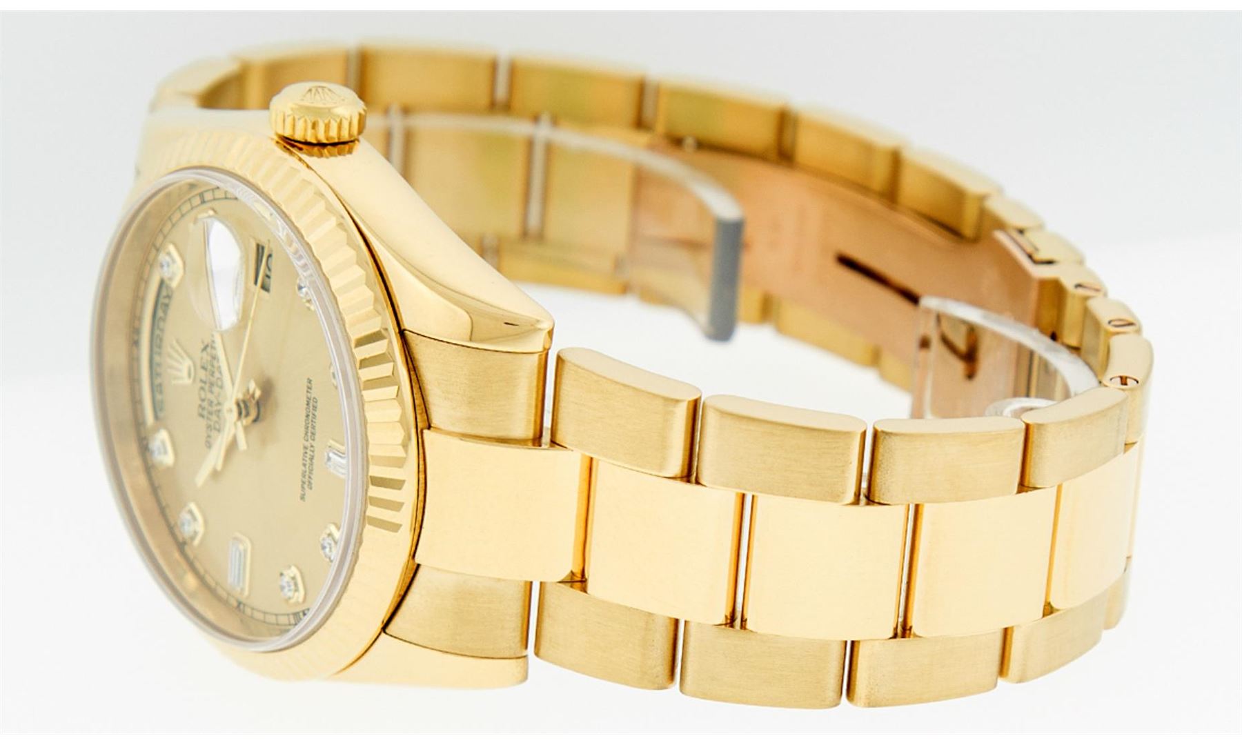 One Men's Rolex Day Date 18K Yellow Gold President Polished, Serviced & Electronically Tested, 18K Yellow Gold Case: 36mm, 18K Yellow Gold Crown, Rolex Bezel: 18K Yellow Gold Fluted Bezel. Rolex Crystal: Sapphire With Magnified Date Window. Rolex Hands: Non Luminescent Yellow Hands. Rolex Movement: Automatic Winding Movement Caliber 3155. Rolex Dial: Factory Champagne Diamond Dial With Square Roman Track, Diamond Count: 8 Diamonds + 2 Baguette Diamonds On Dial, Clarity:VVS. Date Window: 3 O'Clock Position Date Display, Day Window: 12 O'Clock Position Date Display. Double Quickset, Model: Day Date President. Condition: G-6 Extra Fine. Rolex Bracelet: 18K Yellow Gold Oyster President Band. Bright Polish. 7.0 Inch Length, Hidden Oyster President Clasp, With Rolex Logo. This Watch Comes With a Rolex Box And Watch Winder.