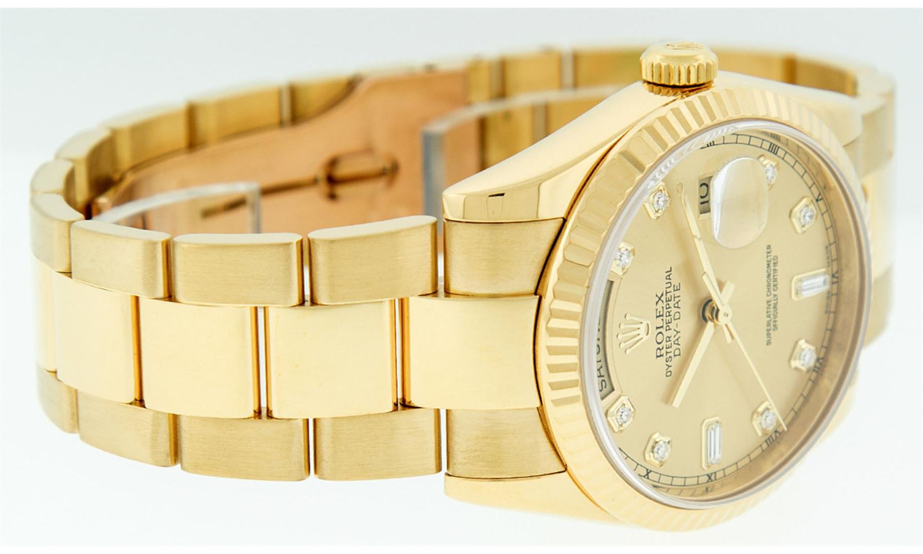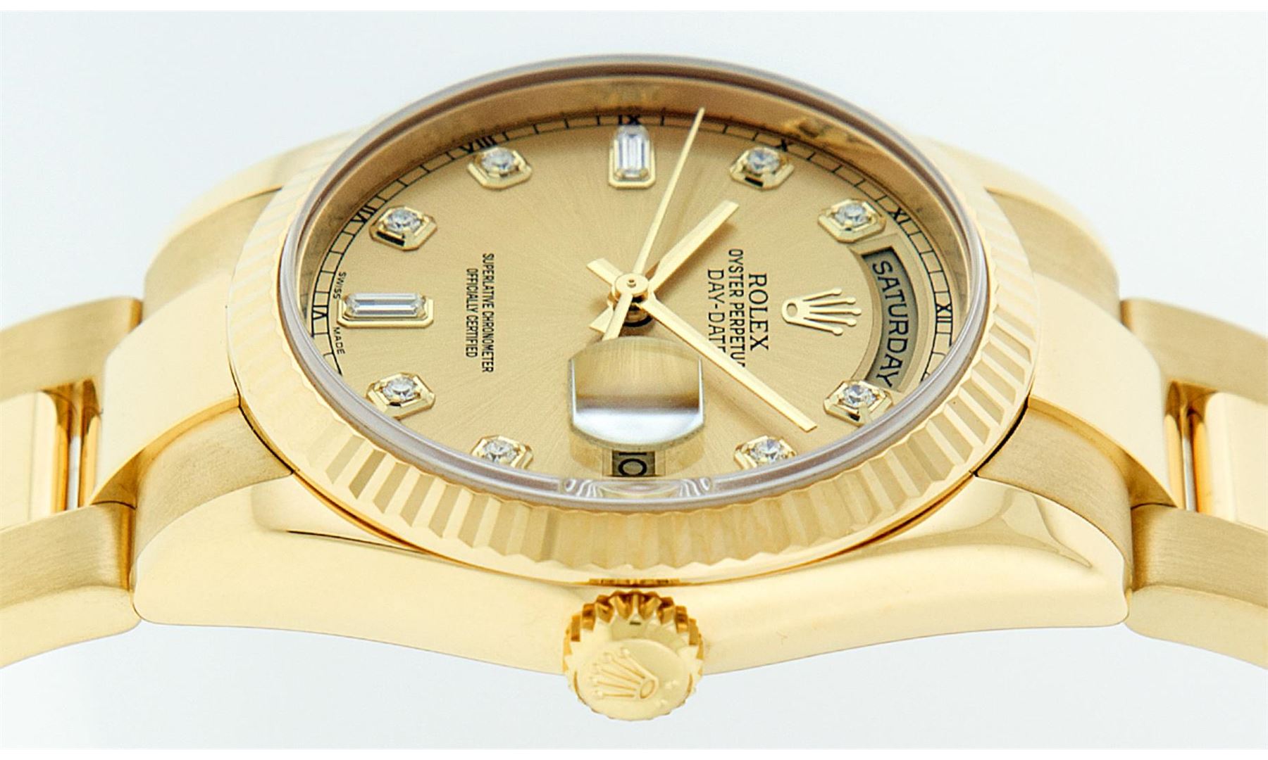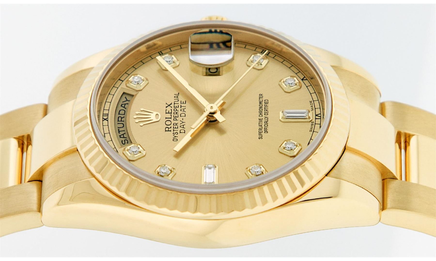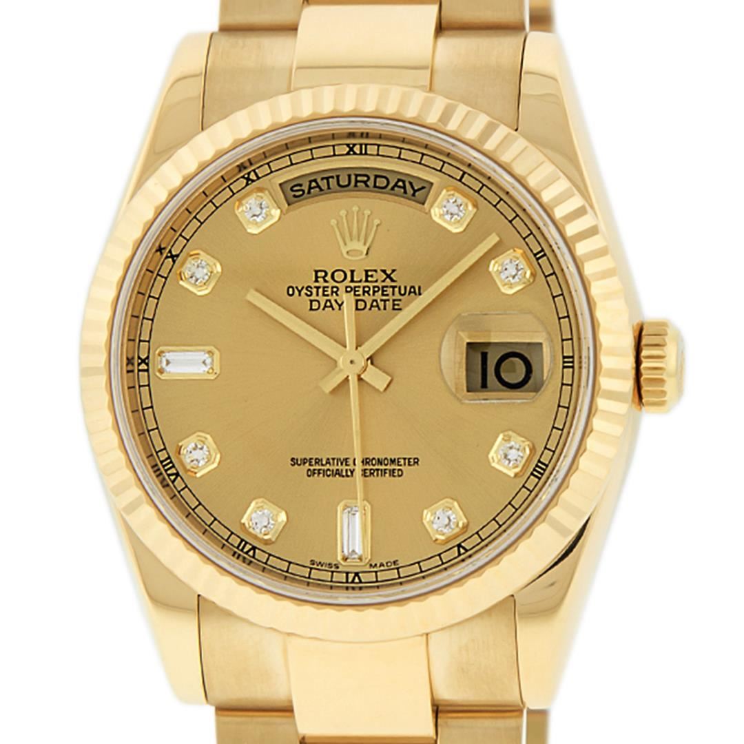 One Men's Rolex Day Date 18K Yellow Gold President Polished, Serviced & Electronically Tested, 18K Yellow Gold Case: 36mm, 18K Yellow Gold Crown, Rolex Bezel: 18K Yellow Gold Fluted Bezel. Rolex Crystal: Sapphire With Magnified Date Window. Rolex Hands: Non Luminescent Yellow Hands. Rolex Movement: Automatic Winding Movement Caliber 3155. Rolex Dial: Factory Champagne Diamond Dial With Square Roman Track, Diamond Count: 8 Diamonds + 2 Baguette Diamonds On Dial, Clarity:VVS. Date Window: 3 O'Clock Position Date Display, Day Window: 12 O'Clock Position Date Display. Double Quickset, Model: Day Date President. Condition: G-6 Extra Fine. Rolex Bracelet: 18K Yellow Gold Oyster President Band. Bright Polish. 7.0 Inch Length, Hidden Oyster President Clasp, With Rolex Logo. This Watch Comes With a Rolex Box And Watch Winder.