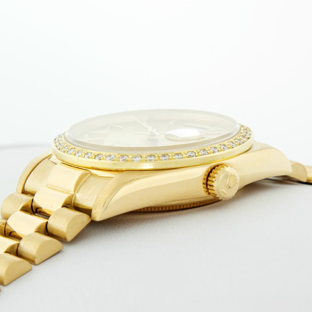 One Men's Rolex Day Date 18K Yellow Gold President Polished, Serviced & Electronically Tested, Rolex 18K Yellow Gold Case: 36mm, Rolex 18K Yellow Gold Crown, Custom Bezel: New 18K Yellow Gold Beadset Diamond Bezel, Diamond Count: 44 Diamonds On Bezel. Total Bezel Weight 1.0 Carat, Clarity: SI-VS, Color: G to H. Custom Crystal: New Sapphire With Magnified Date Window. Custom Hands: New Luminescent Hands. Rolex Movement: Automatic Winding Movement Caliber 3055. Rolex Dial: Champagne Index With Square Roman Track And Lumi Dot. Date Window: 3 O'Clock Position Date Display, Day Window: 12 O'Clock Position Date Display. Quickset, Model: Day Date Quickset President. Condition: G-6 Extra Fine. Rolex Bracelet: 18K Yellow Gold President Band. Bright Polish. 7.0 Inch Length, Hidden President Clasp, With Rolex Logo. This Pre Owned Watch Has Been Serviced Time Tested And Is In Excellent Condition It Is Free Of All Scratches And Dents.