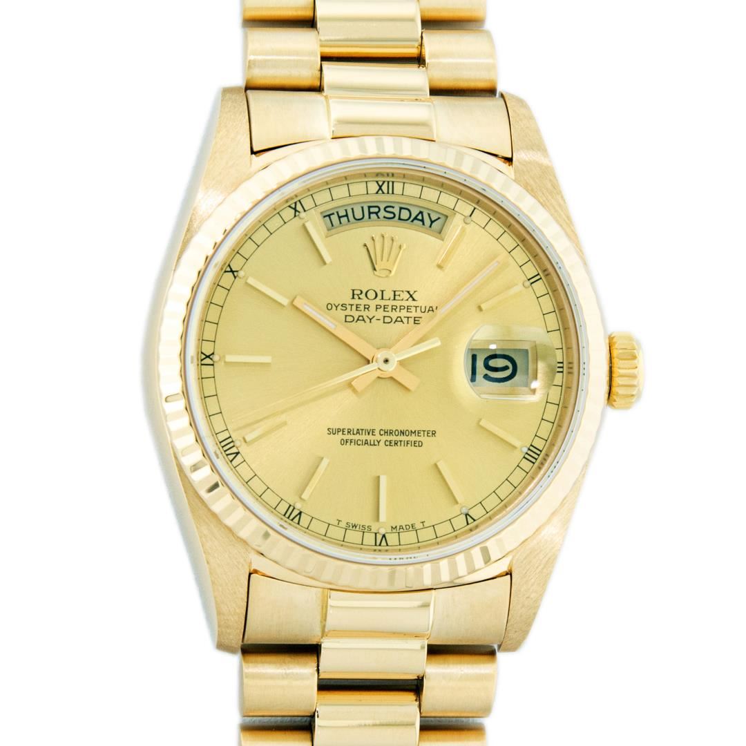 One Men's Quickset Rolex Day Date 18K Yellow Gold President Polished, Serviced & Electronically Tested, Rolex 18K Yellow Gold Case: 36mm, Rolex 18K Yellow Gold Crown, Rolex Bezel: 18K Yellow Gold Fluted Bezel. Crystal: Sapphire With Magnified Date Window. Hands: Luminescent Hands. Rolex Movement: Automatic Quickset Winding Movement Caliber 3055. Rolex Dial: Champagne Index With Roman Track & Lumi Dots. Date Window: 3 O'Clock Position, Day Display: 12 O'Clock Position, Single Quickset, Model: Day Date Quickset President. Condition: G-6 Extra Fine. Rolex Bracelet: 18K Yellow Gold President Band With Hidden Clasp, Bright & Satin Polish. 7.0 Inch Length, Standard Hidden President Clasp, With Rolex Logo. This Pre Owned Watch Has Been Serviced Time Tested And Is In Excellent Condition It Is Free Of All Scratches And Dents.