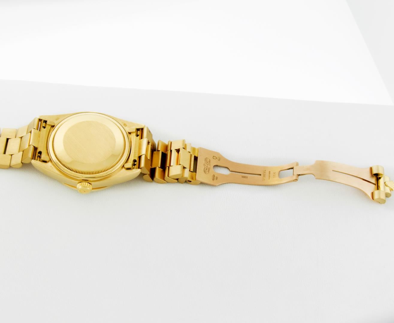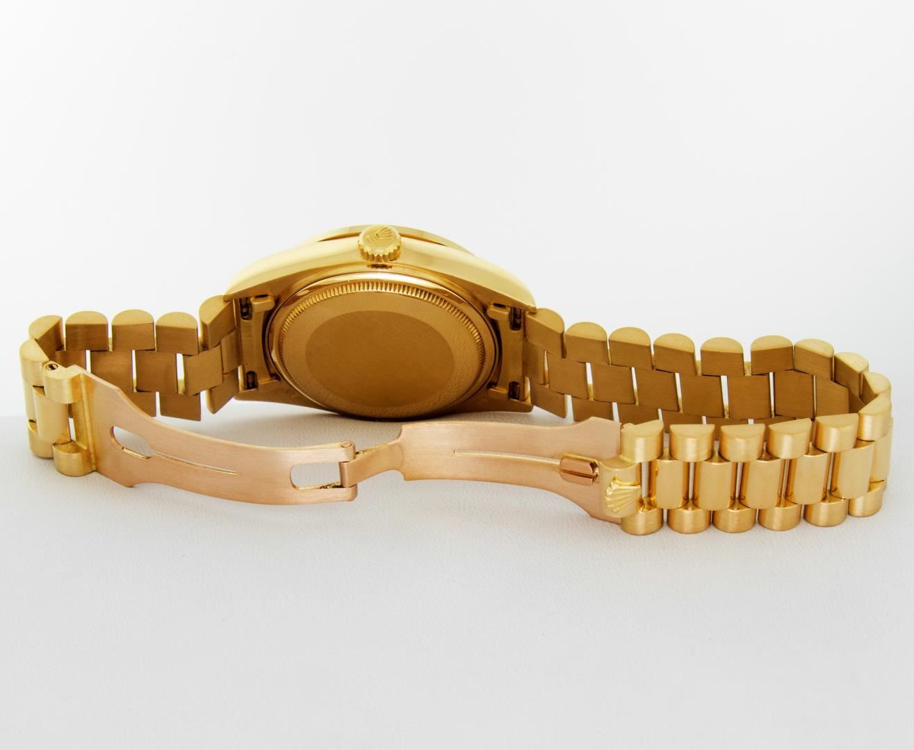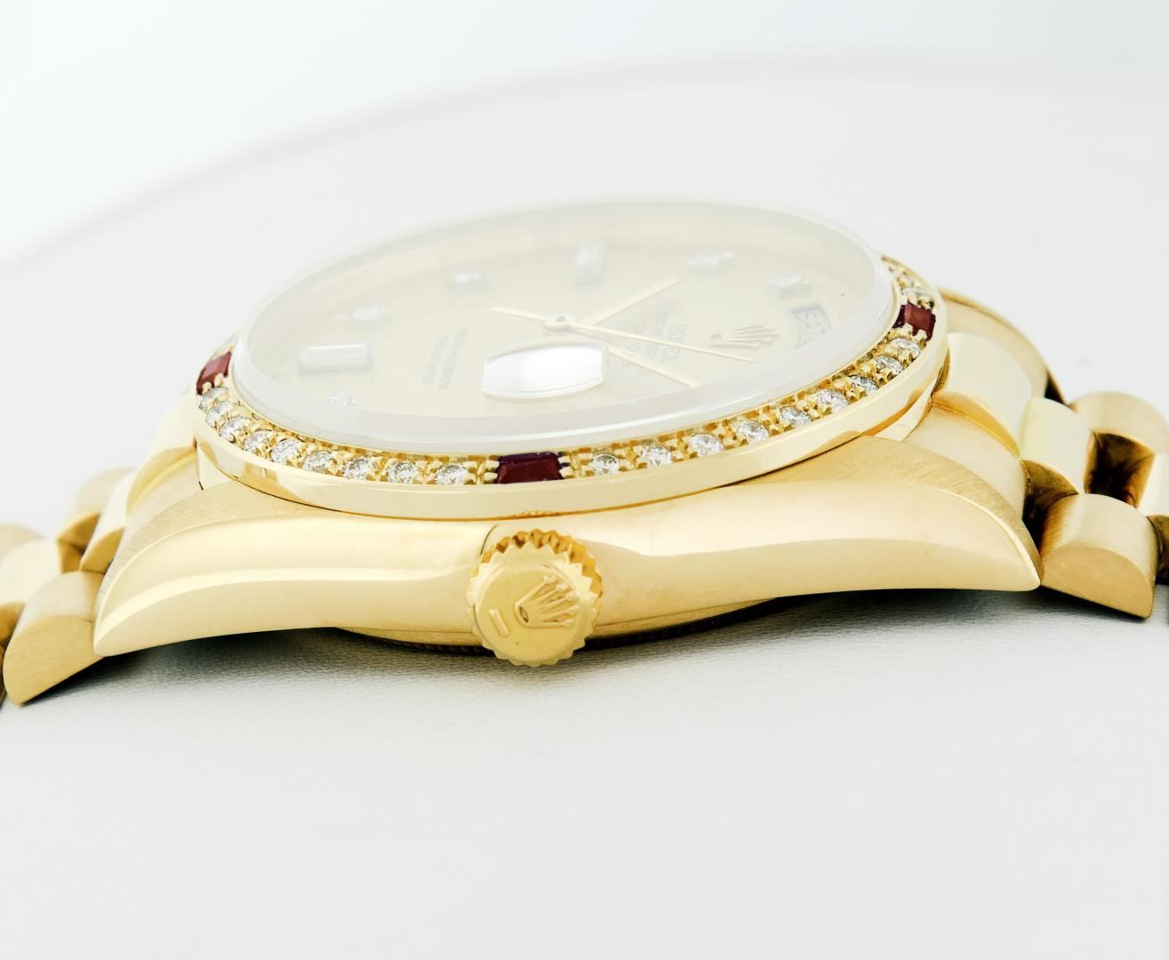 One Men's Quickset Rolex Day Date 18K Yellow Gold President Polished, Serviced & Electronically Tested, Rolex 18K Yellow Gold Case: 36mm, Rolex 18K Yellow Gold Crown, Custom Bezel: New 18K Yellow Diamond + Ruby Beadset Bezel, Stone Count: 36 Diamonds + 4 Rubies, Total Weight .75 Carat, Clarity: SI-VS, Color: G to H. Custom Crystal: New Sapphire With Magnified Date Window. Custom Hands: New Luminescent Hands. Rolex Movement: Automatic Quickset Winding Movement Caliber 3055. Rolex Dial: Factory Champagne Diamond Dial With Dash Track And Lumi Dots, Stone Count: 8 Diamonds + 2 Baguettes, Clarity: VS. Date Window: 3 O'Clock Position, Day Display: 12 O'Clock Position, Single Quickset, Model: Day Date Quickset President. Condition: G-6 Extra Fine. Rolex Bracelet: 18K Yellow Gold President Band With Hidden Clasp, Bright & Satin Polish. 7.0 Inch Length, Hidden President Clasp, With Rolex Logo. This Pre Owned Watch Has Been Serviced Time Tested And Is In Excellent Condition It Is Free Of All Scratches And Dents.