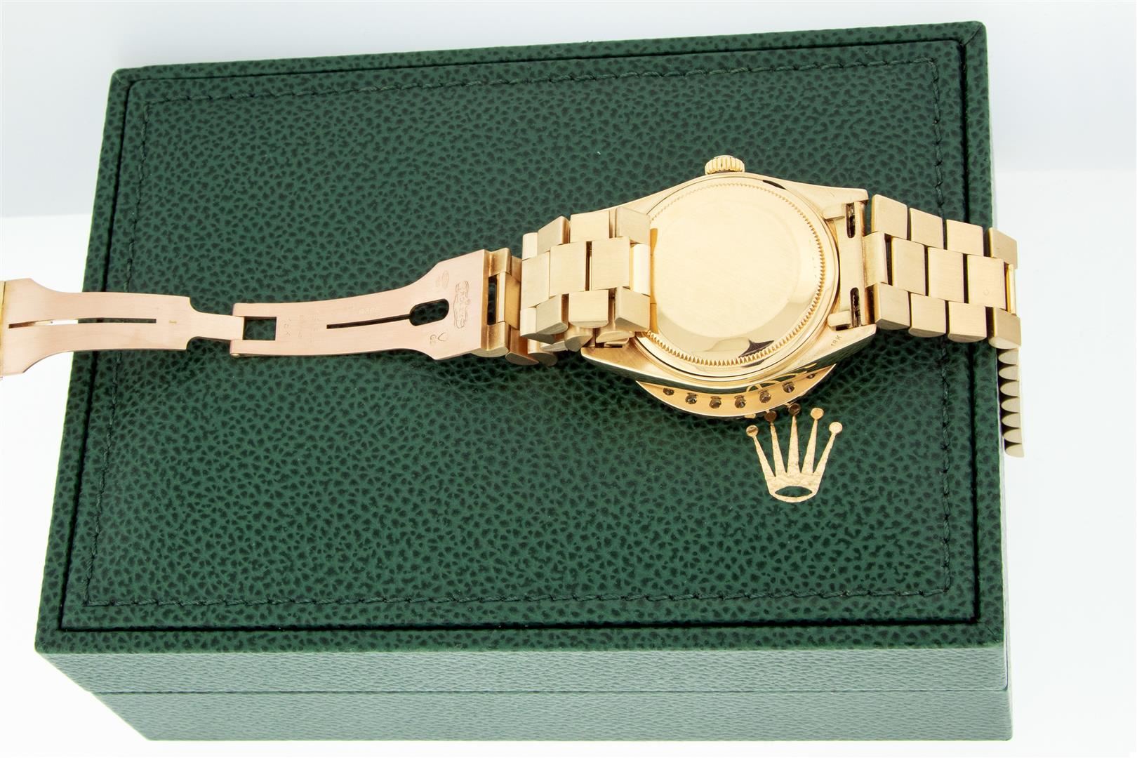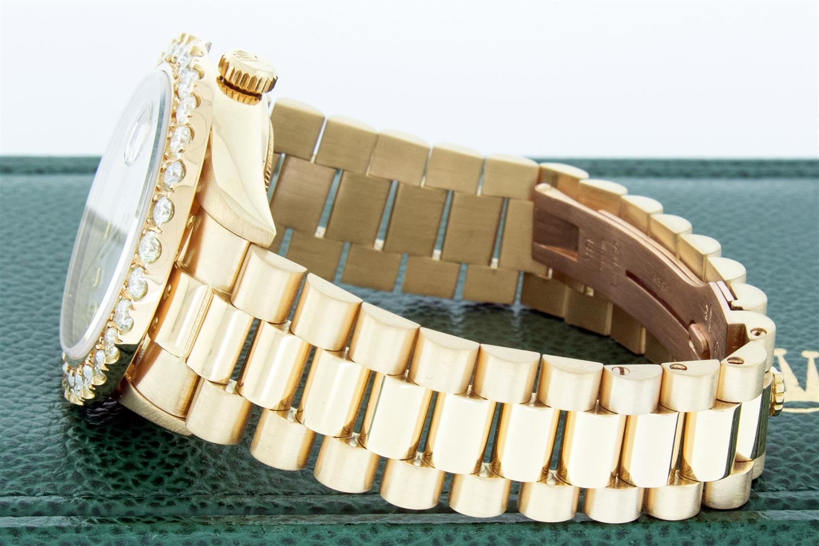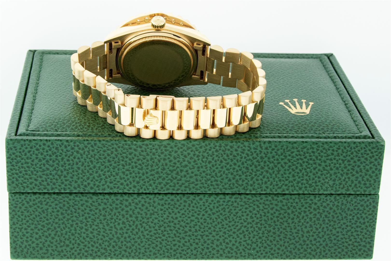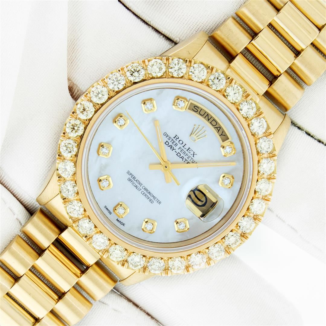 One Men's Rolex Day Date 18K Yellow Gold President Polished, Serviced & Electronically Tested, Rolex 18K Yellow Gold Case: 36mm, Rolex 18K Yellow Gold Crown, Custom Bezel: New 18K Yellow Gold Bead-set Diamond Bezel, Diamond Count: 48 Diamonds On Bezel. Total Weight 4.25 Carat, Clarity: SI-VS, Color: G to H. Custom Crystal: New Sapphire With Magnified Date Window. Custom Hands: New Luminescent Hands. Rolex Movement: Automatic Winding Movement. Custom Dial: Mother Of Pearl With Custom Added Diamond Hour Markers, Diamond Count: 10 Diamonds On Dial, Color: G to H, Clarity:VS. Date Window: 3 O'clock Position Date Display, Day Window: 12 O'clock Position Date Display. Quickset, Model: Day Date President. Condition: G-6 Extra Fine The Watch Is In Very Good Condition Free Of All Scratches And Dents. Rolex Bracelet: 18K Yellow Gold President. Bright Polish. 7.0 Inch Length, Standard Hidden President Clasp President Band, With Rolex Logo. This Pre Owned Watch Has Been Serviced And Polished It Is Free Of All Scratches And Dents. This Watch Comes With A Rolex Box.