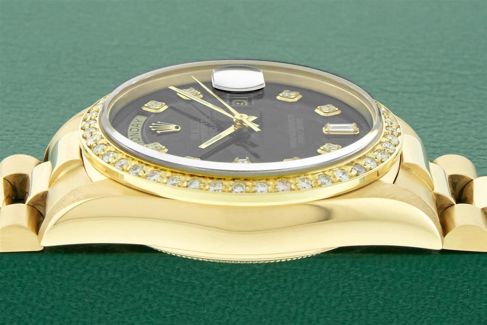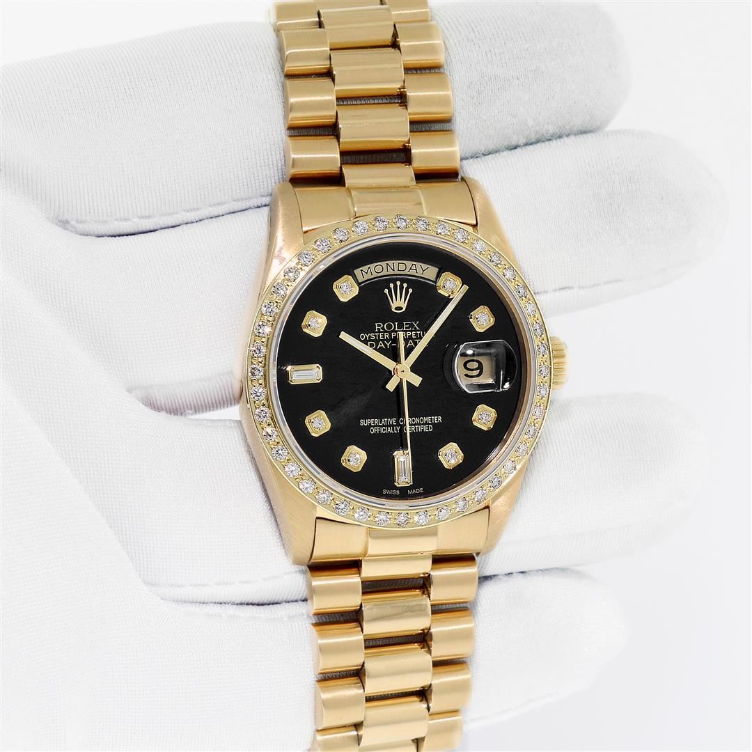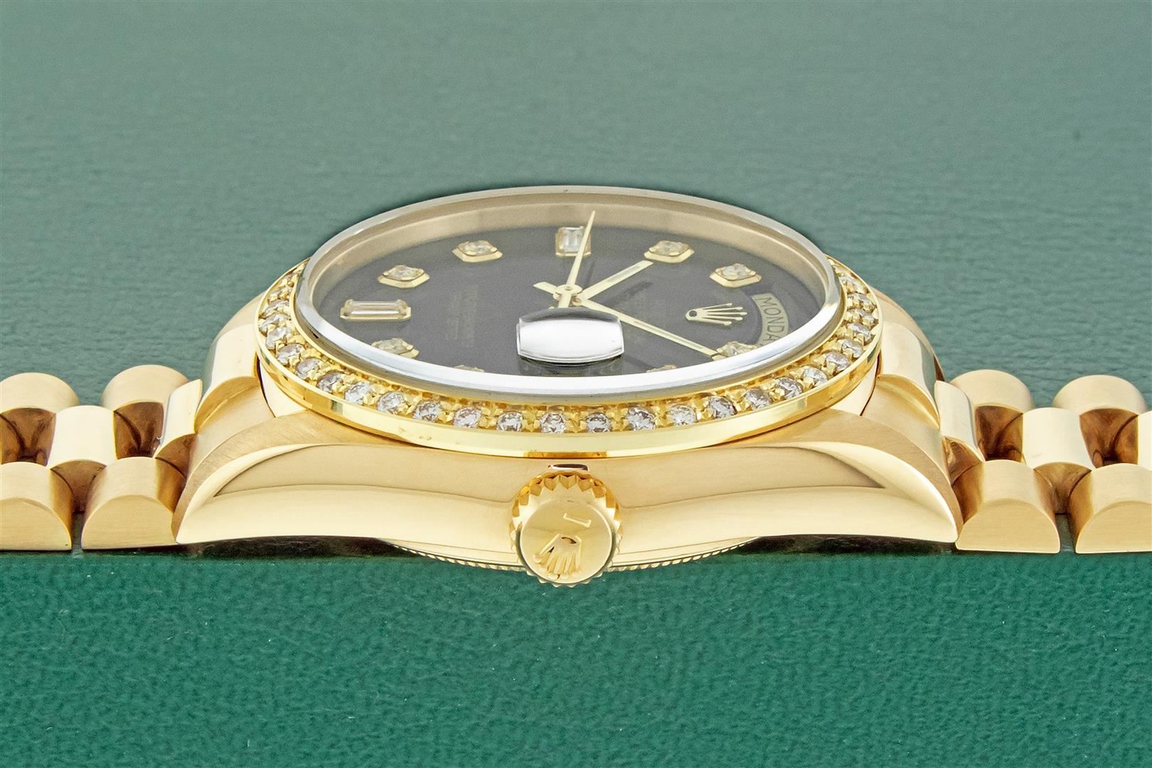 One Men's Rolex Day Date 18K Yellow Gold President Polished, Serviced & Electronically Tested, Rolex 18K Yellow Gold Case: 36mm, Rolex 18K Yellow Gold Crown, Custom Bezel: New 18K Yellow Gold Beadset Diamond Bezel, Diamond Count 44 Diamonds On Bezel. Total Weight 1.0 Carat, Clarity: SI-VS, Color: G to H. Custom Crystal: New Sapphire With Magnified Date Window. Custom Hands: New Luminescent Hands. Rolex Movement: Automatic Winding Movement Caliber 3055. Custom Dial: Refinished To Black With Custom Added Diamond Hour Markers, Diamond Count: 8 Diamonds + 2 Baguettes, Color: G to H, Clarity: VS. Date Window: 3 O'clock Position Date Display, Day Window: 12 O'clock Position Date Display. Quickset, Model: Day Date President. Condition: G-6 Extra Fine. Bracelet: New 18K Yellow Gold President Band. Bright Polish. 7.0 Inch Length, Standard Hidden President Clasp President Band, With Rolex Logo. This Pre Owned Watch Has Been Serviced And Polished It Is Free Of All Scratches And Dents. This Watch Comes With A Rolex Box.