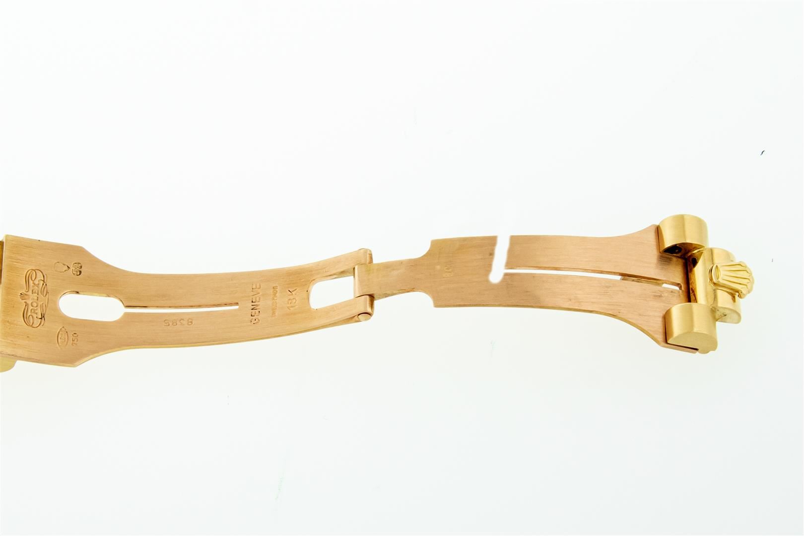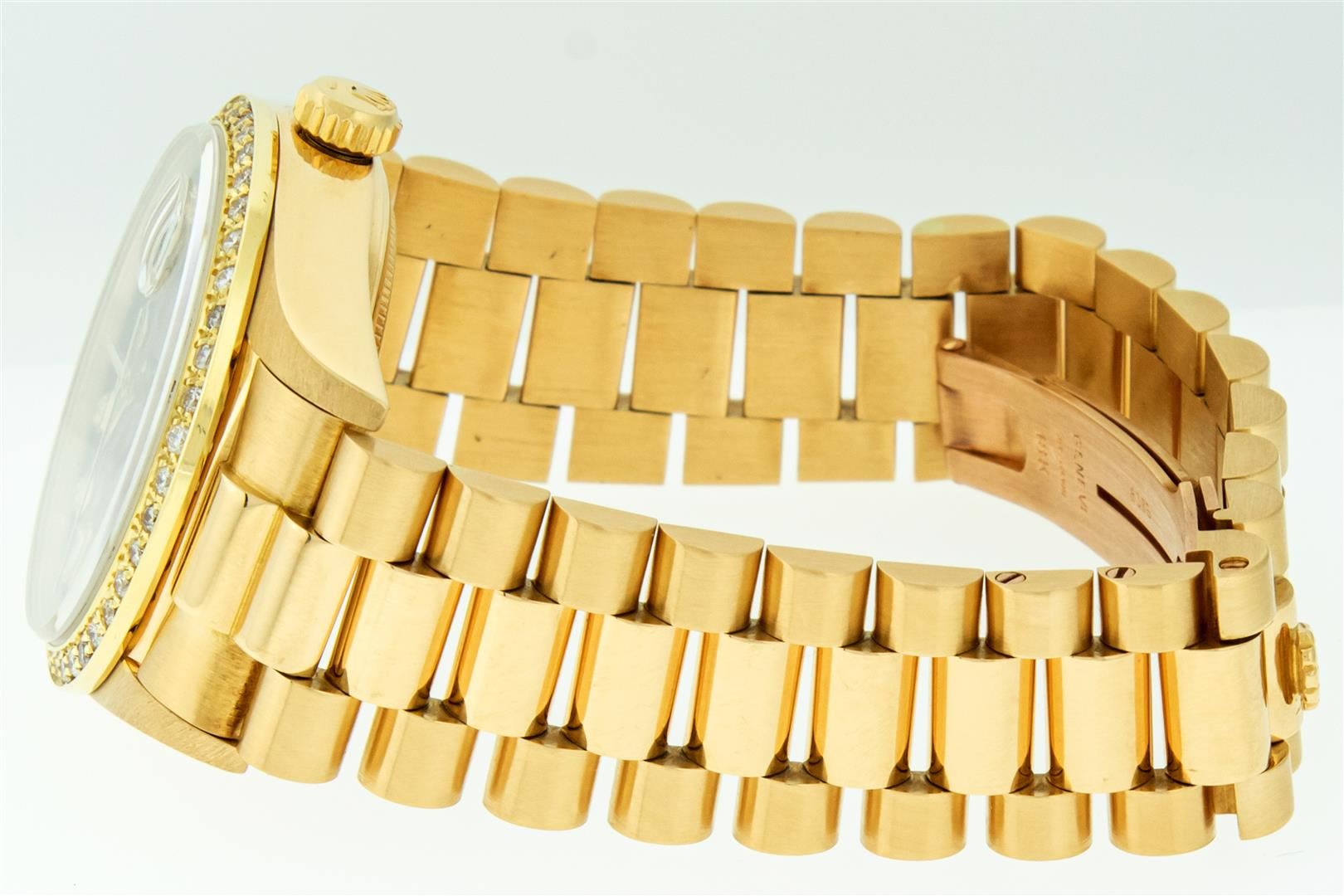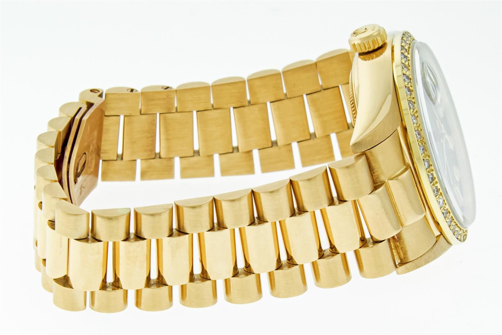 One Men's Rolex Day Date 18K Yellow Gold President Polished, Serviced & Electronically Tested, Rolex 18K Yellow Gold Case: 36mm, Rolex 18K Yellow Gold Crown, Custom Bezel: New 18K Yellow Gold Beadset Diamond Bezel, Diamond Count 44 Diamonds On Bezel. Total Weight 1.0 Carat, Clarity: SI-VS, Color: G to H. Custom Crystal: New Sapphire With Magnified Date Window. Custom Hands: New Luminescent Hands. Rolex Movement: Automatic Winding Movement Caliber 3055. Custom Dial: Refinished To Black With Custom Added Diamond Hour Markers, Diamond Count: 8 Diamonds + 2 Baguettes, Color: G to H, Clarity: VS. Date Window: 3 O'clock Position Date Display, Day Window: 12 O'clock Position Date Display. Quickset, Model: Day Date President. Condition: G-6 Extra Fine. Bracelet: New 18K Yellow Gold President Band. Bright Polish. 7.0 Inch Length, Standard Hidden President Clasp President Band, With Rolex Logo. This Pre Owned Watch Has Been Serviced And Polished It Is Free Of All Scratches And Dents. This Watch Comes With A Rolex Box.