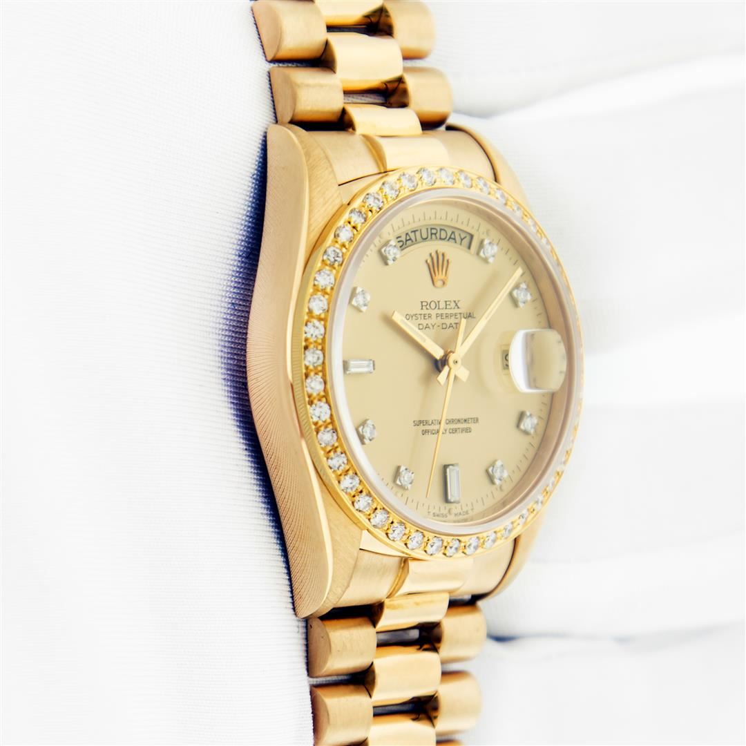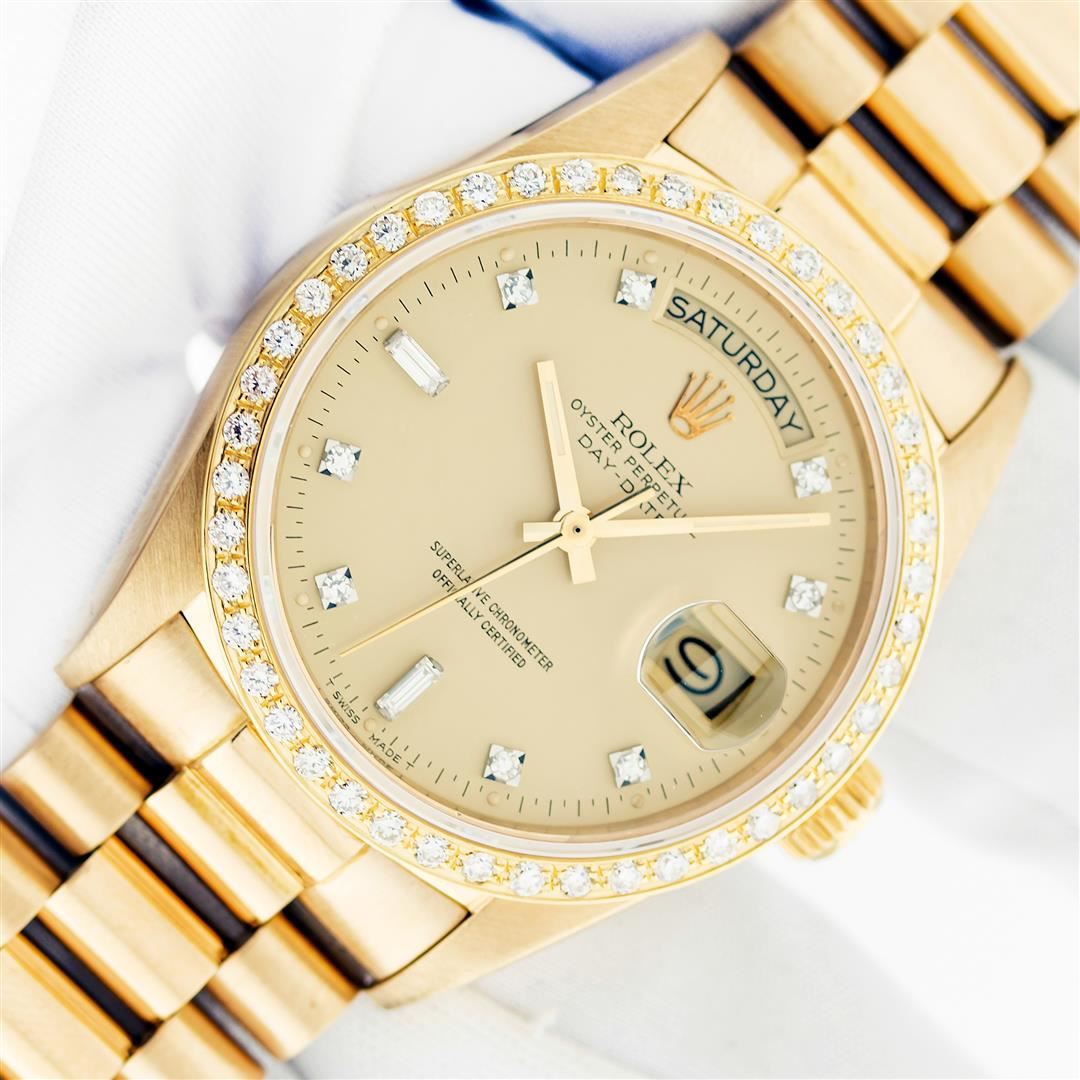 One Mens Rolex Day Date 18K Yellow Gold President Polished, Serviced & Electronically Tested, Rolex 18K Yellow Gold Case: 36mm, Rolex 18K Yellow Gold Crown, Custom Bezel: New 18K Yellow Gold Beadset Diamond Bezel, Diamond Count 44 Diamonds On Bezel. Total Weight 1.0 Carat, Clarity: SI-VS, Color: G to H. Custom Crystal: New Sapphire With Magnified Date Window. Custom Hands: New Luminescent Hands. Rolex Movement: Automatic Winding Movement Caliber 3055. Rolex Dial: Factory Champagne Diamond Dial, Diamond Count: 8 Diamonds + 2 Baguettes, Clarity: VS. Date Window: 3 O'Clock Position Date Display, Day Window: 12 O'Clock Position Date Display. Quickset, Model: Day Date President. Condition: G-6 Extra Fine. Rolex Bracelet: New 18K Yellow Gold President Band. Bright Polish. 7.0 Inch Length, Standard Hidden President Clasp President Band, With Rolex Logo. This Pre Owned Watch Has Been Serviced And Polished It Is Free Of All Scratches And Dents. This Watch Comes With A Rolex Box.