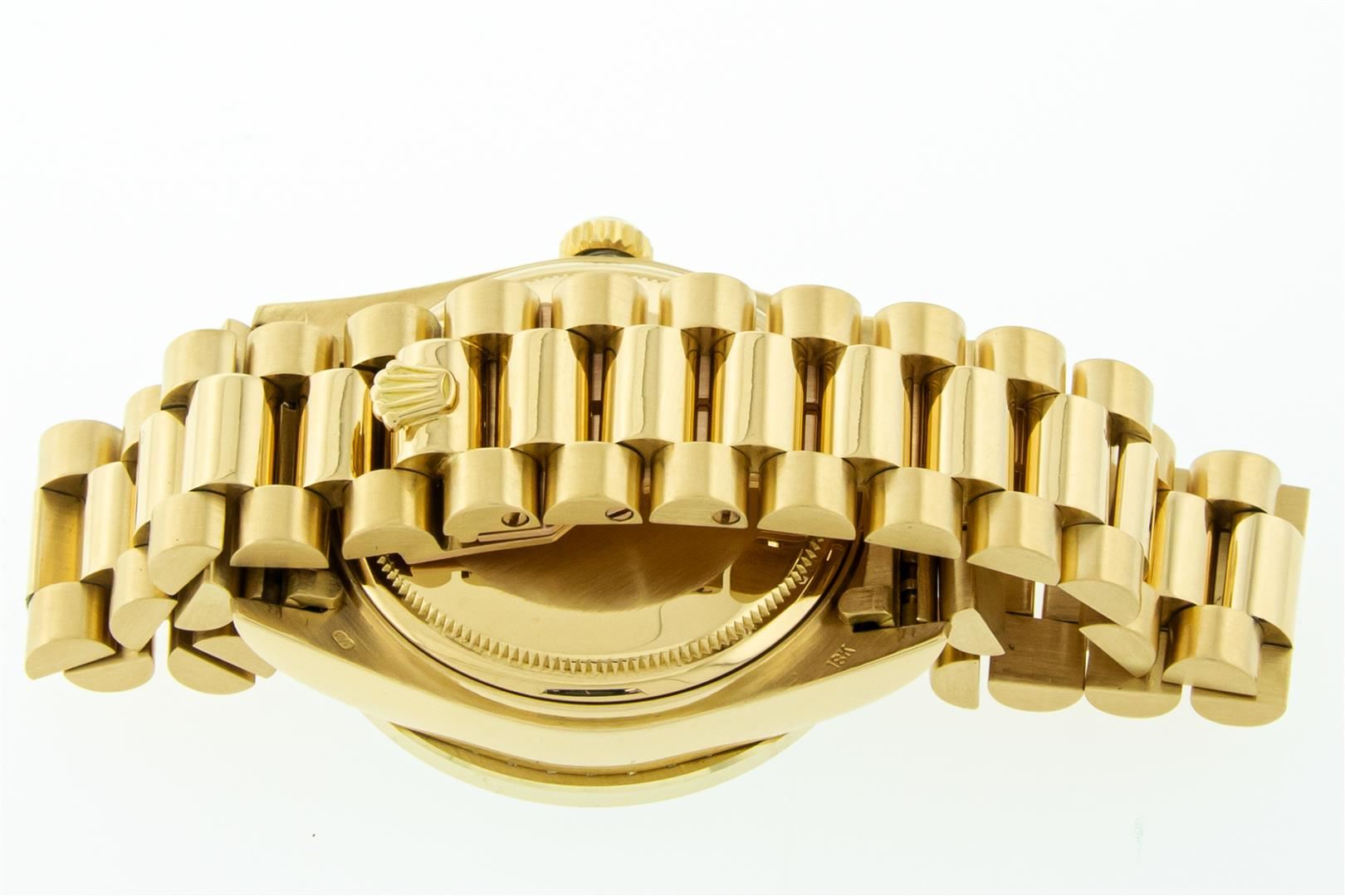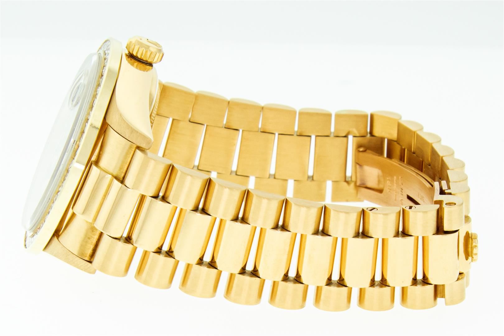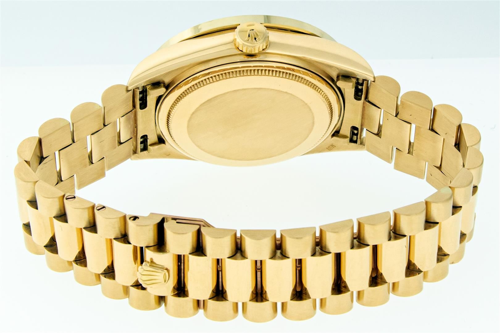 One Men's Rolex Day Date 18K Yellow Gold President Polished, Serviced & Electronically Tested, 18K Yellow Gold Case: 36mm, Rolex 18K Yellow Gold Crown, Custom Bezel: New 14K Yellow Gold Princess Cut Diamond Bezel, Diamond Count: 53 Diamonds On Bezel. Total Weight 2.75 Carat, Clarity: SI-VS, Color: G to H. Custom Crystal: New Sapphire With Magnified Date Window. Custom Hands: New Luminescent Hands. Rolex Movement: Automatic Winding Movement Caliber 3055. Custom Dial: Refinished To Green Vignette With Custom Added Diamond Hour Markers. Diamond Count: 8 Diamonds + 2 Diamond Baguettes, Color: G To H, Clarity: SI-VS. Date Window: 3 O'clock Position Date Display, Day Window: 12 O'clock Position Date Display. Quickset, Model: Day Date President. Condition: G-6 Extra Fine The Watch Is In Very Good Condition Free Of All Scratches And Dents. Rolex Bracelet: 18K Yellow Gold President. Bright Polish. 7.0 Inch Length, Standard Hidden President Clasp President Band, With Rolex Logo. This Pre Owned Watch Has Been Serviced And Polished It Is Free Of All Scratches And Dents. This Watch Comes With a Rolex Box and Booklet.