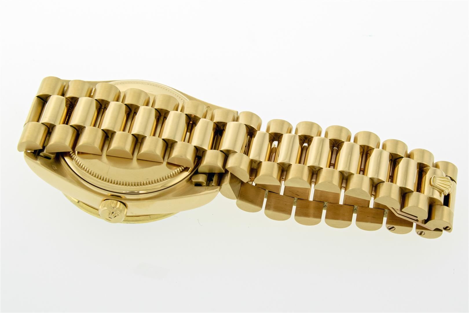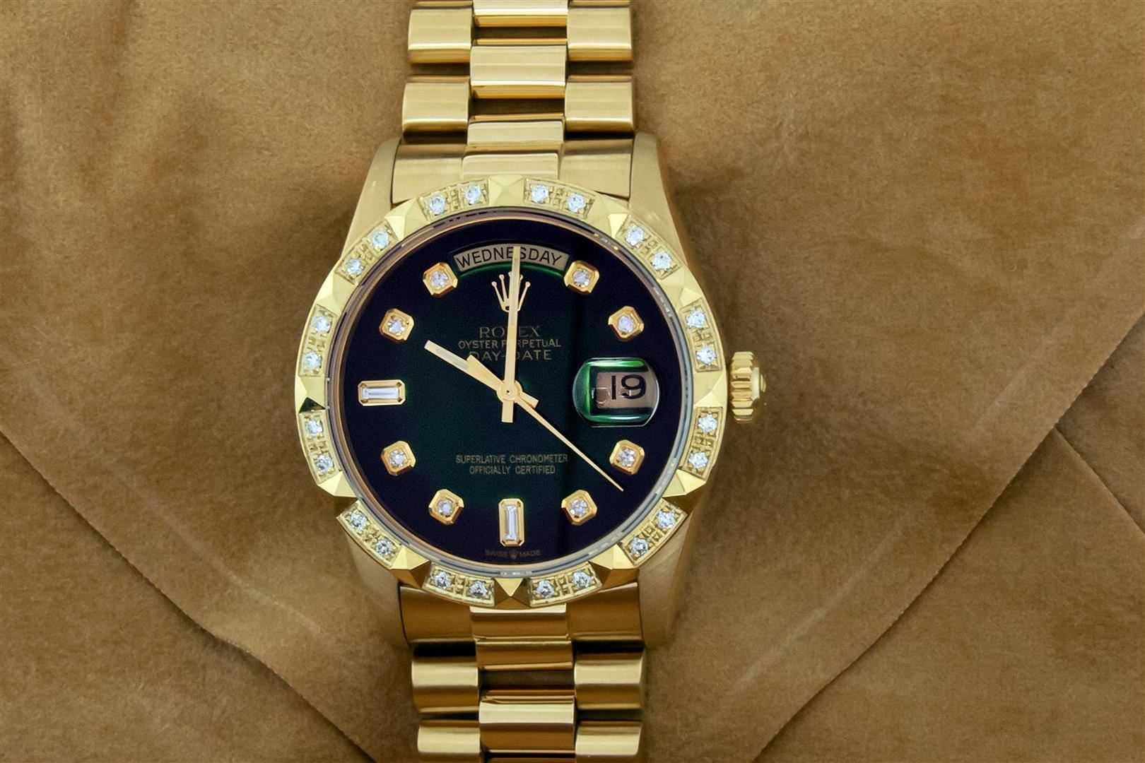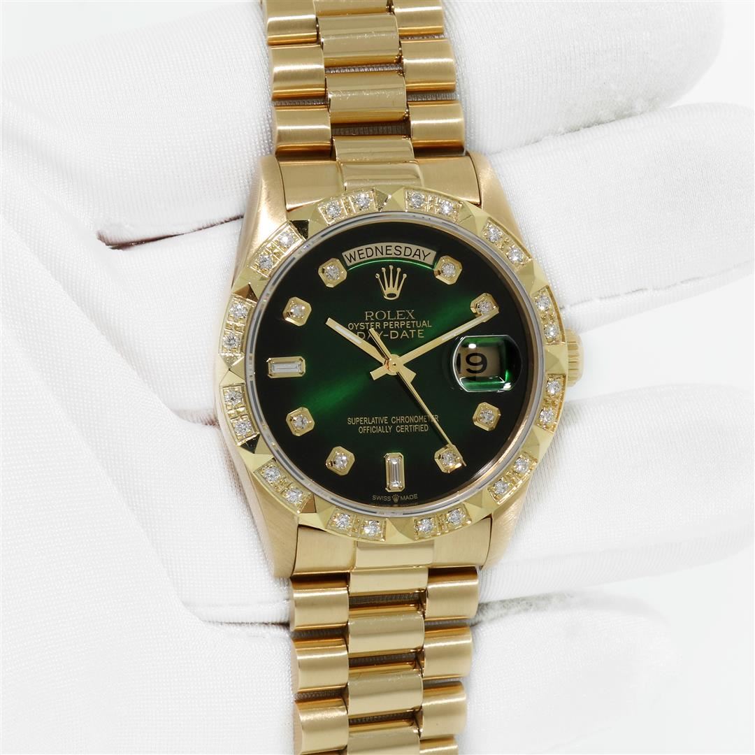 One Men's Rolex Day Date 18K Yellow Gold President Polished, Serviced & Electronically Tested, 18K Yellow Gold Case: 36mm, Custom Bezel: 18K Yellow Gold Pyramid Beadset Diamond Bezel, Diamond Count: 24 Diamonds On Bezel. Clarity: SI-VS, Color: G to H. Custom Crystal: New Sapphire with Date Window. Rolex Movement: Automatic Winding Movement. Custom Dial: Refinished To Green with Custom Added Diamond Hour Markers, Diamond Count: 8 Diamonds + 2 Diamond Baguettes On Dial, Color: G to H, Clarity: SI-VS. Date Window: 3 O'Clock Position Date Display, Day Window: 12 O'Clock Position Date Display. Quickset, Model: Day Date President. Condition: G-6 Extra Fine The Watch Is In Very Good Condition Free Of All Scratches And Dents. Rolex Bracelet: 18K Yellow Gold President Band. Bright Polish. 7.0 Inch Length, Standard Hidden President Clasp President Band, with Rolex Logo. This Pre Owned Watch Comes with A Rolex Box.