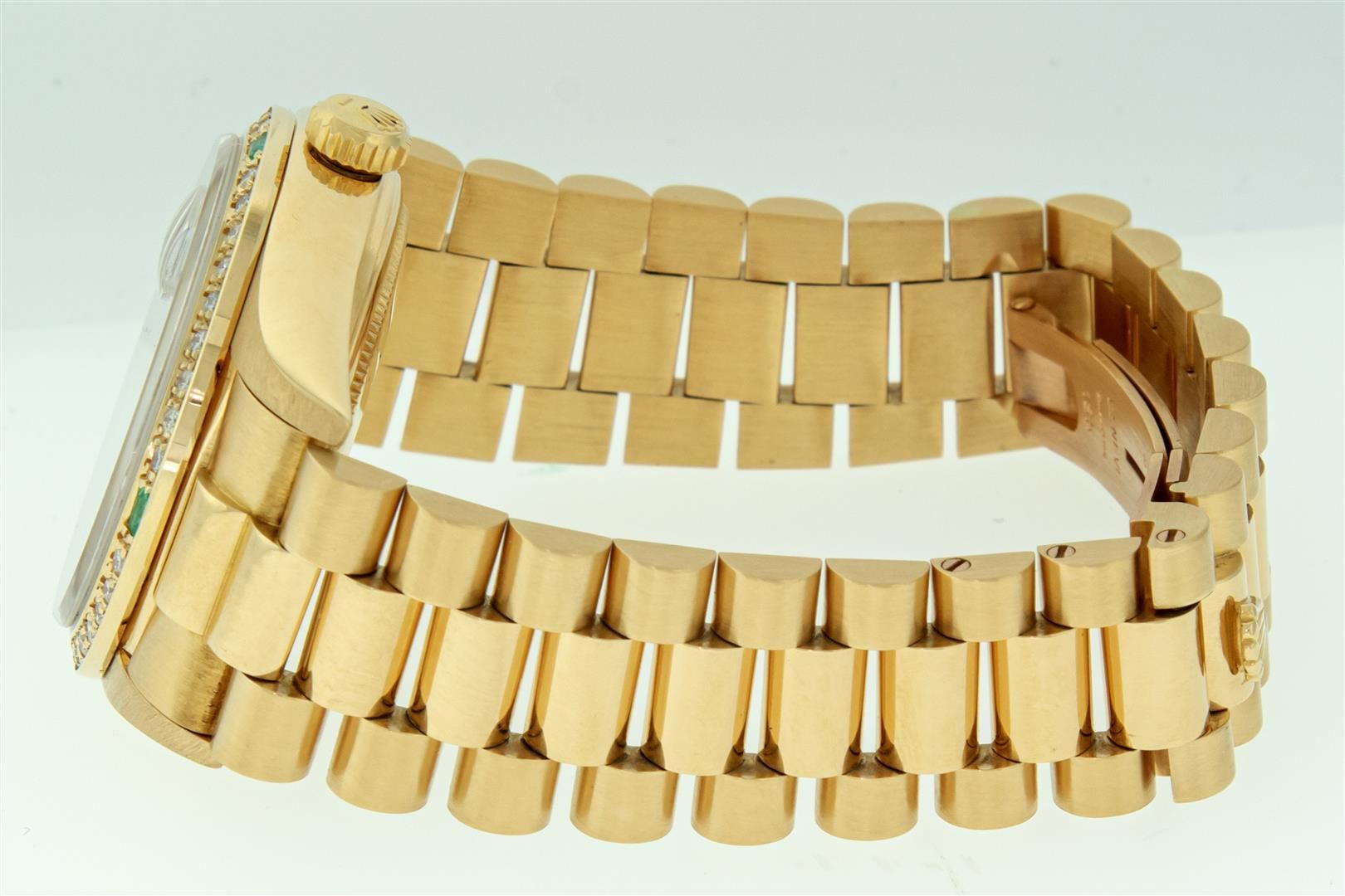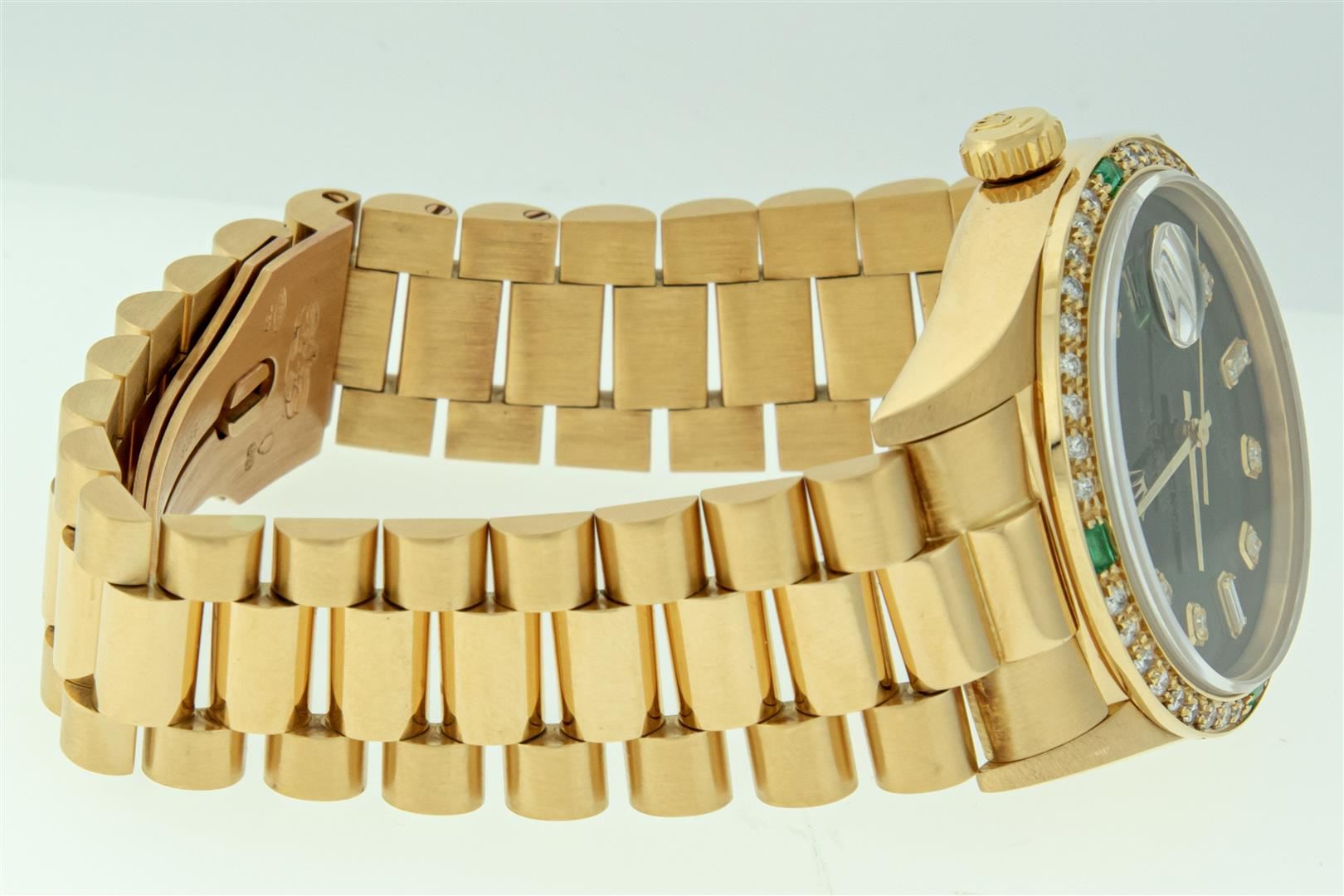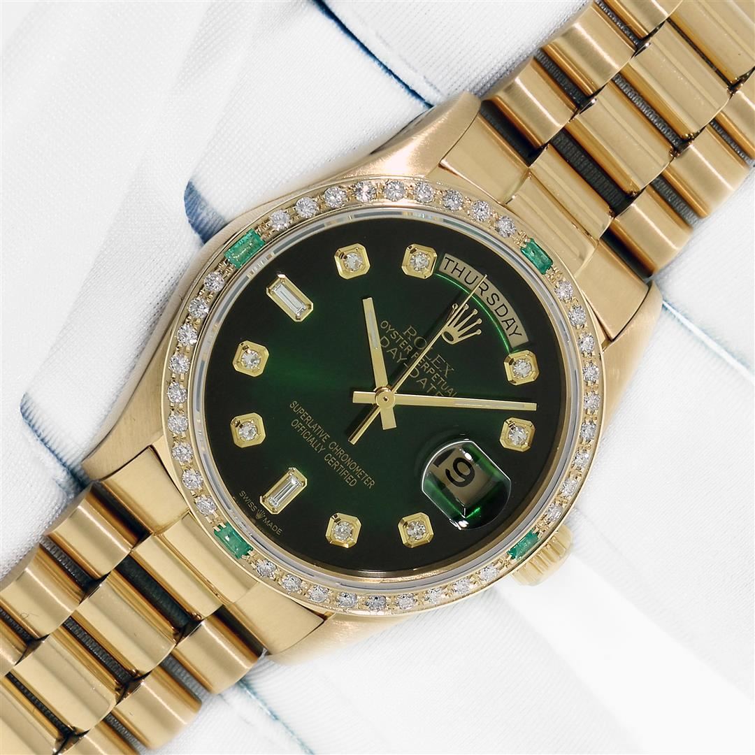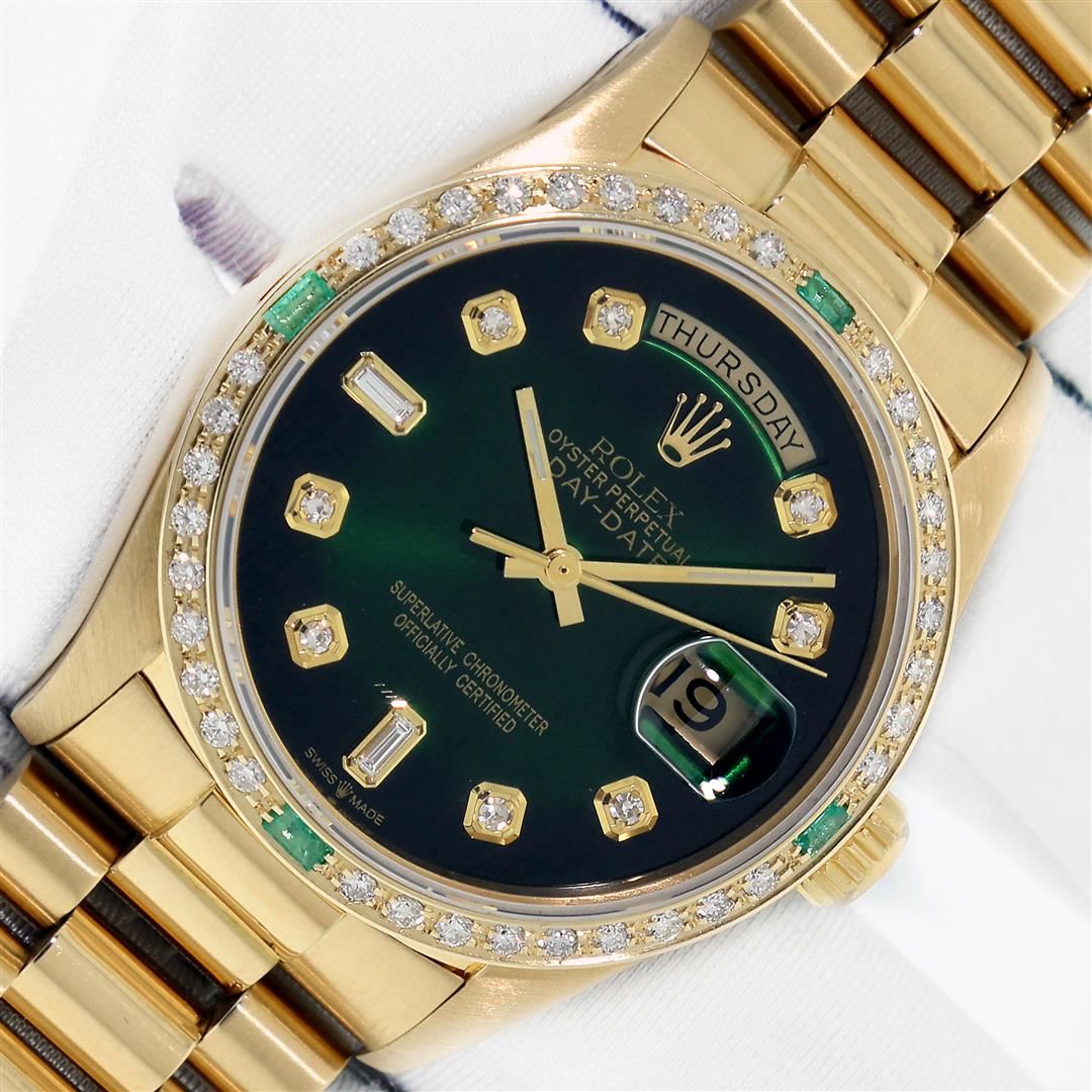 One Men's Pre Owned Rolex Day Date 18K Yellow Gold President Polished, Serviced & Electronically Tested, Rolex 18K Yellow Gold Case: 36mm, Rolex 18K Yellow Gold Crown, Custom Bezel: New 18K Yellow Gold Diamond Bezel, Diamond Count 36 Diamonds + 4 Emeralds On Bezel, Clarity: SI-VS, Color: G to H. Custom Crystal: New Sapphire with Date Window. Custom Hands: New Luminescent Hands. Rolex Movement: Automatic Winding Movement Caliber 3055. Custom Dial: Refinished To Green with Custom Added Diamonds On Dial, Diamond Count: 8 Diamonds + 2 Baguettes, Color: G to H, Clarity: VS. Date Window: 3 O'Clock Position Date Display, Day Window: 12 O'Clock Position Date Display. Quickset, Model: Day Date President. Condition: G-6 Extra Fine The Watch Is In Very Good Condition Free Of All Scratches And Dents. Rolex Bracelet: 18K Yellow Gold President Band. Bright Polish. 7.0 Inch Length, Standard Hidden President Clasp President Band, with Rolex Logo.