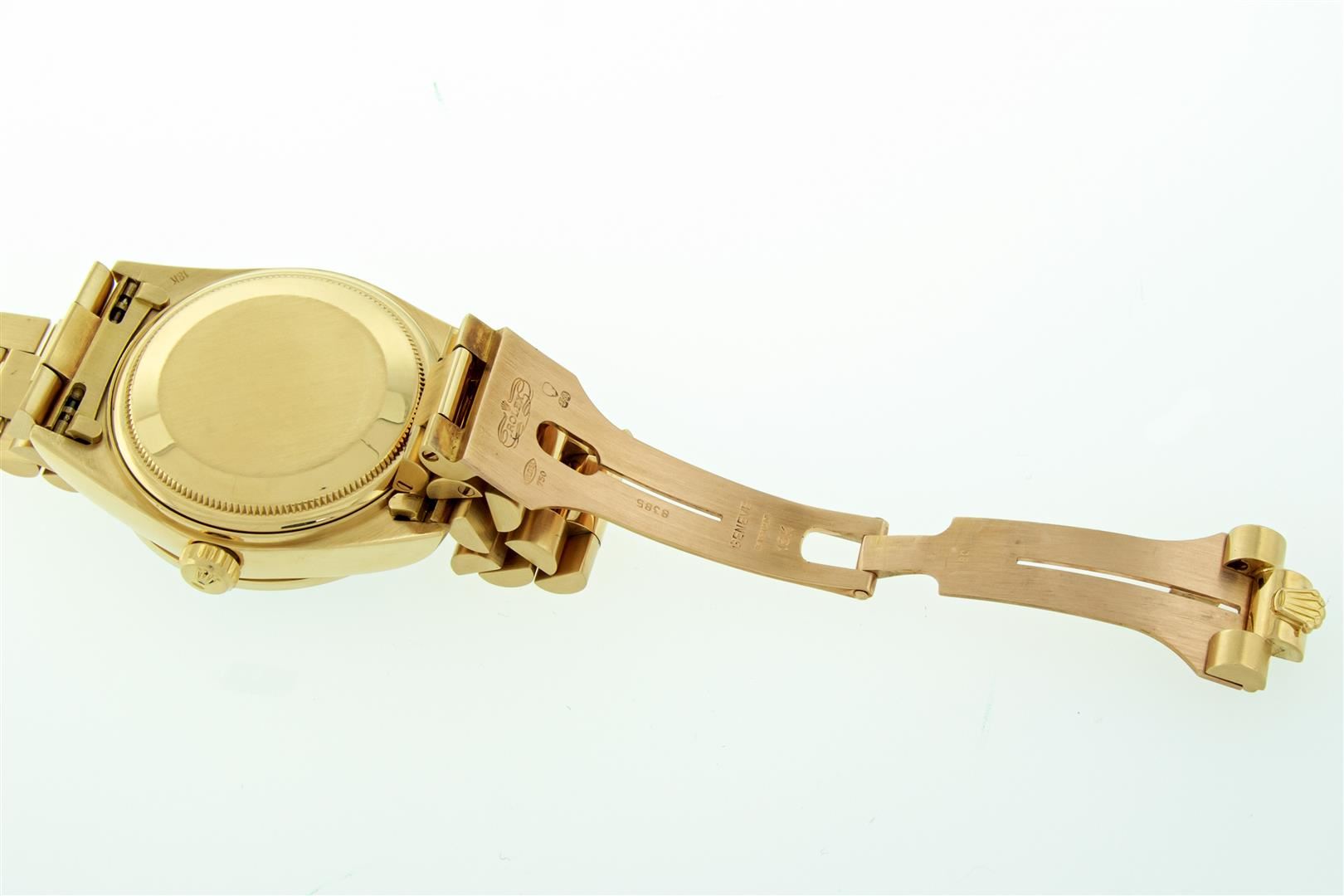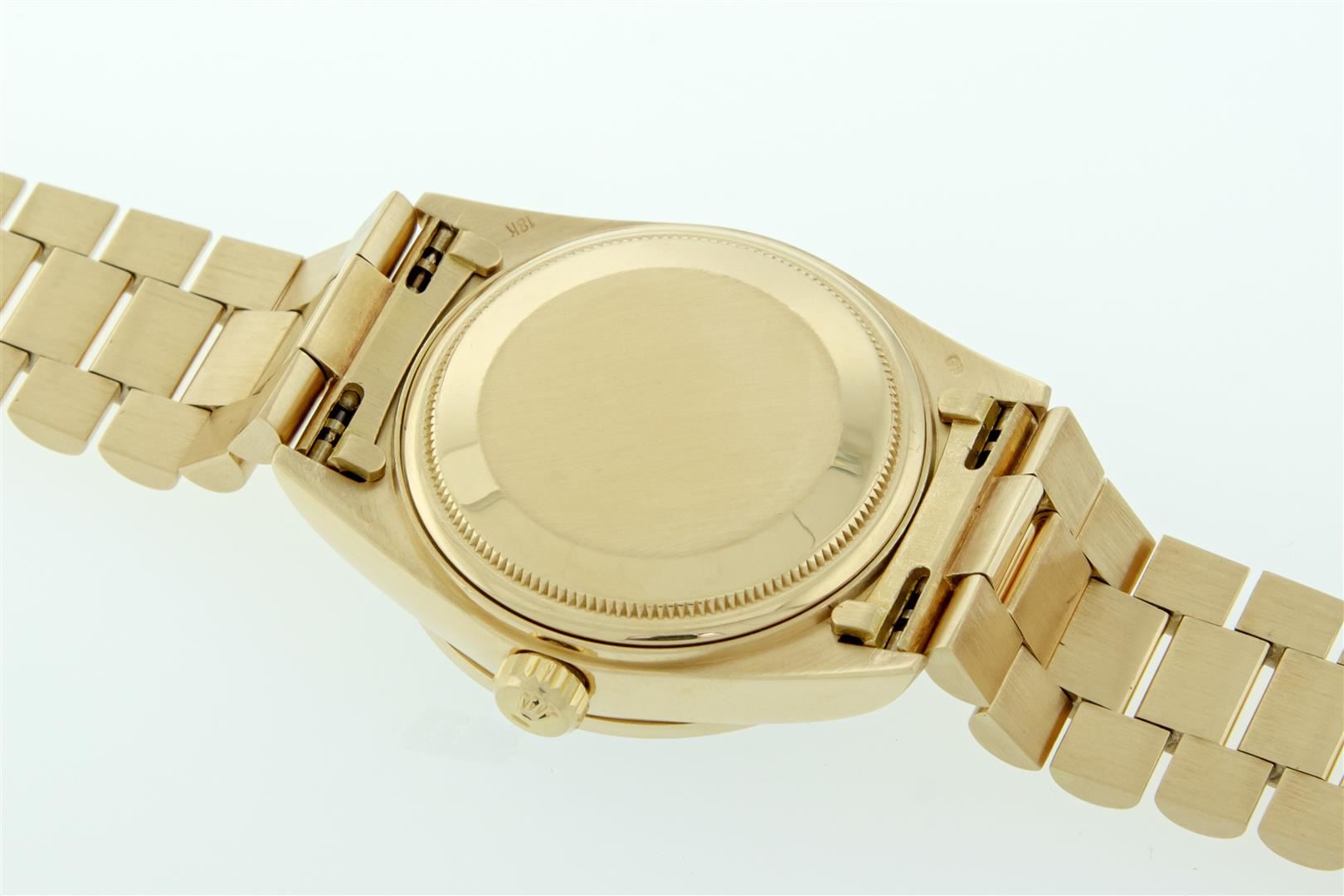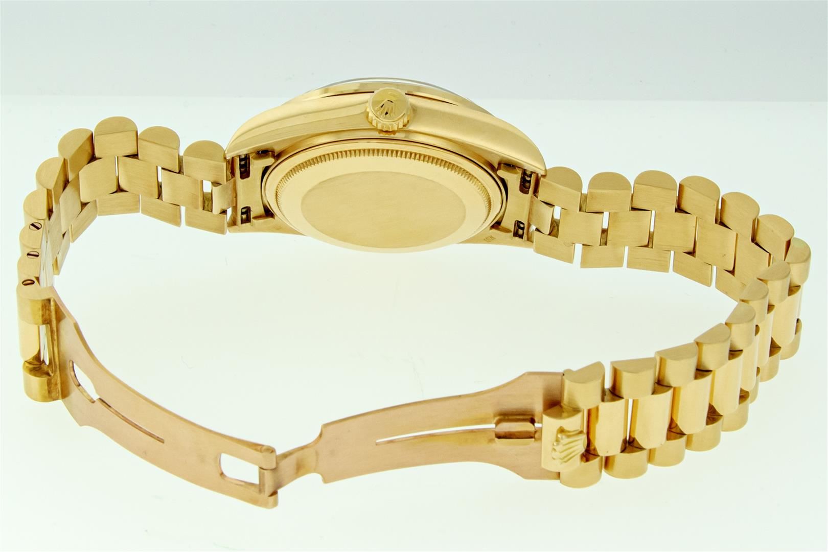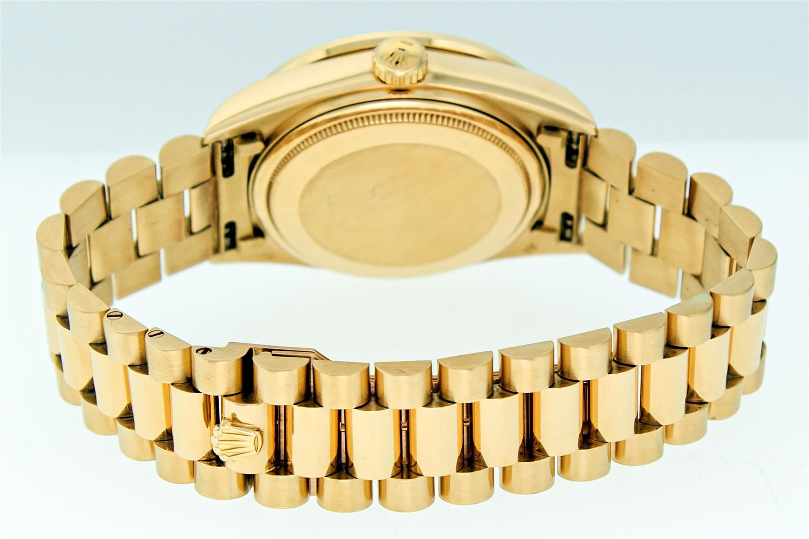 One Men's Pre Owned Rolex Day Date 18K Yellow Gold President Polished, Serviced & Electronically Tested, Rolex 18K Yellow Gold Case: 36mm, Rolex 18K Yellow Gold Crown, Custom Bezel: New 18K Yellow Gold Diamond Bezel, Diamond Count 36 Diamonds + 4 Emeralds On Bezel, Clarity: SI-VS, Color: G to H. Custom Crystal: New Sapphire with Date Window. Custom Hands: New Luminescent Hands. Rolex Movement: Automatic Winding Movement Caliber 3055. Custom Dial: Refinished To Green with Custom Added Diamonds On Dial, Diamond Count: 8 Diamonds + 2 Baguettes, Color: G to H, Clarity: VS. Date Window: 3 O'Clock Position Date Display, Day Window: 12 O'Clock Position Date Display. Quickset, Model: Day Date President. Condition: G-6 Extra Fine The Watch Is In Very Good Condition Free Of All Scratches And Dents. Rolex Bracelet: 18K Yellow Gold President Band. Bright Polish. 7.0 Inch Length, Standard Hidden President Clasp President Band, with Rolex Logo.