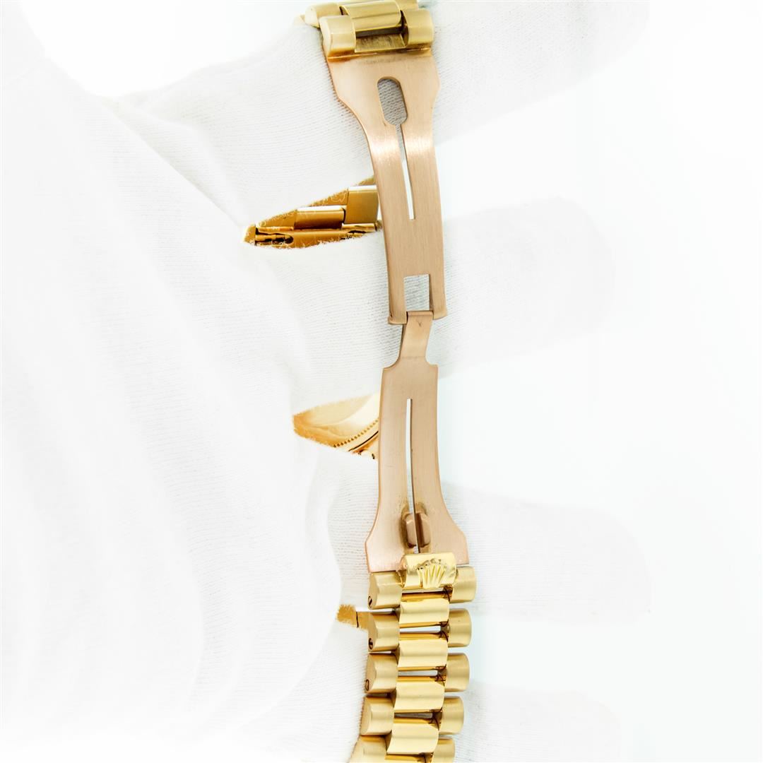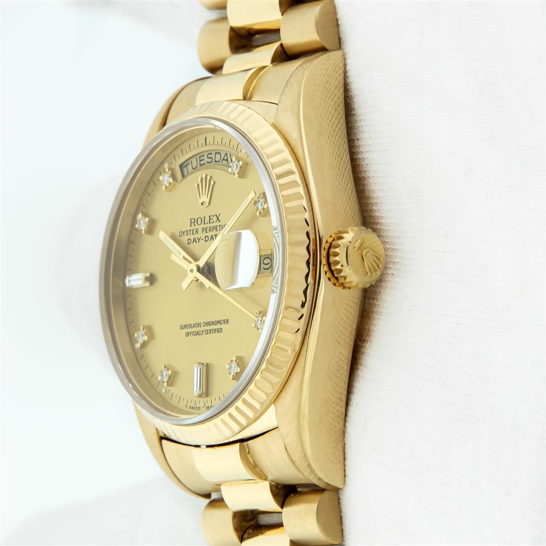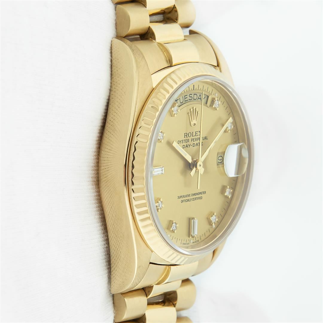 One Mens Pre Owned Quickset Rolex Day Date 18K Yellow Gold President Polished, Serviced & Electronically Tested, Rolex 18K Yellow Gold Case: 36mm, Rolex 18K Yellow Gold Crown, Rolex Bezel: 18K Yellow Gold Fluted Bezel. Custom Crystal: New Sapphire With Magnified Date Window. Rolex Movement: Automatic Quickset Winding Movement Caliber 3055. Rolex Dial: Factory Champagne Diamond Dial, Stone Count: 8 Diamonds + 2 Baguette Diamonds, Clarity: VS. Date Window: 3 O'Clock Position, Day Display: 12 O'Clock Position, Single Quickset, Model: Day Date President. Condition: G-6 Extra Fine. Rolex Bracelet: 18K Yellow Gold President Band With Hidden Clasp, Bright & Satin Polish. 7.0 Inch Length, Standard President Clasp, With Rolex Logo. This Pre Owned Watch Has Been Serviced And Polished It Is Free Of All Scratches And Dents.
