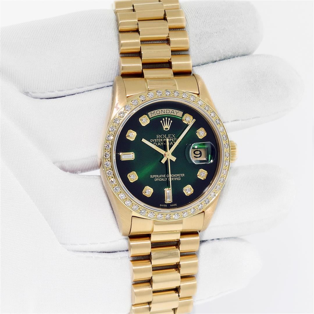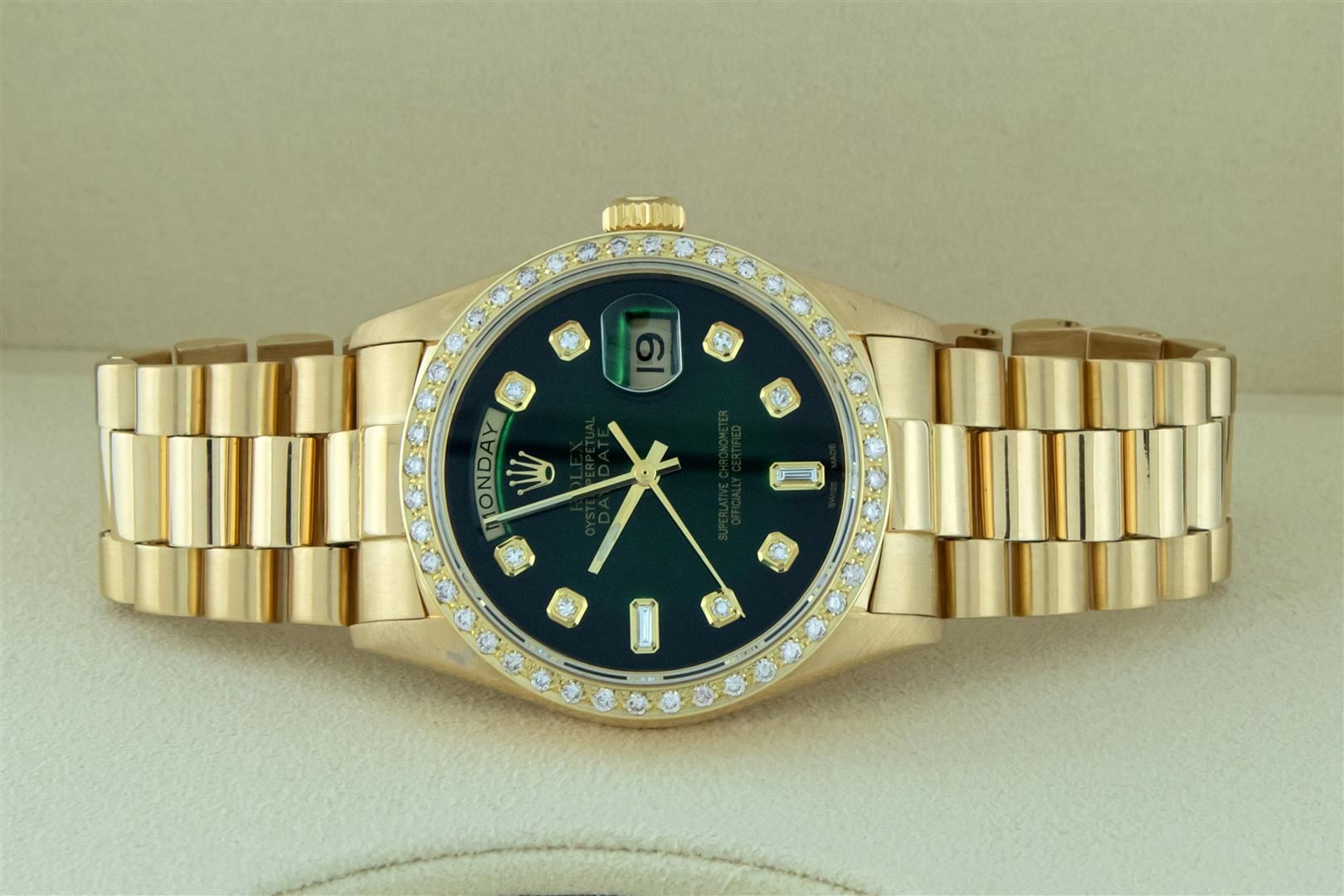 One Mens Rolex Day Date 18K Yellow Gold President Polished, Serviced & Electronically Tested, 18K Yellow Gold Case: 36mm, 18K Yellow Gold Crown, Custom Bezel: New 18K Yellow Gold Beadset Diamond Bezel, Diamond Count 44 Diamonds On Bezel. Total Weight 1.0 Carat, Clarity: SI-VS, Color: G to H. Custom Crystal: New Sapphire With Date Window. Custom Hands: New Luminescent Hands. Rolex Movement: Automatic Winding Movement Caliber 3055. Custom Dial: Refinished To Green With Custom Added Diamonds, Diamond Count: 8 Diamonds + 2 Baguettes, Color: G to H, Clarity: VS. Date Window: 3 O'Clock Position Date Display, Day Window: 12 O'Clock Position Date Display. Quickset, Model: Day Date President. Condition: G-6 Extra Fine. The Watch Is In Very Good Condition Free Of All Scratches And Dents. Rolex Bracelet: 18K Yellow Gold President Band. Bright Polish. 7.0 Inch Length, Standard Hidden President Clasp President Band, With Rolex Logo. This Pre Owned Watch Comes With A Rolex Box.