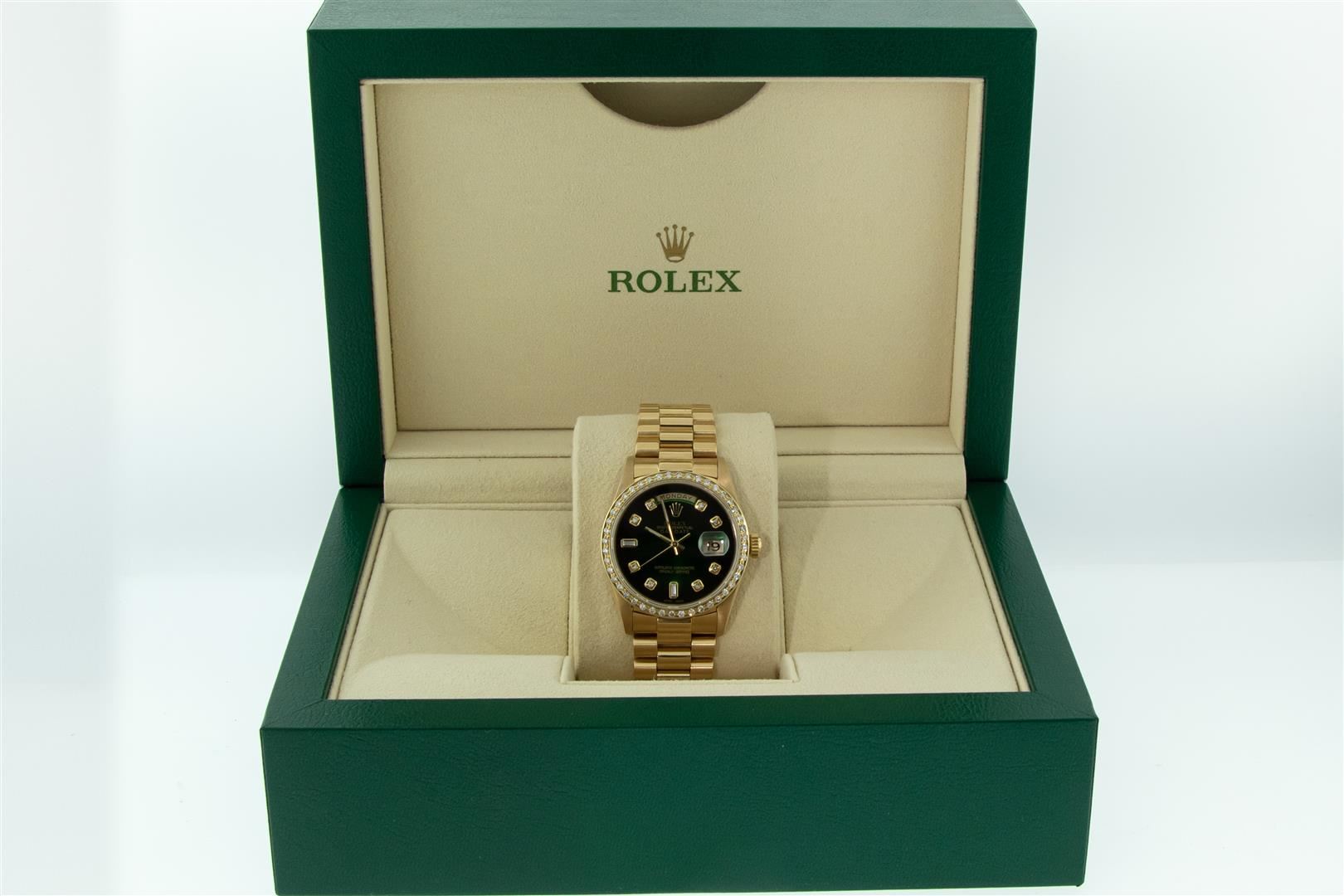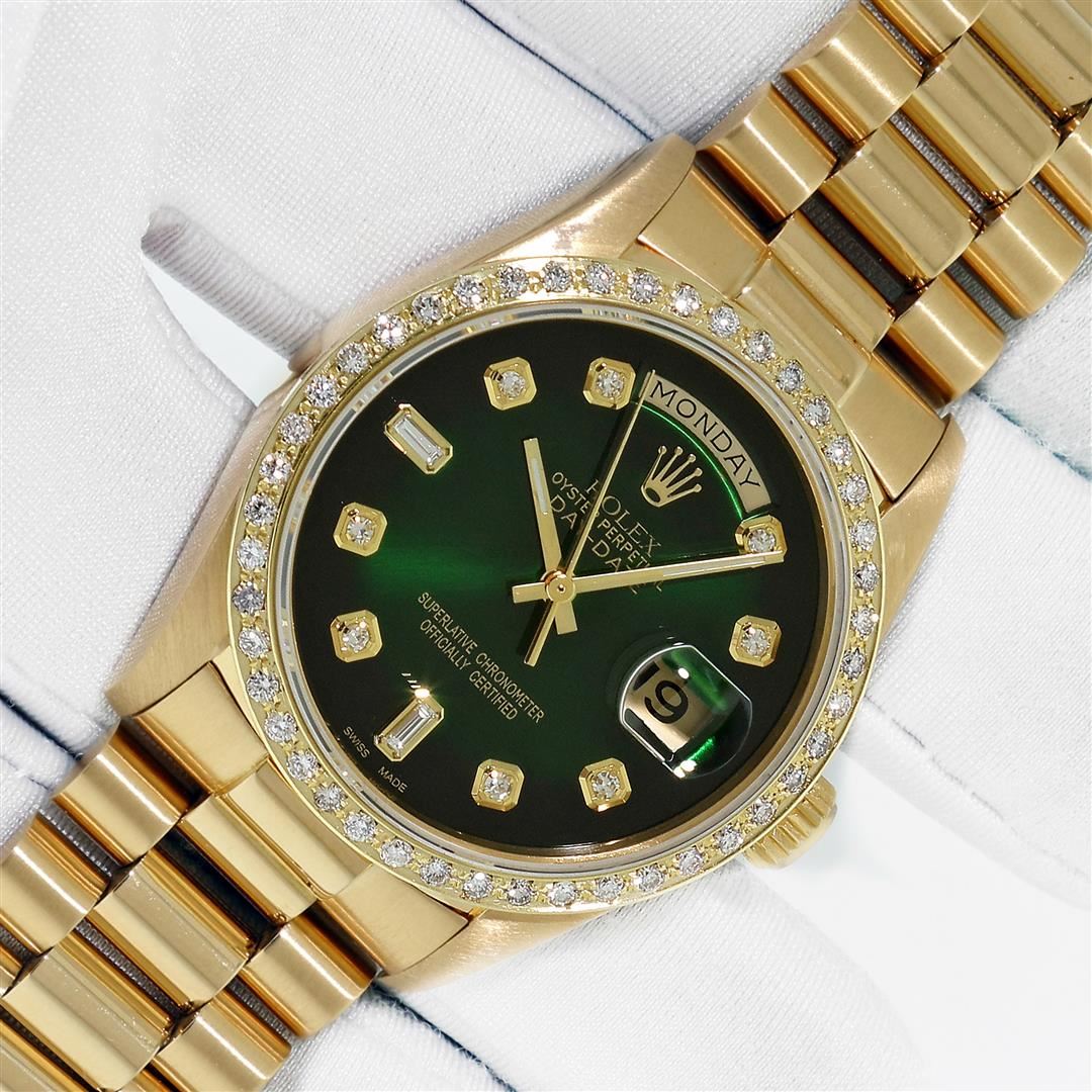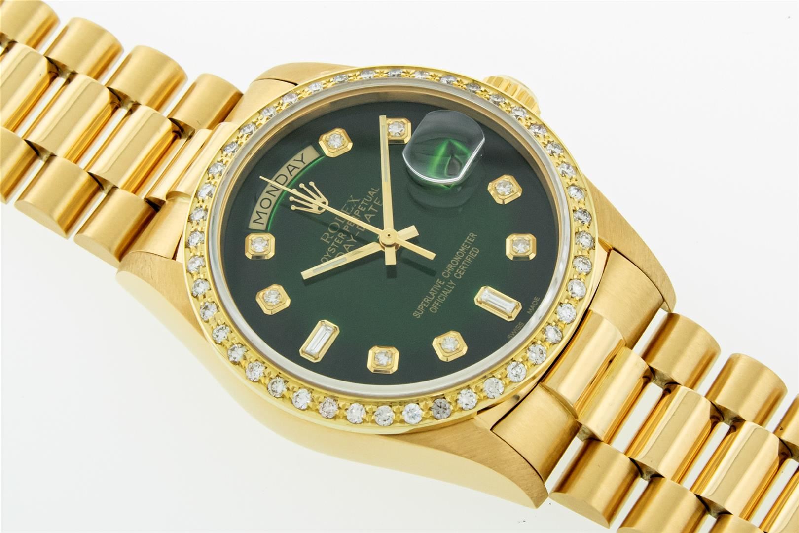 One Mens Rolex Day Date 18K Yellow Gold President Polished, Serviced & Electronically Tested, 18K Yellow Gold Case: 36mm, 18K Yellow Gold Crown, Custom Bezel: New 18K Yellow Gold Beadset Diamond Bezel, Diamond Count 44 Diamonds On Bezel. Total Weight 1.0 Carat, Clarity: SI-VS, Color: G to H. Custom Crystal: New Sapphire With Date Window. Custom Hands: New Luminescent Hands. Rolex Movement: Automatic Winding Movement Caliber 3055. Custom Dial: Refinished To Green With Custom Added Diamonds, Diamond Count: 8 Diamonds + 2 Baguettes, Color: G to H, Clarity: VS. Date Window: 3 O'Clock Position Date Display, Day Window: 12 O'Clock Position Date Display. Quickset, Model: Day Date President. Condition: G-6 Extra Fine. The Watch Is In Very Good Condition Free Of All Scratches And Dents. Rolex Bracelet: 18K Yellow Gold President Band. Bright Polish. 7.0 Inch Length, Standard Hidden President Clasp President Band, With Rolex Logo. This Pre Owned Watch Comes With A Rolex Box.