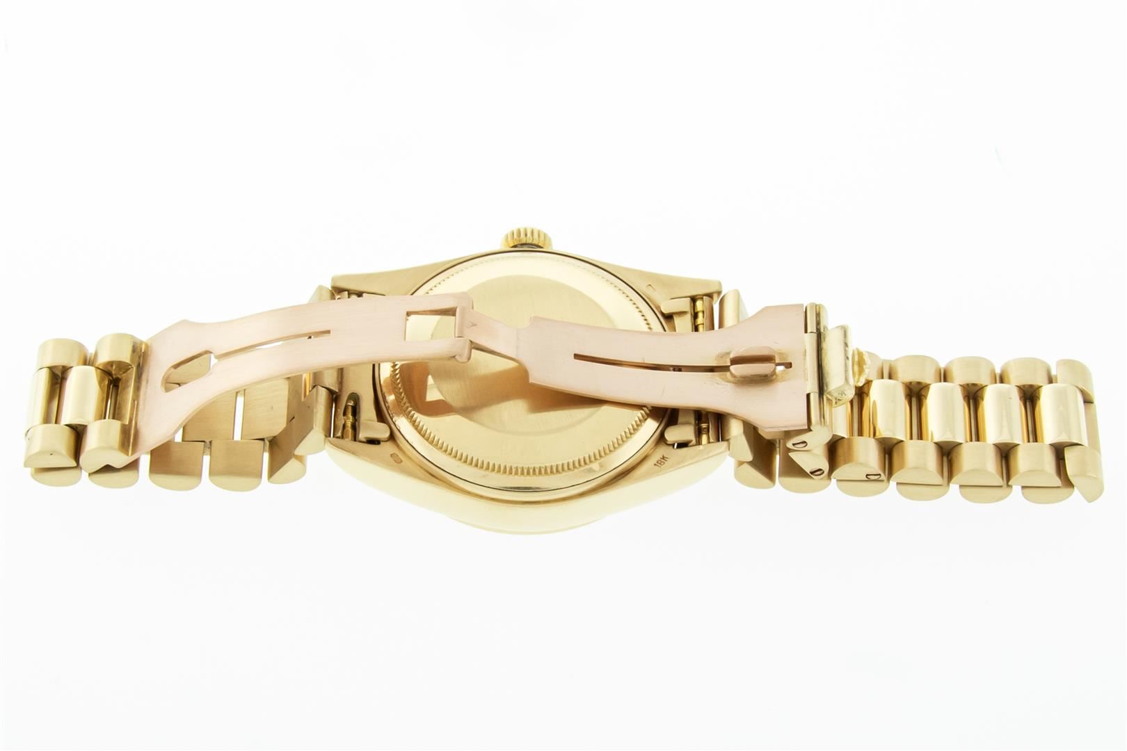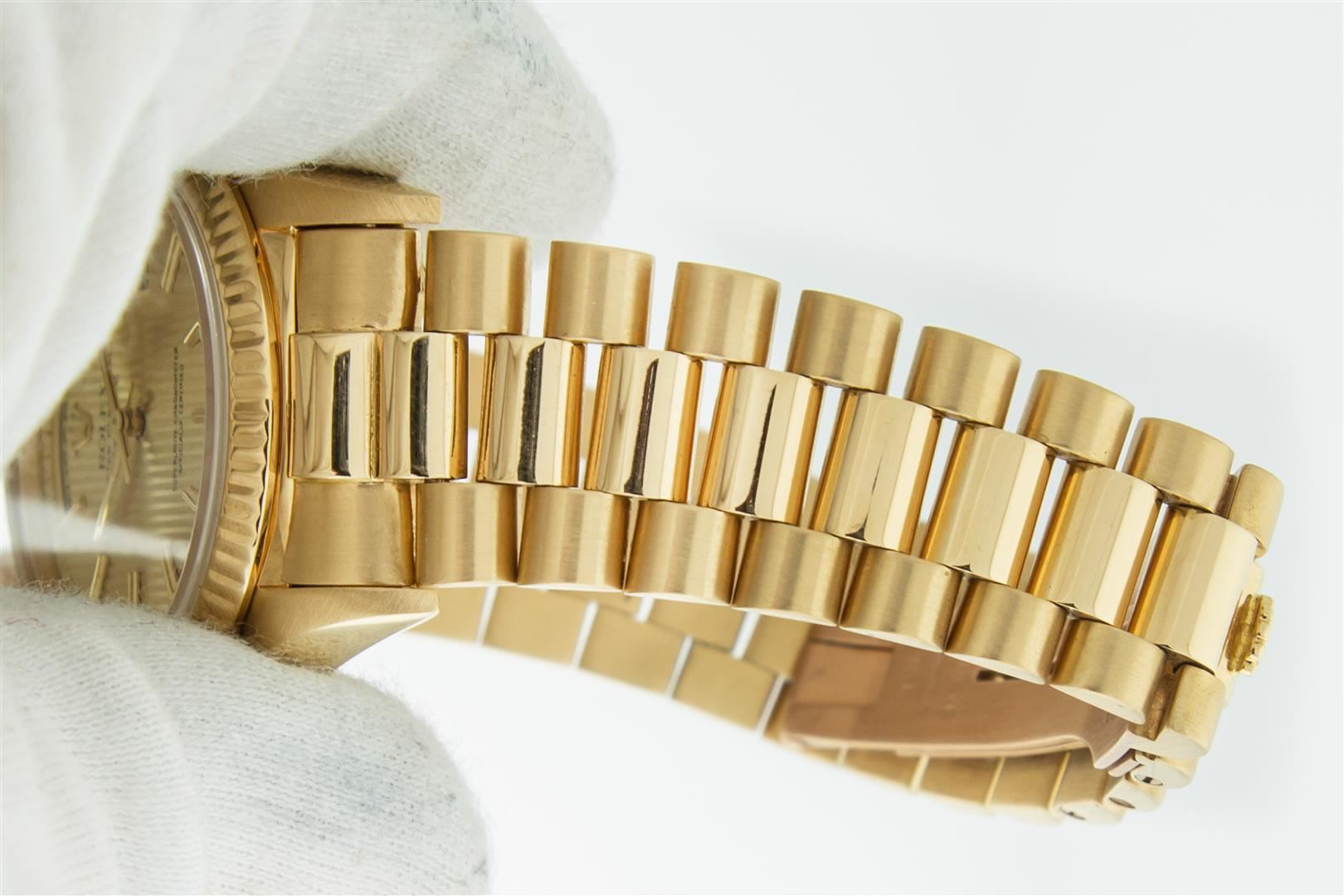 One Men's Pre Owned Quickset Rolex Day Date 18K Yellow Gold President Polished, Serviced & Electronically Tested, Rolex 18K Yellow Gold Case: 36mm, Rolex 18K Yellow Gold Crown, Rolex Bezel: 18K Yellow Gold Fluted Bezel. Crystal: Sapphire With Cyclops Lens. Rolex Movement: Automatic Quickset Winding Movement Caliber 3055. Rolex Dial: Factory Champagne Tapestry Index Dial. Date Window: 3 O'Clock Position, Day Display: 12 O'Clock Position, Single Quickset, Model: Day Date President. Condition: G-6 Extra Fine. Rolex Bracelet: 18K Yellow Gold President Band With Hidden Clasp, Bright & Satin Polish. 7.0 Inch Length, Standard President Clasp, With Rolex Logo. This Watch Comes With A Rolex Box & Booklet.