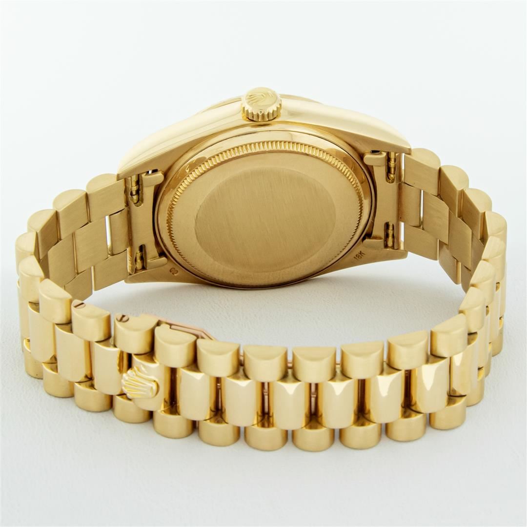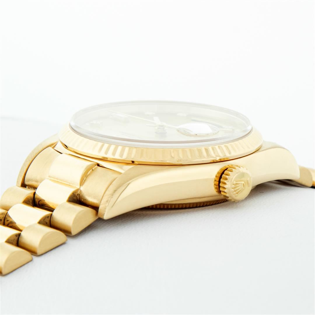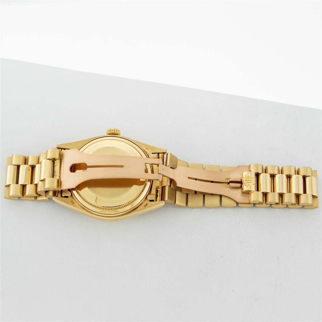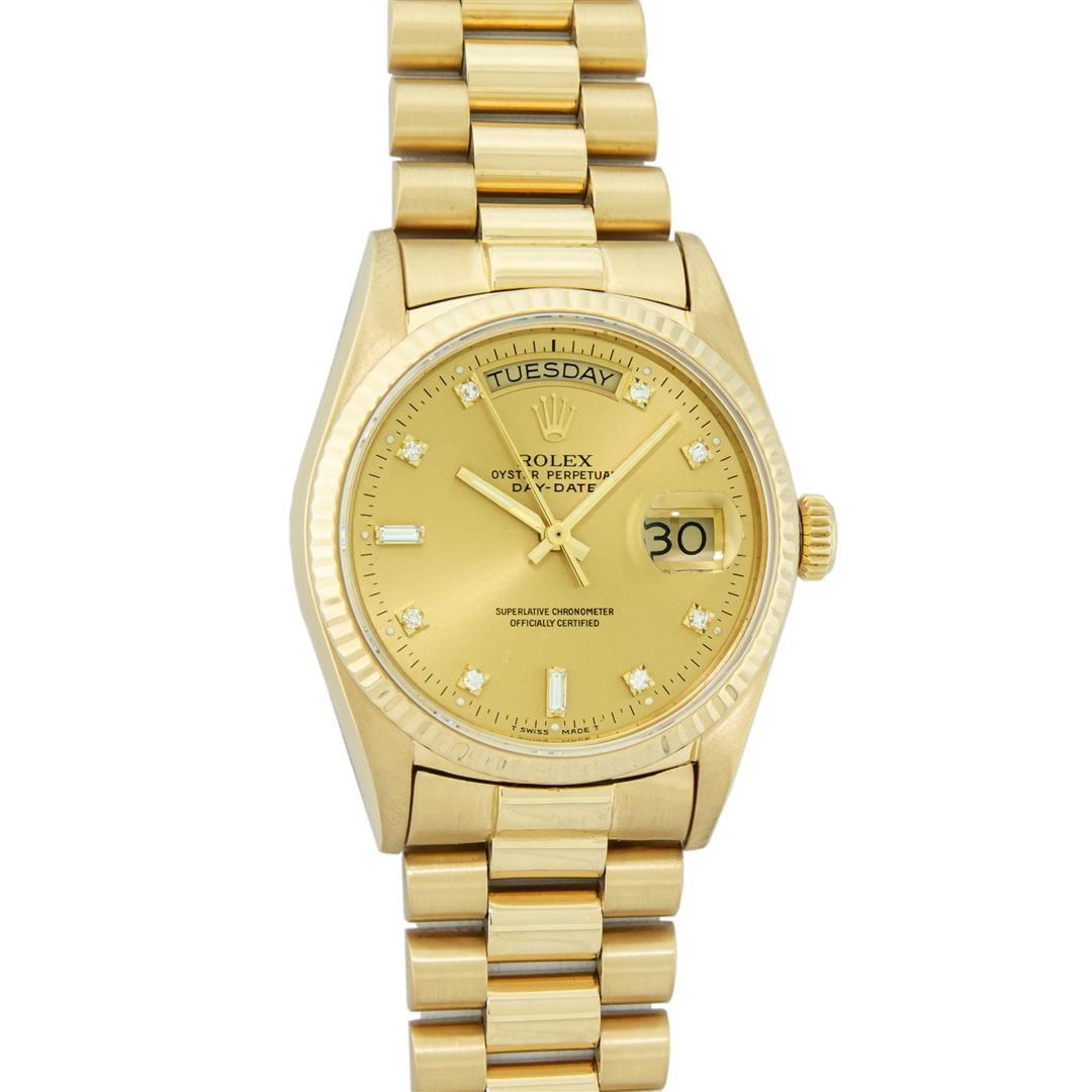 One Men's Pre Owned Quickset Rolex Day Date 18K Yellow Gold President Polished, Serviced & Electronically Tested, Rolex 18K Yellow Gold Case: 36mm, Rolex 18K Yellow Gold Crown, Rolex Bezel: 18K Yellow Gold Fluted Bezel. Rolex Crystal: Sapphire With Cyclops Lens. Rolex Movement: Automatic Quickset Winding Movement Caliber 3055. Rolex Dial: Factory Champagne Diamond Dial, Stone Count: 8 Diamonds and 2 Baguette Diamonds, Clarity: VS. Date Window: 3 O'Clock Position, Day Display: 12 O'Clock Position, Single Quickset, Model: Day Date President. Condition: G-6 Extra Fine. Rolex Bracelet: 18K Yellow Gold President Band With Hidden Clasp, Bright & Satin Polish. 7.0 Inch Length, Standard President Clasp, With Rolex Logo.