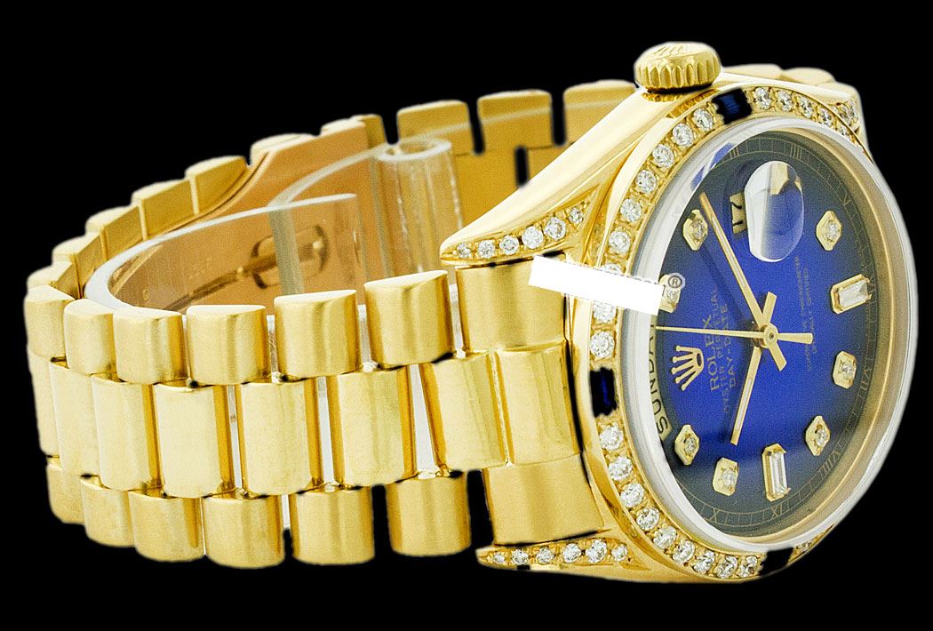 WATCH DETAILS: ITEM: WatchBRAND: RolexTYPE: PresidentFEATURE: QuickSetMODEL: DateJustMADE: Swiss MadeGENDER: Men'sCONDITION: Pre-OwnedFUNCTION: Day & DateDIAL COLOR: BlueHOUR MARKERS: 10 Round Custom Made DiamondBEZEL TYPE: Custom Made Diamond & Sapphire BezelBEZEL STONE: Diamond 1 CTW G-VVS1 & Ceylon Blue SapphireBEZEL MATERIAL: 18K GoldBRACELET TYPE: PresidentBRACELET MATERIAL: 18K GoldCLASP TYPE: Hidden ClaspCLASP MATERIAL: 18K GoldCASE STONE: .85 CTW G-VVS1 DIAMOND CUSTOMCASE SIZE: 36mmCRYSTAL: Scratch Resistance Sapphire CrystalMOVEMENT: Automatic (Self Winding)CALIBER: 3055CROWN TYPE: Screw Down CrownWATER RESISTANCE: Waterproof to 10 ATM/100 meters/330 feetMODEL #: 18038SKU #: AMPPQS94We Buy/Sell/Trade Valuable watches, Please call us