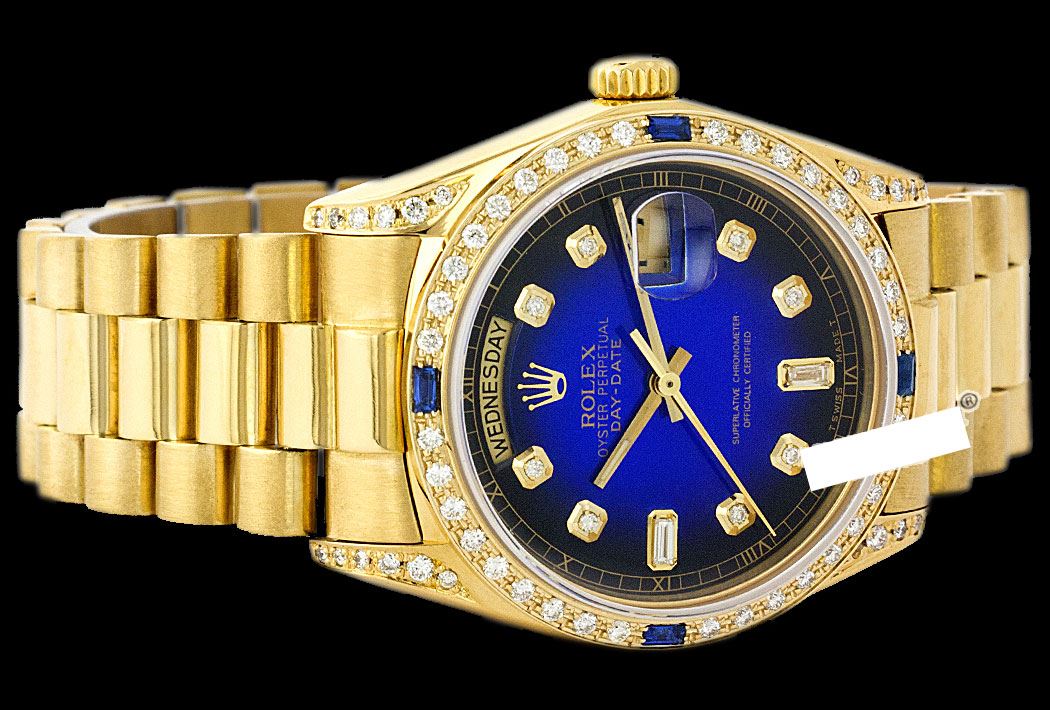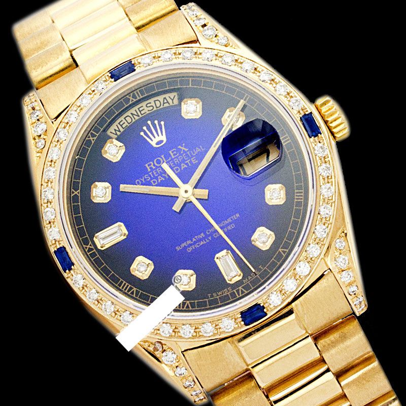 WATCH DETAILS: ITEM: WatchBRAND: RolexTYPE: PresidentFEATURE: QuickSetMODEL: DateJustMADE: Swiss MadeGENDER: Men'sCONDITION: Pre-OwnedFUNCTION: Day & DateDIAL COLOR: BlueHOUR MARKERS: 10 Round Custom Made DiamondBEZEL TYPE: Custom Made Diamond & Sapphire BezelBEZEL STONE: Diamond 1 CTW G-VVS1 & Ceylon Blue SapphireBEZEL MATERIAL: 18K GoldBRACELET TYPE: PresidentBRACELET MATERIAL: 18K GoldCLASP TYPE: Hidden ClaspCLASP MATERIAL: 18K GoldCASE STONE: .85 CTW G-VVS1 DIAMOND CUSTOMCASE SIZE: 36mmCRYSTAL: Scratch Resistance Sapphire CrystalMOVEMENT: Automatic (Self Winding)CALIBER: 3055CROWN TYPE: Screw Down CrownWATER RESISTANCE: Waterproof to 10 ATM/100 meters/330 feetMODEL #: 18038SKU #: AMPPQS57We Buy/Sell/Trade Valuable watches, Please call us