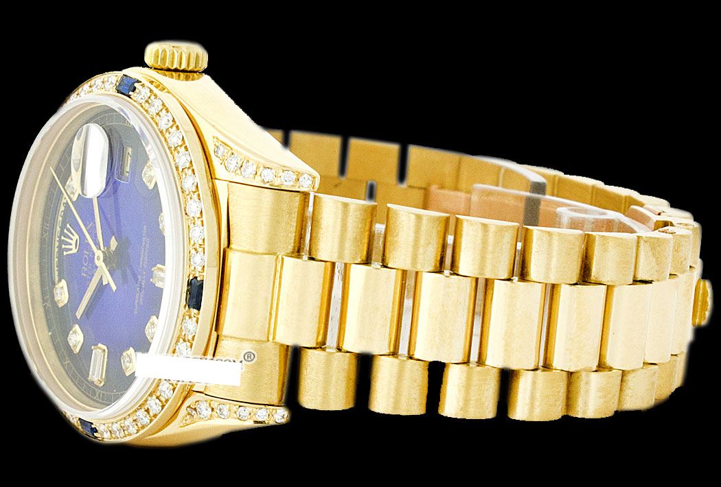 WATCH DETAILS: ITEM:     WatchBRAND:     RolexTYPE:     PresidentFEATURE:     QuickSetMODEL:     DateJustMADE:     Swiss MadeGENDER:     Men'sCONDITION:     Pre-OwnedFUNCTION:     Day & DateDIAL COLOR:     BlueHOUR MARKERS:     10 Round Custom Made DiamondBEZEL TYPE:     Custom Made Diamond & Sapphire BezelBEZEL STONE:     Diamond 1 CTW G-VVS1  & Ceylon Blue SapphireBEZEL MATERIAL:     18K GoldBRACELET TYPE:     PresidentBRACELET MATERIAL:     18K GoldCLASP TYPE:     Hidden ClaspCLASP MATERIAL:     18K GoldCASE STONE:     .85 CTW G-VVS1 DIAMOND CUSTOMCASE SIZE:     36mmCRYSTAL:      Scratch Resistance Sapphire CrystalMOVEMENT:     Automatic (Self Winding)CALIBER:     3055CROWN TYPE:     Screw Down CrownWATER RESISTANCE:     Waterproof to 10 ATM/100 meters/330 feetMODEL #:     18038SKU #:     AMPPQS57We Buy/Sell/Trade Valuable watches, Please call us