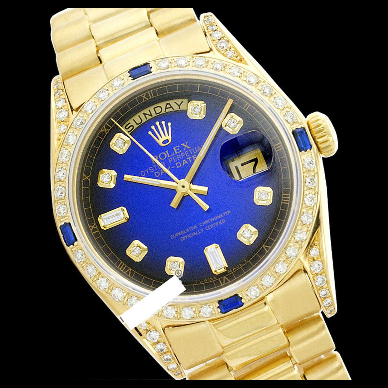 WATCH DETAILS: ITEM: WatchBRAND: RolexTYPE: PresidentFEATURE: QuickSetMODEL: DateJustMADE: Swiss MadeGENDER: Men'sCONDITION: Pre-OwnedFUNCTION: Day & DateDIAL COLOR: BlueHOUR MARKERS: 10 Round Custom Made DiamondBEZEL TYPE: Custom Made Diamond & Sapphire BezelBEZEL STONE: Diamond 1 CTW G-VVS1 & Ceylon Blue SapphireBEZEL MATERIAL: 18K GoldBRACELET TYPE: PresidentBRACELET MATERIAL: 18K GoldCLASP TYPE: Hidden ClaspCLASP MATERIAL: 18K GoldCASE STONE: .85 CTW G-VVS1 DIAMOND CUSTOMCASE SIZE: 36mmCRYSTAL: Scratch Resistance Sapphire CrystalMOVEMENT: Automatic (Self Winding)CALIBER: 3055CROWN TYPE: Screw Down CrownWATER RESISTANCE: Waterproof to 10 ATM/100 meters/330 feetMODEL #: 18038SKU #: AMPPQS94We Buy/Sell/Trade Valuable watches, Please call us