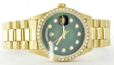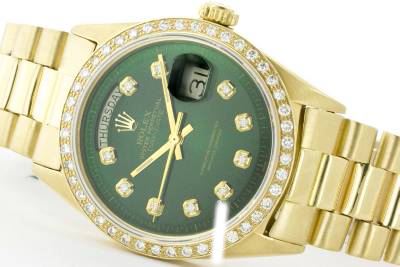 WATCH DETAILS: ITEM: WatchBRAND: RolexTYPE: PresidentFEATURE: QuickSetMODEL: DateJustMADE: Swiss MadeGENDER: Men'sCONDITION: Pre-OwnedFUNCTION: Day & DateDIAL COLOR: GreenHOUR MARKERS: 10 Round Custom Made DiamondBEZEL TYPE: Custom Made Diamond BezelBEZEL STONE: Diamond 1.14 CTW G-VVS1 BEZEL MATERIAL: 18K GoldBRACELET TYPE: PresidentBRACELET MATERIAL: 18K GoldCLASP TYPE: Hidden ClaspCLASP MATERIAL: 18K GoldCASE STONE: CASE SIZE: 36mmCRYSTAL: Scratch Resistance Sapphire CrystalMOVEMENT: Automatic (Self Winding)CALIBER: 3055CROWN TYPE: Screw Down CrownWATER RESISTANCE: Waterproof to 10 ATM/100 meters/330 feetMODEL #: 18038SKU #: AMPPQS198We Buy/Sell/Trade Valuable watches, Please call us