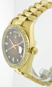 WATCH DETAILS: ITEM: WatchBRAND: RolexTYPE: PresidentFEATURE: QuickSetMODEL: DateJustMADE: Swiss MadeGENDER: Men'sCONDITION: Pre-OwnedFUNCTION: Day & DateDIAL COLOR: Brown Vignette HOUR MARKERS: 8 + 2 , 8 Round and 2 Baguette Custom Made DiamondBEZEL TYPE: Custom Made Diamond BezelBEZEL STONE: Diamond 1.14 CTW G-VVS1 BEZEL MATERIAL: 18K GoldBRACELET TYPE: PresidentBRACELET MATERIAL: 18K GoldCLASP TYPE: Hidden ClaspCLASP MATERIAL: 18K GoldCASE STONE: CASE SIZE: 36mmCRYSTAL: Scratch Resistance Sapphire CrystalMOVEMENT: Automatic (Self Winding)CALIBER: 3055CROWN TYPE: Screw Down CrownWATER RESISTANCE: Waterproof to 10 ATM/100 meters/330 feetMODEL #: 18038SKU #: AMPPQS197We Buy/Sell/Trade Valuable watches, Please call us