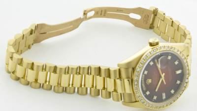 WATCH DETAILS: ITEM: WatchBRAND: RolexTYPE: PresidentFEATURE: QuickSetMODEL: DateJustMADE: Swiss MadeGENDER: Men'sCONDITION: Pre-OwnedFUNCTION: Day & DateDIAL COLOR: Brown Vignette HOUR MARKERS: 8 + 2 , 8 Round and 2 Baguette Custom Made DiamondBEZEL TYPE: Custom Made Diamond BezelBEZEL STONE: Diamond 1.14 CTW G-VVS1 BEZEL MATERIAL: 18K GoldBRACELET TYPE: PresidentBRACELET MATERIAL: 18K GoldCLASP TYPE: Hidden ClaspCLASP MATERIAL: 18K GoldCASE STONE: CASE SIZE: 36mmCRYSTAL: Scratch Resistance Sapphire CrystalMOVEMENT: Automatic (Self Winding)CALIBER: 3055CROWN TYPE: Screw Down CrownWATER RESISTANCE: Waterproof to 10 ATM/100 meters/330 feetMODEL #: 18038SKU #: AMPPQS197We Buy/Sell/Trade Valuable watches, Please call us