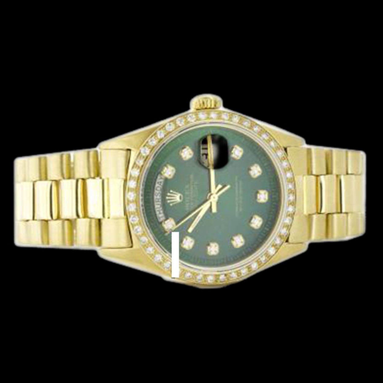 WATCH DETAILS: ITEM: WatchBRAND: RolexTYPE: PresidentFEATURE: QuickSetMODEL: DateJustMADE: Swiss MadeGENDER: Men'sCONDITION: Pre-OwnedFUNCTION: Day & DateDIAL COLOR: GreenHOUR MARKERS: 10 Round Custom Made DiamondBEZEL TYPE: Custom Made Diamond BezelBEZEL STONE: Diamond 1.14 CTW G-VVS1 BEZEL MATERIAL: 18K GoldBRACELET TYPE: PresidentBRACELET MATERIAL: 18K GoldCLASP TYPE: Hidden ClaspCLASP MATERIAL: 18K GoldCASE STONE: CASE SIZE: 36mmCRYSTAL: Scratch Resistance Sapphire CrystalMOVEMENT: Automatic (Self Winding)CALIBER: 3055CROWN TYPE: Screw Down CrownWATER RESISTANCE: Waterproof to 10 ATM/100 meters/330 feetMODEL #: 18038SKU #: AMPPQS198We Buy/Sell/Trade Valuable watches, Please call us
