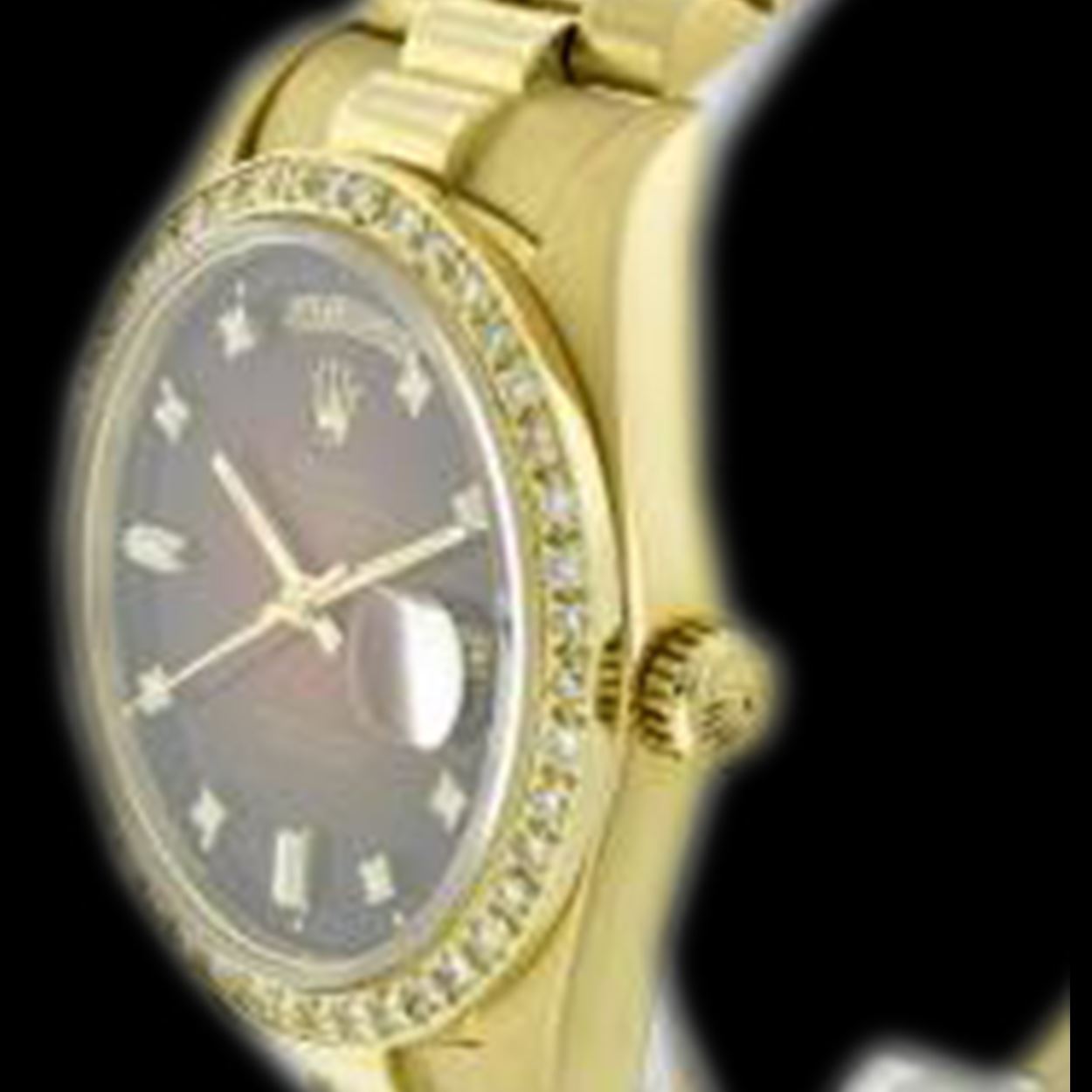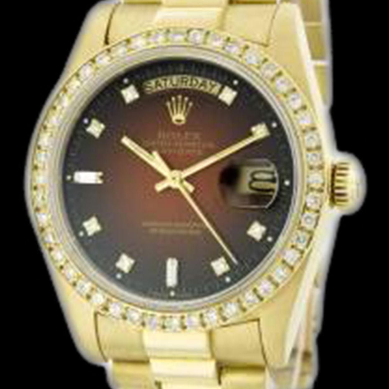 WATCH DETAILS: ITEM: WatchBRAND: RolexTYPE: PresidentFEATURE: QuickSetMODEL: DateJustMADE: Swiss MadeGENDER: Men'sCONDITION: Pre-OwnedFUNCTION: Day & DateDIAL COLOR: Brown Vignette HOUR MARKERS: 8 + 2 , 8 Round and 2 Baguette Custom Made DiamondBEZEL TYPE: Custom Made Diamond BezelBEZEL STONE: Diamond 1.14 CTW G-VVS1 BEZEL MATERIAL: 18K GoldBRACELET TYPE: PresidentBRACELET MATERIAL: 18K GoldCLASP TYPE: Hidden ClaspCLASP MATERIAL: 18K GoldCASE STONE: CASE SIZE: 36mmCRYSTAL: Scratch Resistance Sapphire CrystalMOVEMENT: Automatic (Self Winding)CALIBER: 3055CROWN TYPE: Screw Down CrownWATER RESISTANCE: Waterproof to 10 ATM/100 meters/330 feetMODEL #: 18038SKU #: AMPPQS197We Buy/Sell/Trade Valuable watches, Please call us