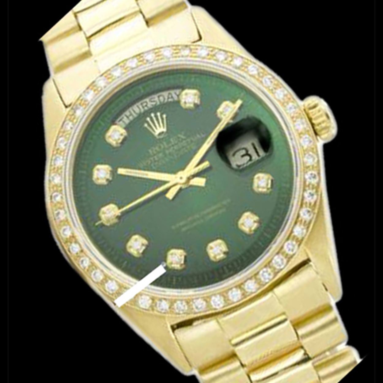 WATCH DETAILS: ITEM: WatchBRAND: RolexTYPE: PresidentFEATURE: QuickSetMODEL: DateJustMADE: Swiss MadeGENDER: Men'sCONDITION: Pre-OwnedFUNCTION: Day & DateDIAL COLOR: GreenHOUR MARKERS: 10 Round Custom Made DiamondBEZEL TYPE: Custom Made Diamond BezelBEZEL STONE: Diamond 1.14 CTW G-VVS1 BEZEL MATERIAL: 18K GoldBRACELET TYPE: PresidentBRACELET MATERIAL: 18K GoldCLASP TYPE: Hidden ClaspCLASP MATERIAL: 18K GoldCASE STONE: CASE SIZE: 36mmCRYSTAL: Scratch Resistance Sapphire CrystalMOVEMENT: Automatic (Self Winding)CALIBER: 3055CROWN TYPE: Screw Down CrownWATER RESISTANCE: Waterproof to 10 ATM/100 meters/330 feetMODEL #: 18038SKU #: AMPPQS198We Buy/Sell/Trade Valuable watches, Please call us