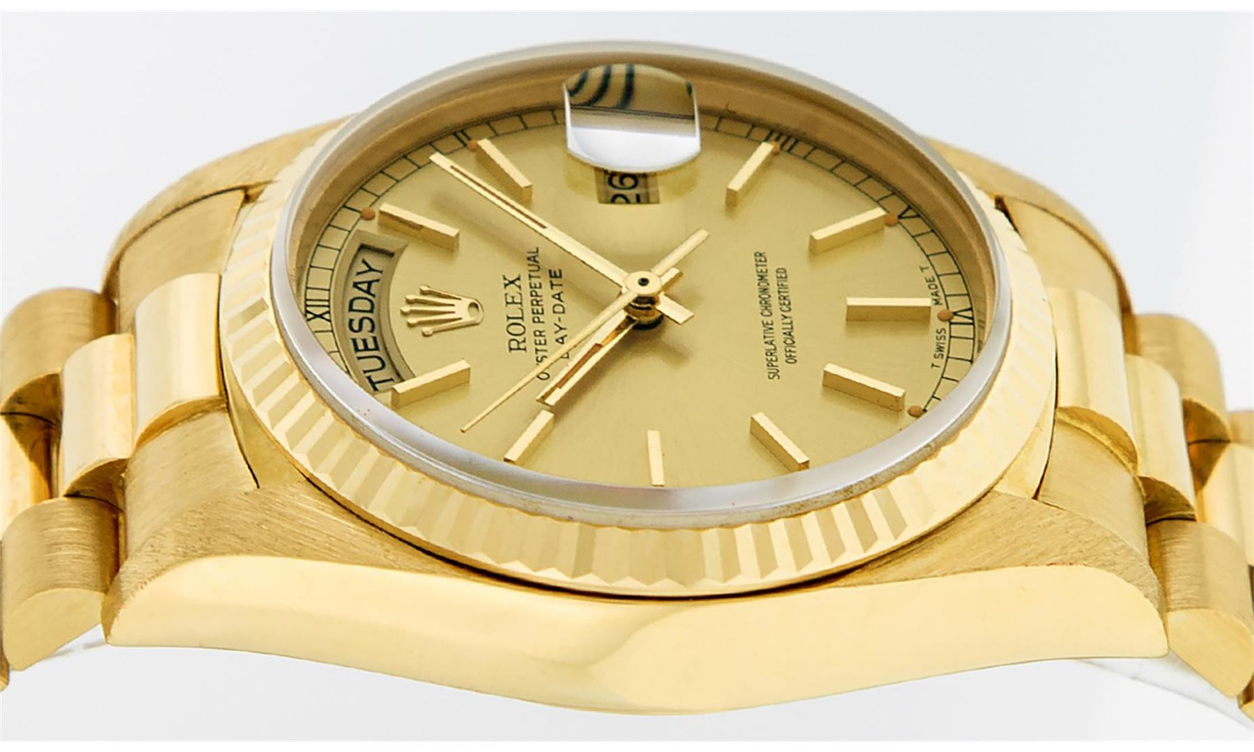 One Men's Pre Owned Quickset Rolex Day Date 18K Yellow Gold President Polished, Serviced & Electronically Tested, Rolex 18K Yellow Gold Case: 36mm, Rolex 18K Yellow Gold Crown, Rolex Bezel: 18K Yellow Gold Fluted Bezel. Custom Crystal: New Scratch Resistant Synthetic Sapphire Cyclops Lens. Rolex Movement: Automatic Quickset Winding Movement Caliber 3055. Rolex Dial: Champagne Index With Roman Track & Lumi Dots. Date Window: 3 O'clock Position, Day Display: 12 O'clock Position, Single Quickset, Model: Day Date President. Condition: G-6 Extra Fine. Rolex Bracelet: 18K Yellow Gold President Band With Hidden Clasp, Bright & Satin Polish. 7.0 Inch Length, Standard President Clasp, With Rolex Logo.