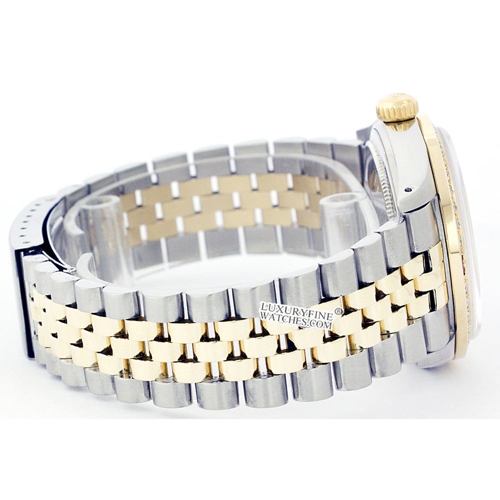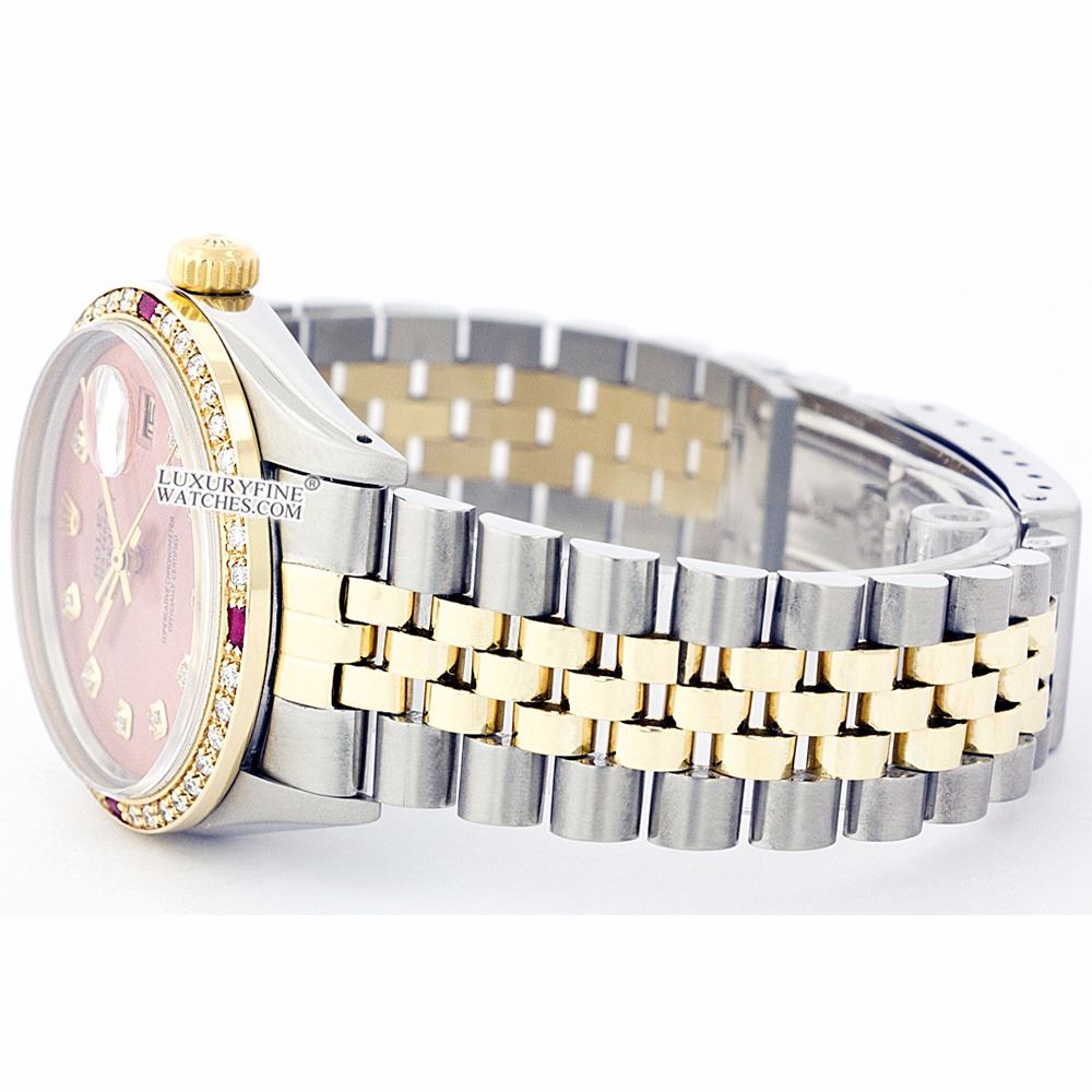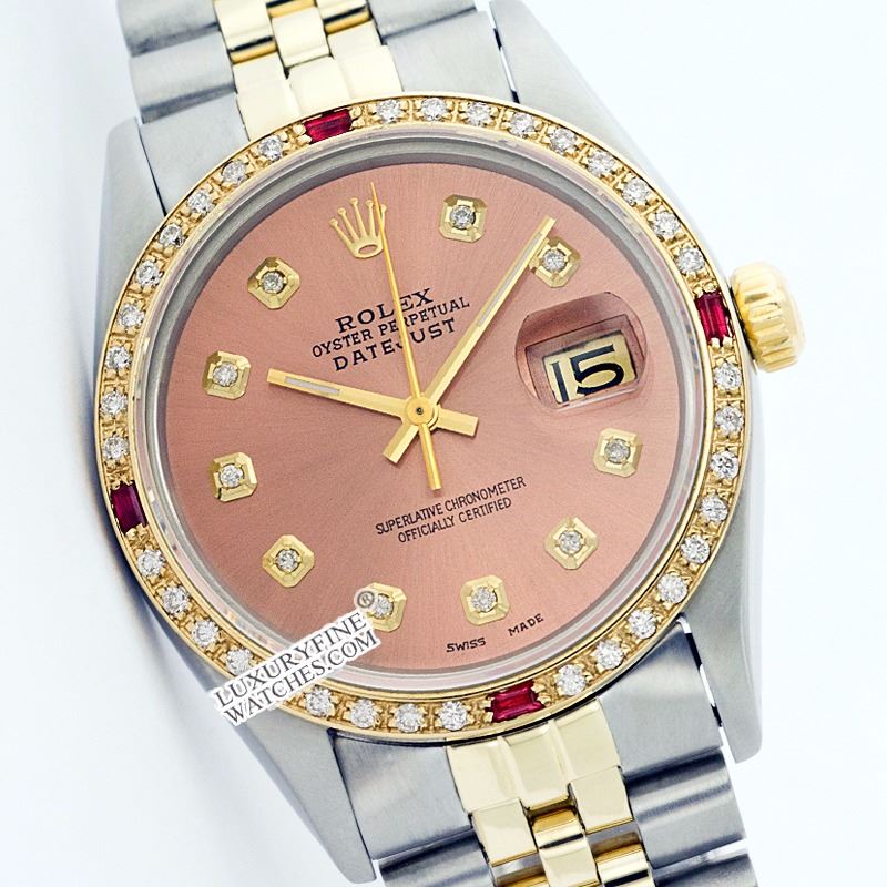 WATCH DETAILS: ITEM: WatchBRAND: RolexTYPE: Two ToneFEATURE: QuickSetMODEL: DateJustMADE: Swiss MadeGENDER: Men'sCONDITION: Pre-OwnedFUNCTION: DateDIAL COLOR: PeachHOUR MARKERS: 10 Round DiamondBEZEL TYPE: Diamond & Ruby BezelBEZEL STONE: Diamond G-VVS1 & 4 Burmise RubyBEZEL MATERIAL: 18K GoldBRACELET TYPE: Jubilee BRACELET MATERIAL: 14K Yellow Gold & Stainless SteelCLASP TYPE: Folding ClaspCLASP MATERIAL: Stainless SteelCASE STONE: CASE SIZE: 36mmCRYSTAL: Scratch Resistance Sapphire CrystalMOVEMENT: Automatic (Self Winding)CALIBER: 3035CROWN TYPE: Screw Down CrownWATER RESISTANCE: Waterproof to 10 ATM/100 meters/330 feetMODEL #: 16013SKU #: AMTJQS110We Buy/Sell/Trade Valuable watches, Please call usNote: Presentational generic box included. This watch was professionally inspected and serviced prior to auction. We are not affiliated with Rolex USA, Inc.