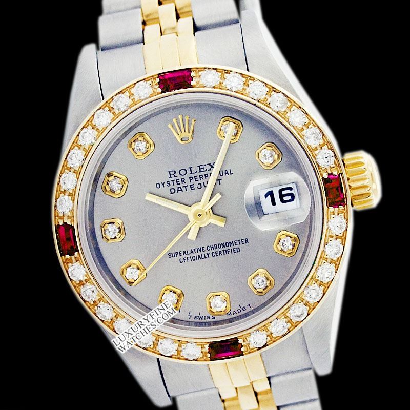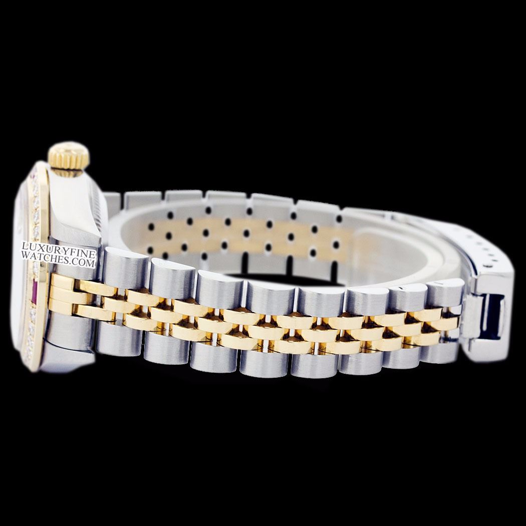 WATCH DETAILS: ITEM: WatchBRAND: RolexTYPE: Two ToneFEATURE: QuickSetMODEL: DateJustMADE: Swiss MadeGENDER: Men'sCONDITION: Pre-OwnedFUNCTION: DateDIAL COLOR: SilverHOUR MARKERS: 10 Round DiamondBEZEL TYPE: Diamond & Ruby BezelBEZEL STONE: Diamond G-VVS1 & 4 Burmise RubyBEZEL MATERIAL: 18K GoldBRACELET TYPE: Jubilee BRACELET MATERIAL: 14K Yellow Gold & Stainless SteelCLASP TYPE: Folding ClaspCLASP MATERIAL: Stainless SteelCASE STONE: CASE SIZE: 36mmCRYSTAL: Scratch Resistance Sapphire CrystalMOVEMENT: Automatic (Self Winding)CALIBER: 3035CROWN TYPE: Screw Down CrownWATER RESISTANCE: Waterproof to 10 ATM/100 meters/330 feetMODEL #: 16013SKU #: AMTJQS111We Buy/Sell/Trade Valuable watches, Please call usNote: Presentational generic box included. This watch was professionally inspected and serviced prior to auction. We are not affiliated with Rolex USA, Inc.