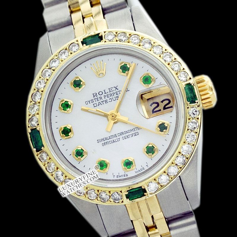 WATCH DETAILS: ITEM: WatchBRAND: RolexTYPE: Two ToneFEATURE: QuickSetMODEL: DateJustMADE: Swiss MadeGENDER: Men'sCONDITION: Pre-OwnedFUNCTION: DateDIAL COLOR: whiteHOUR MARKERS: 10 Round EmeraldBEZEL TYPE: Diamond & Emerald BezelBEZEL STONE: Diamond 1 CTW G-VVS1 & 4 Colombian EmeraldBEZEL MATERIAL: 18K GoldBRACELET TYPE: Jubilee BRACELET MATERIAL: 14K Yellow Gold & Stainless SteelCLASP TYPE: Folding ClaspCLASP MATERIAL: Stainless SteelCASE STONE: CASE SIZE: 36mmCRYSTAL: Scratch Resistance Sapphire CrystalMOVEMENT: Automatic (Self Winding)CALIBER: 3035CROWN TYPE: Screw Down CrownWATER RESISTANCE: Waterproof to 10 ATM/100 meters/330 feetMODEL #: 16013SKU #: AMTJQS173We Buy/Sell/Trade Valuable watches, Please call usNote: Presentational generic box included. This watch was professionally inspected and serviced prior to auction. We are not affiliated with Rolex USA, Inc.