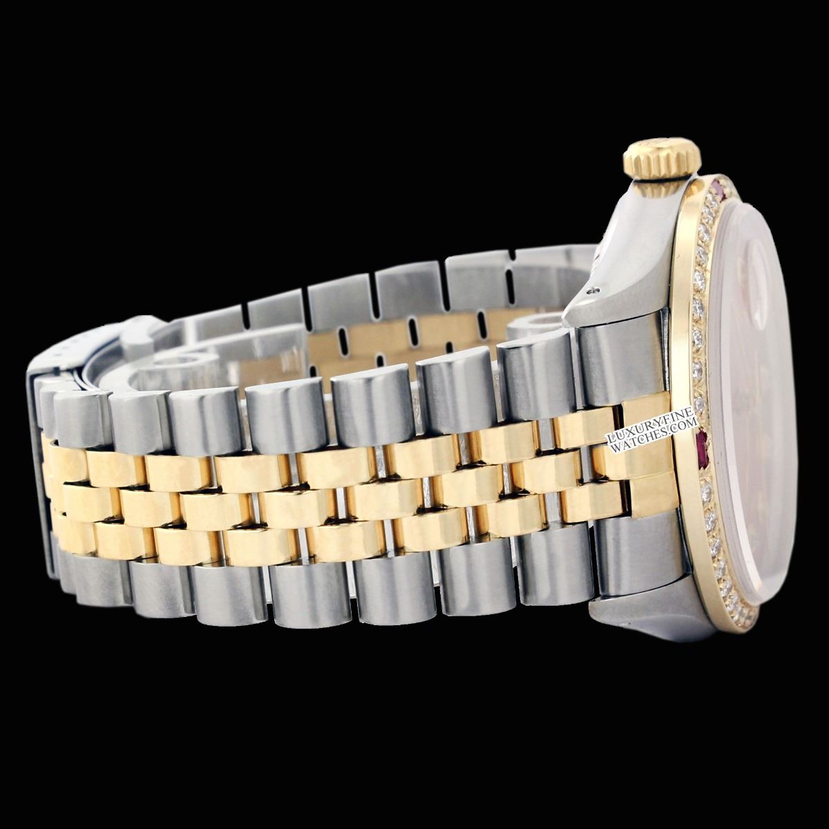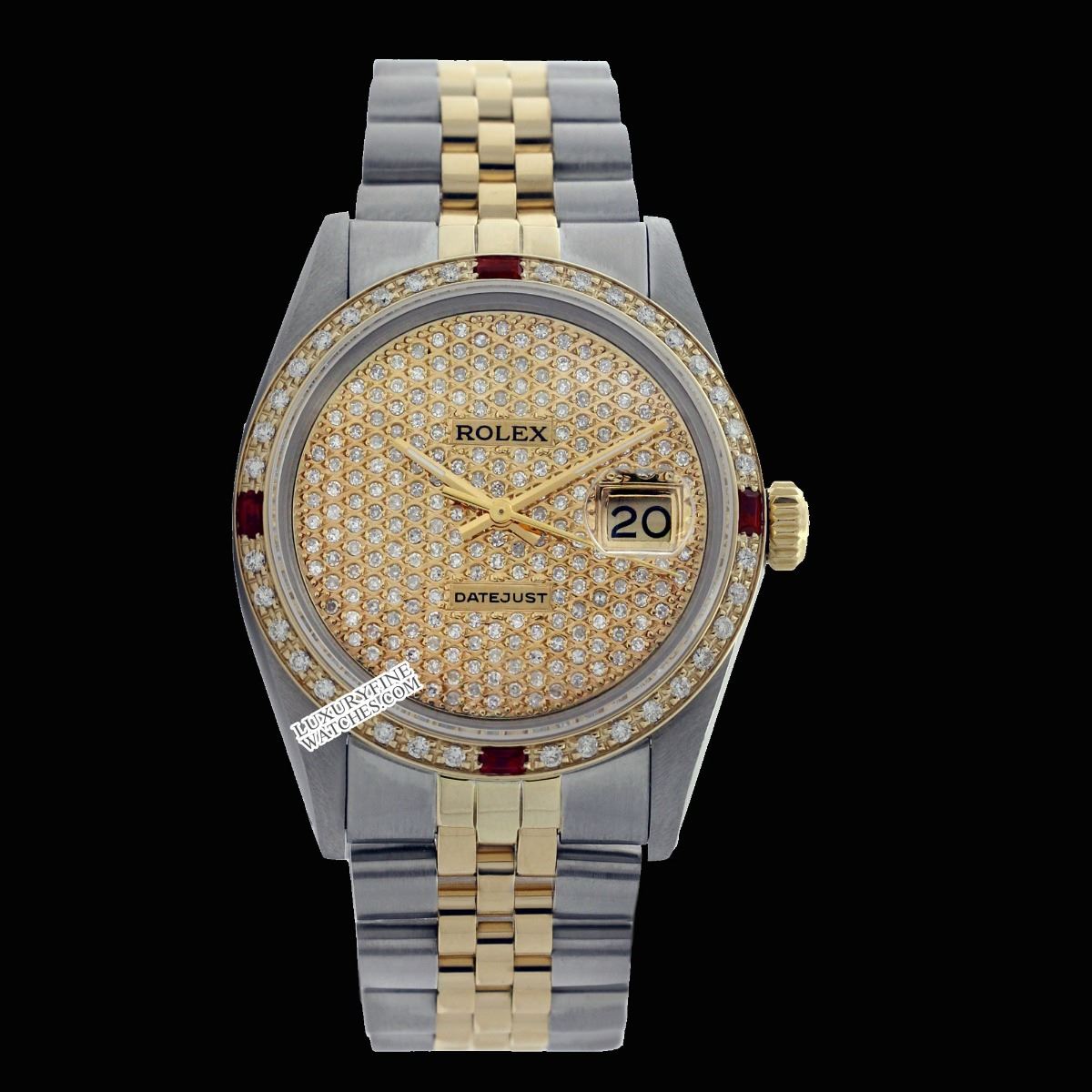 WATCH DETAILS: ITEM: WatchBRAND: RolexTYPE: Two ToneFEATURE: QuickSetMODEL: DateJustMADE: Swiss MadeGENDER: Men'sCONDITION: Pre-OwnedFUNCTION: DateDIAL COLOR: GoldHOUR MARKERS: Full Diamond PaveBEZEL TYPE: Diamond & Ruby BezelBEZEL STONE: Diamond G-VVS1 & 4 Burmise RubyBEZEL MATERIAL: 18K GoldBRACELET TYPE: Jubilee BRACELET MATERIAL: 14K Yellow Gold & Stainless SteelCLASP TYPE: Folding ClaspCLASP MATERIAL: Stainless SteelCASE STONE: CASE SIZE: 36mmCRYSTAL: Scratch Resistance Sapphire CrystalMOVEMENT: Automatic (Self Winding)CALIBER: 3035CROWN TYPE: Screw Down CrownWATER RESISTANCE: Waterproof to 10 ATM/100 meters/330 feetMODEL #: 16013SKU #: AMTJQS80We Buy/Sell/Trade Valuable watches, Please call usNote: Presentational generic box included. This watch was professionally inspected and serviced prior to auction. We are not affiliated with Rolex USA, Inc.