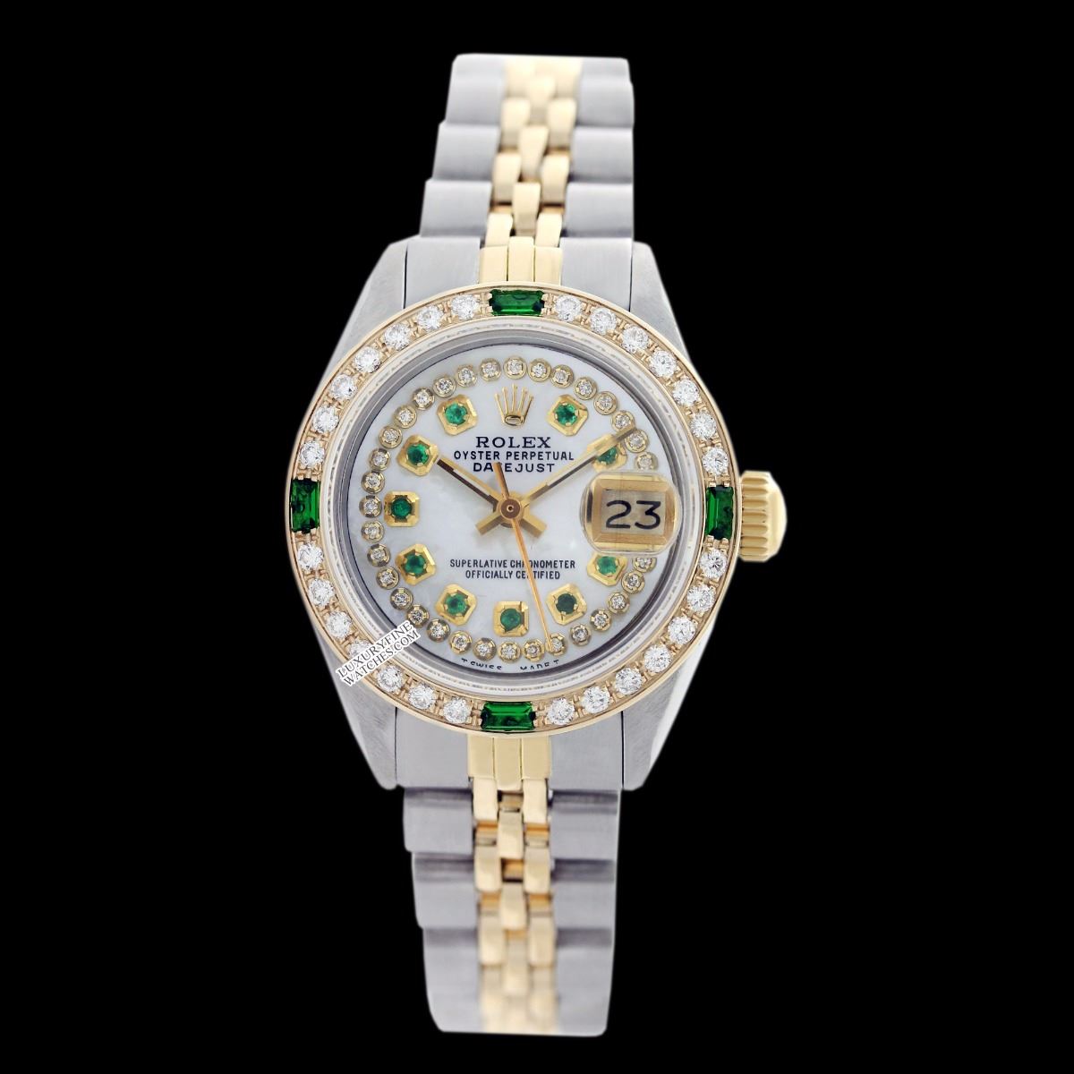 WATCH DETAILS: ITEM: WatchBRAND: RolexTYPE: Two ToneFEATURE: QuickSetMODEL: DateJustMADE: Swiss MadeGENDER: Men'sCONDITION: Pre-OwnedFUNCTION: DateDIAL COLOR: whiteHOUR MARKERS: String Diamond + 10 Round RubyBEZEL TYPE: Diamond & Emerald BezelBEZEL STONE: Diamond G-VVS1 & 4 Colombian EmeraldBEZEL MATERIAL: 18K GoldBRACELET TYPE: Jubilee BRACELET MATERIAL: 14K Yellow Gold & Stainless SteelCLASP TYPE: Folding ClaspCLASP MATERIAL: Stainless SteelCASE STONE: CASE SIZE: 36mmCRYSTAL: Scratch Resistance Sapphire CrystalMOVEMENT: Automatic (Self Winding)CALIBER: 3035CROWN TYPE: Screw Down CrownWATER RESISTANCE: Waterproof to 10 ATM/100 meters/330 feetMODEL #: 16013SKU #: AMTJQS83We Buy/Sell/Trade Valuable watches, Please call usNote: Presentational generic box included. This watch was professionally inspected and serviced prior to auction. We are not affiliated with Rolex USA, Inc.