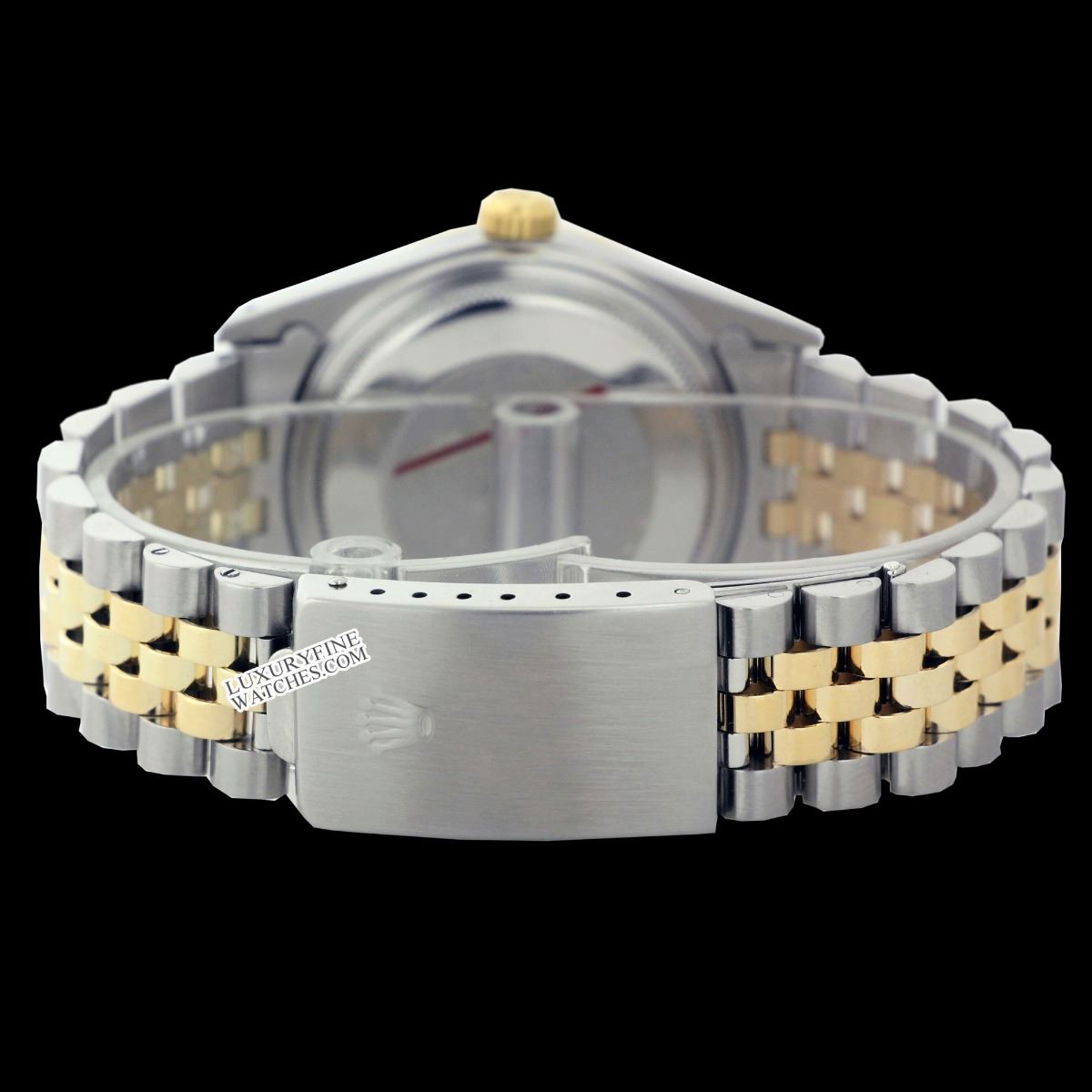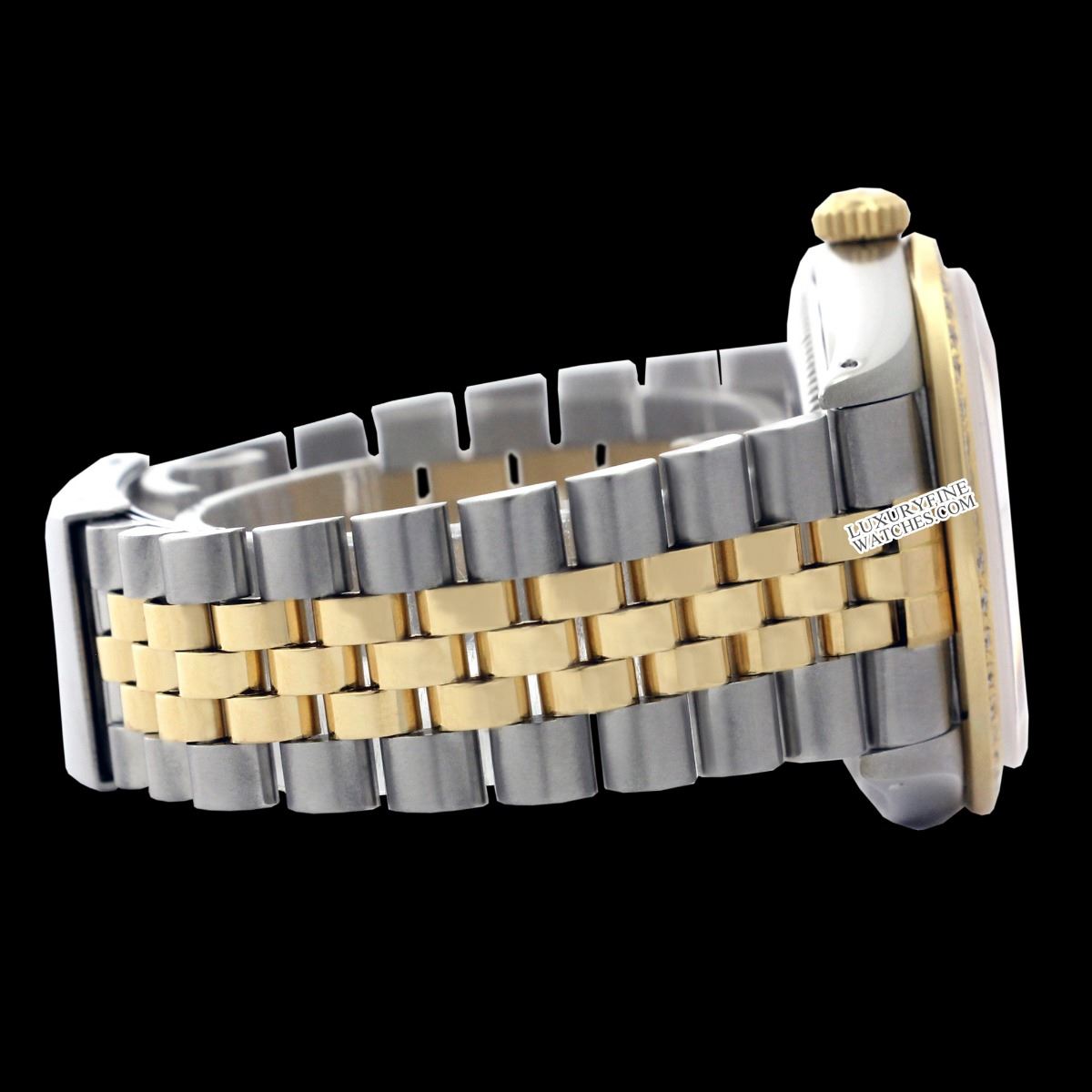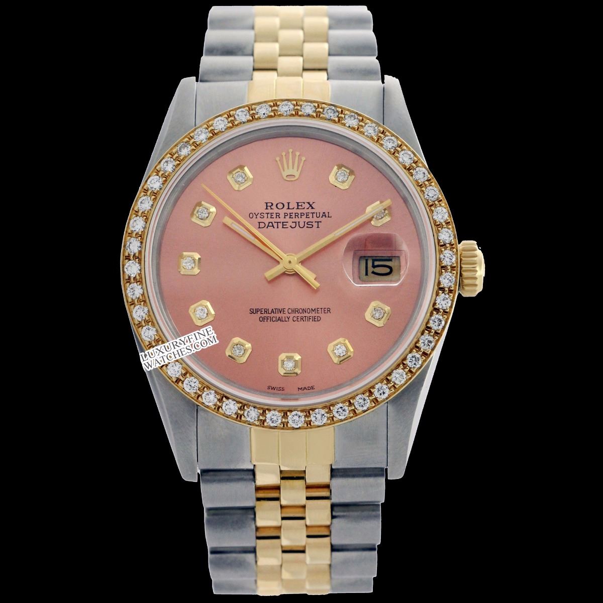 WATCH DETAILS: ITEM: WatchBRAND: RolexTYPE: Two ToneFEATURE: QuickSetMODEL: DateJustMADE: Swiss MadeGENDER: Men'sCONDITION: Pre-OwnedFUNCTION: DateDIAL COLOR: PinkHOUR MARKERS: 10 Round DiamondBEZEL TYPE: Diamond BezelBEZEL STONE: Diamond 1.14 CTW G-VVS1 BEZEL MATERIAL: 18K GoldBRACELET TYPE: Jubilee BRACELET MATERIAL: 14K Yellow Gold & Stainless SteelCLASP TYPE: Folding ClaspCLASP MATERIAL: Stainless SteelCASE STONE: CASE SIZE: 36mmCRYSTAL: Scratch Resistance Sapphire CrystalMOVEMENT: Automatic (Self Winding)CALIBER: 3035CROWN TYPE: Screw Down CrownWATER RESISTANCE: Waterproof to 10 ATM/100 meters/330 feetMODEL #: 16013SKU #: AMTJQS7We Buy/Sell/Trade Valuable watches, Please call usNote: Presentational generic box included. This watch was professionally inspected and serviced prior to auction. We are not affiliated with Rolex USA, Inc.