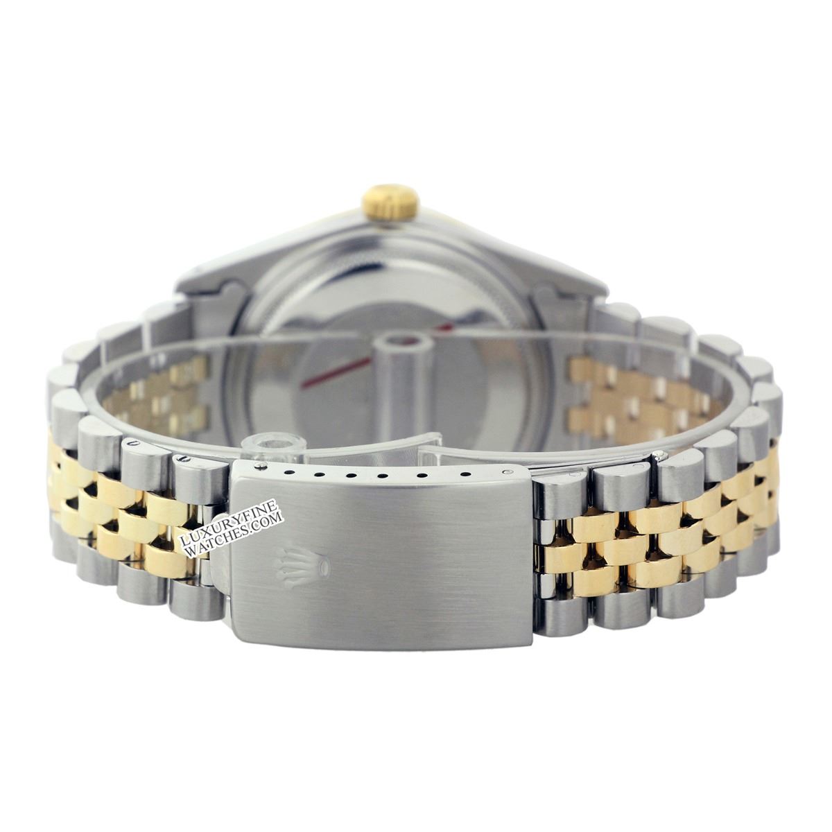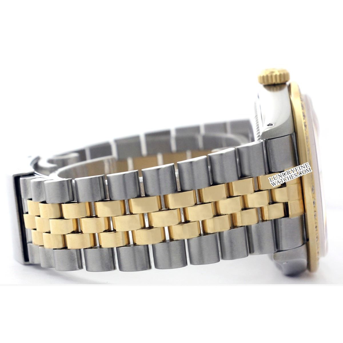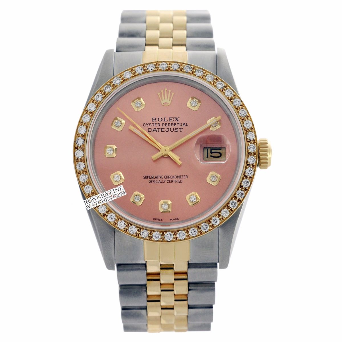 WATCH DETAILS: ITEM: WatchBRAND: RolexTYPE: Two ToneFEATURE: QuickSetMODEL: DateJustMADE: Swiss MadeGENDER: Men'sCONDITION: Pre-OwnedFUNCTION: DateDIAL COLOR: PinkHOUR MARKERS: 10 Round DiamondBEZEL TYPE: Diamond BezelBEZEL STONE: Diamond 1.14 CTW G-VVS1 BEZEL MATERIAL: 18K GoldBRACELET TYPE: Jubilee BRACELET MATERIAL: 14K Yellow Gold & Stainless SteelCLASP TYPE: Folding ClaspCLASP MATERIAL: Stainless SteelCASE STONE: CASE SIZE: 36mmCRYSTAL: Scratch Resistance Sapphire CrystalMOVEMENT: Automatic (Self Winding)CALIBER: 3035CROWN TYPE: Screw Down CrownWATER RESISTANCE: Waterproof to 10 ATM/100 meters/330 feetMODEL #: 16013SKU #: AMTJQS7We Buy/Sell/Trade Valuable watches, Please call usNote: Presentational generic box included. This watch was professionally inspected and serviced prior to auction. We are not affiliated with Rolex USA, Inc.